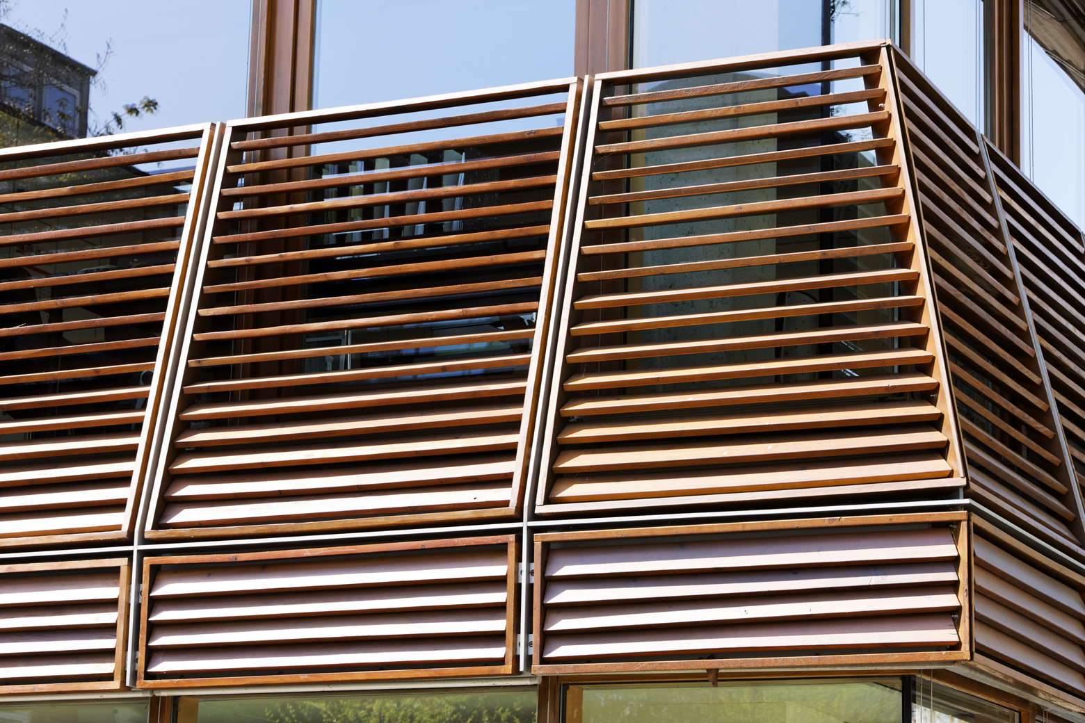 Die Holzinszenierung ist gänzlich frei von rustikalen Allüren, sie wirkt im Gegenteil sehr modern, und dennoch bodenständig und natürlich. Das warmtonige Lärchenholz bringt einen Hauch Natur in die Großstadtszenerie. Dazu passen die großen, alten Bäume an der Kaiserswerther Straße: Sie erzeugen ein lebendiges Licht-Schatten-Spiel auf den Fensterflächen und korrespondieren sehr schön mit den Holzkonstruktionen. Die kastenartigen Vorbauten verleihen den Gebäuden eine Körperlichkeit, die Geborgenheit vermittelt. Die Abfolge der Lamellen und ihre differenzierte Neigung erzeugen ein figürliches Wellenlinienmuster, das zusammen mit dem warmen Holzton eine spielerische Note einbringt.