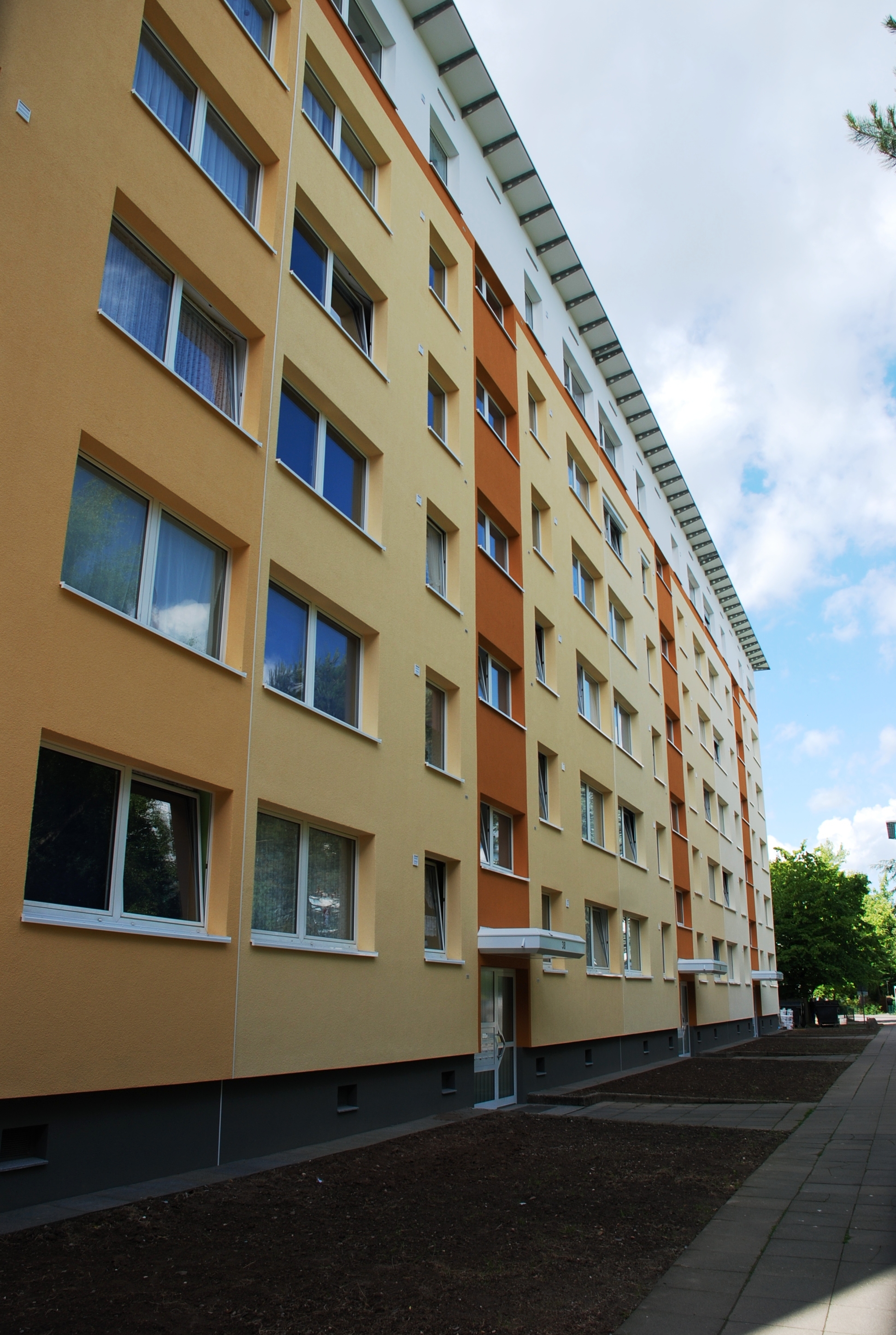 Was die ursprünglich vollständig fehlende Wärmedämmung für die Energiebilanz der Mehrgeschossgebäude bedeutete, lässt sich leicht erahnen: Dadurch, dass an den Häusern seit ihrer Errichtung kaum nennenswerte substanzverbessernde Modernisierungsmaßnahmen durchgeführt worden waren, erreichten die Wohnnebenkosten insbesondere während der Heizperiode eine Größenordnung, die in keinem vernünftigen Verhältnis zu den sonstigen Lebenshaltungskosten der Bewohner stand. Mit dem Capatect-Wärmedämm-Verbundsystem auf der Basis der bewährten Dalmatinerplatte konnte der Energiebedarf aller fünf Mehrgeschossgebäude um mehr als ein Viertel bis nahezu ein Drittel gesenkt werden. Bei den enorm gestiegenen Energiepreisen macht das für jeden Haushalt auf Dauer eine stattliche Ersparnis aus, die noch bemerkenswerter erscheint, wenn man an die Gesamtzahl von 208 Wohnungen denkt.