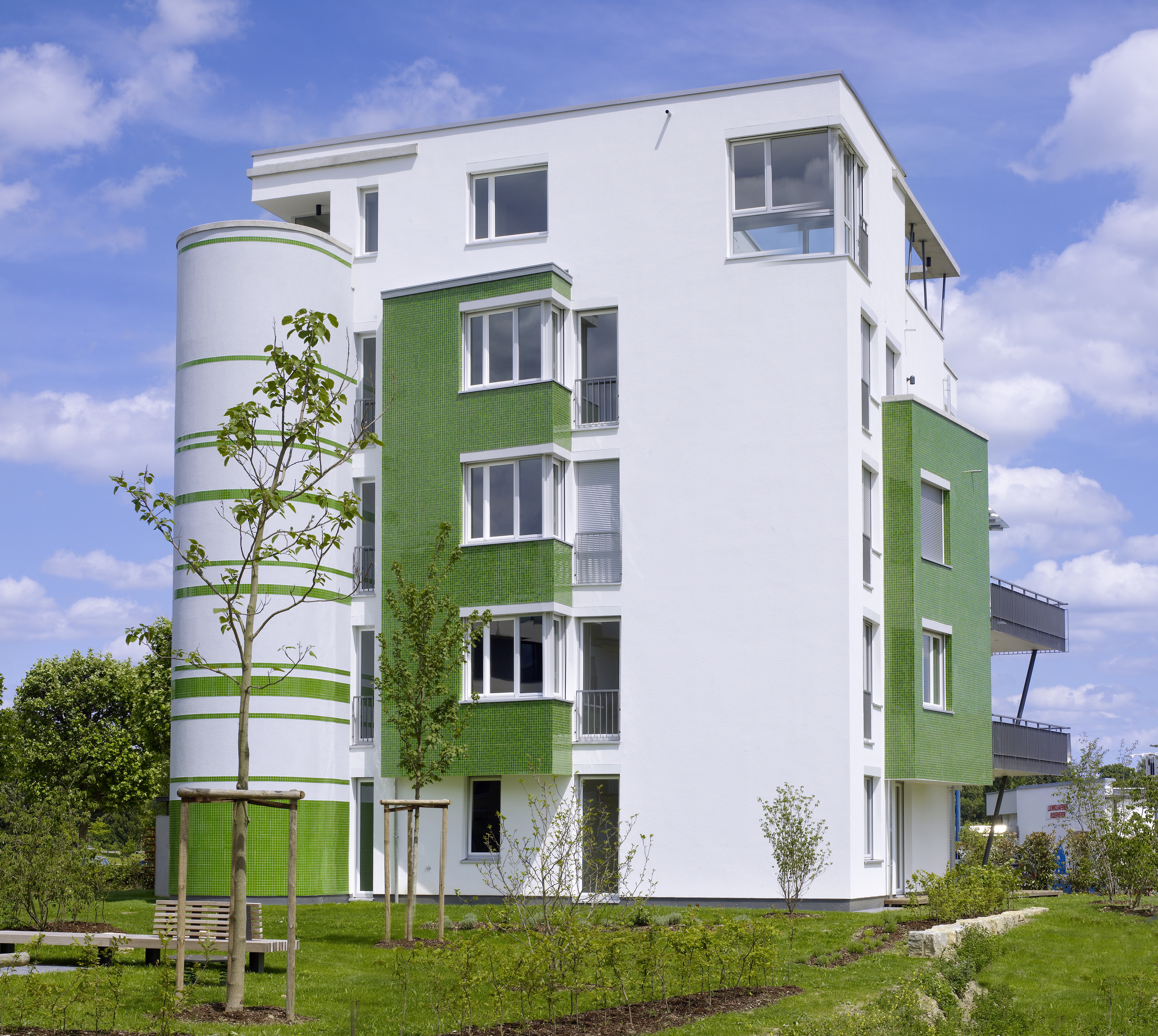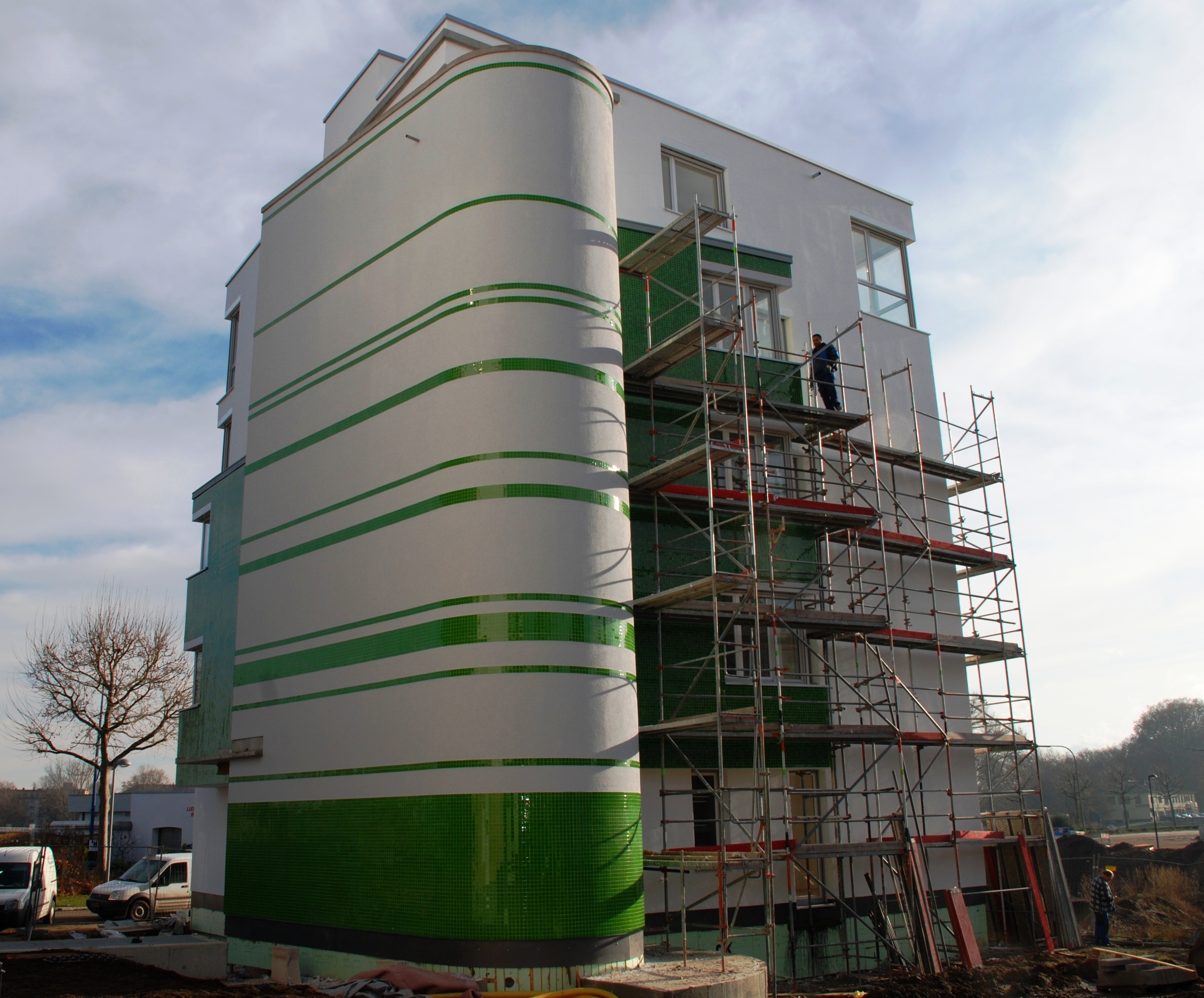 (pressebox) (Ober-Ramstadt, 21.10.2010) Zum Mannheimer Schloss auf Kurpfälzer Seite wurde in Ludwigshafen am Rhein vis-à-vis ein erfrischendes Kontrastprogramm geschaffen: Auf einem ehemaligen Industriegelände stehen seit 2009 drei avantgardistische Stadtvillen als architektonische Visitenkarte einer aufblühenden Stadt. Insbesondere die Fassaden, die ein Capatect-Wärmedämm-Verbundsystem vor Wind und Wetter schützt, sorgen durch eine sehenswerte Kombination von schneeweißem Putz mit grünem Glasmosaik nachhaltig für öffentliches Interesse.