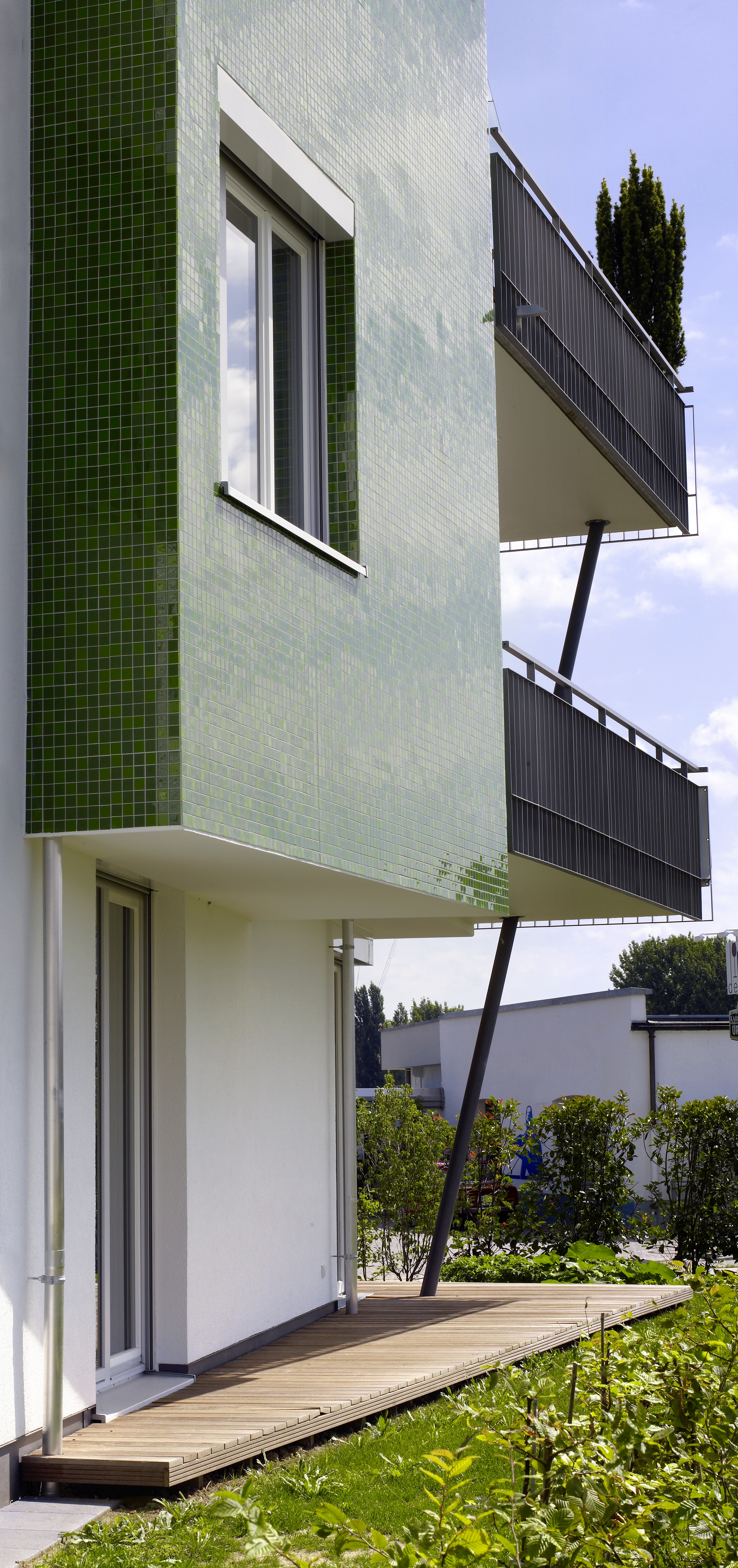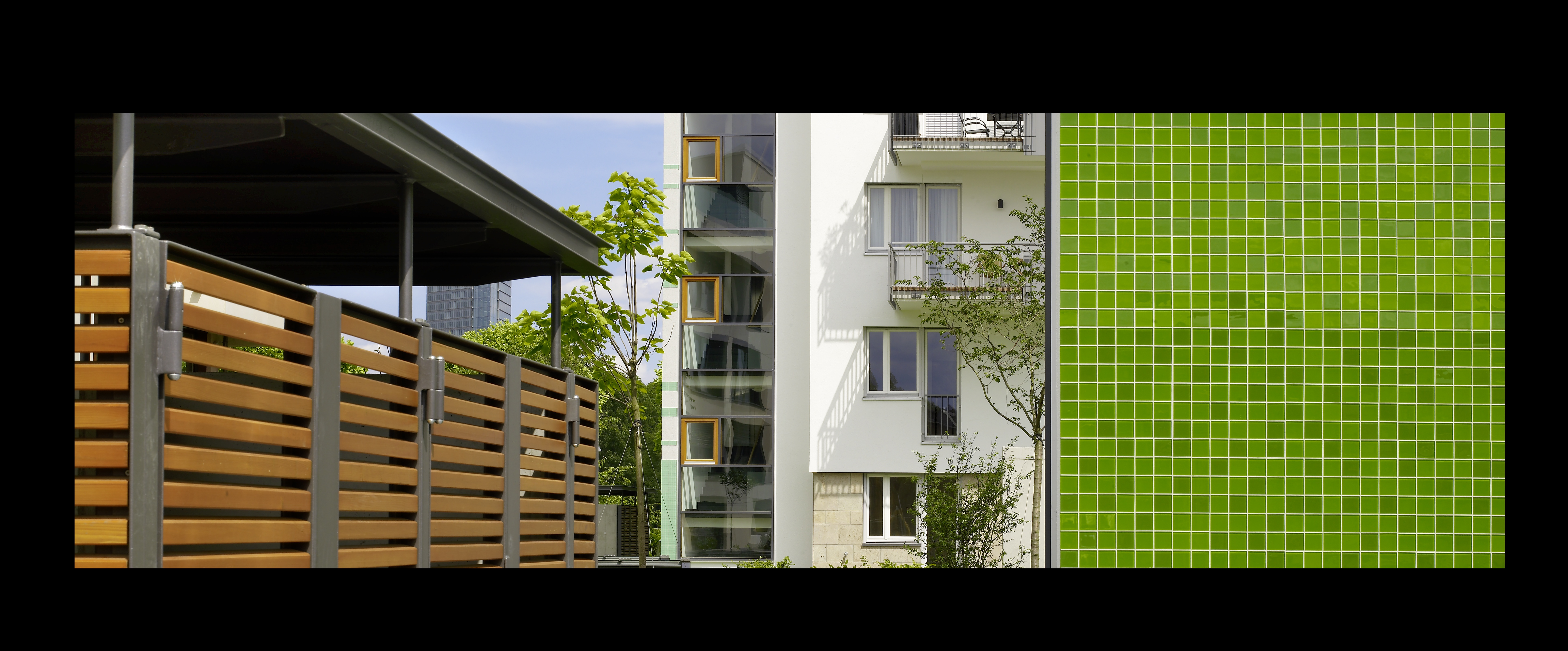Um die besondere optische Wirkung der Ornamente zu jeder Tageszeit zur Entfaltung kommen zu lassen, musste der ursprünglich dunkle Spezialkleber eigens auf die Materialerfordernisse des Glasmosaiks, des Untergrunds und des weiß verputzen Umfelds abgestimmt werden: "Die Wahl eines helleren Klebers sollte die Farbintensität verstärken. In enger Zusammenarbeit mit den WDVS-Spezialisten von Caparol in Ober-Ramstadt wurden sowohl die notwendigen materialtechnischen Voraussetzungen geschaffen als auch die formalen Bedingungen für den rechtskonformen Einsatz der Glasmosaike als Bestandteile einer fachgerecht gedämmten Kombinationsfassade erfüllt", berichtet Architekt Patrick Humpert, der die in verschiedenen Grüntönen changierenden Glasfliesen-Mosaike aus Südafrika in Ludwigshafen am Rhein gern noch großzügiger verwendet hätte.