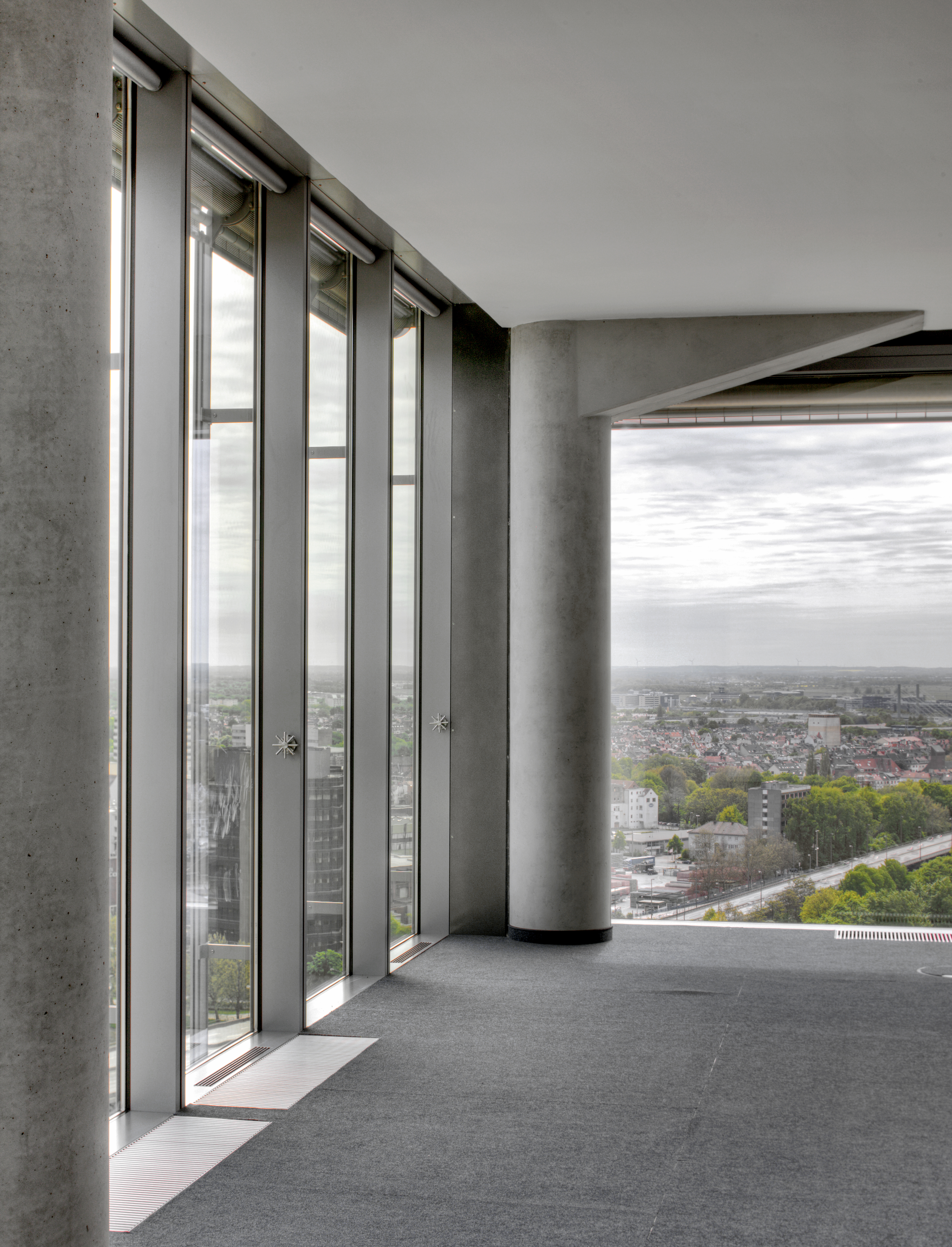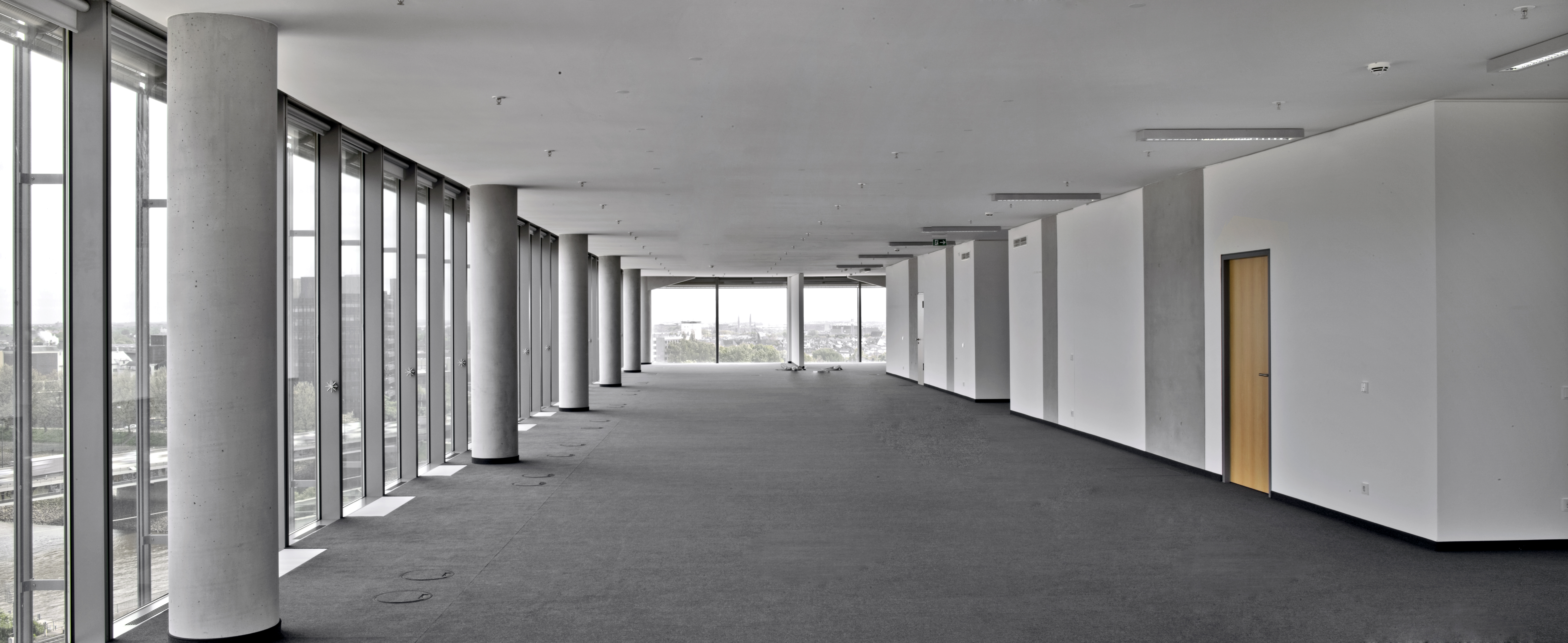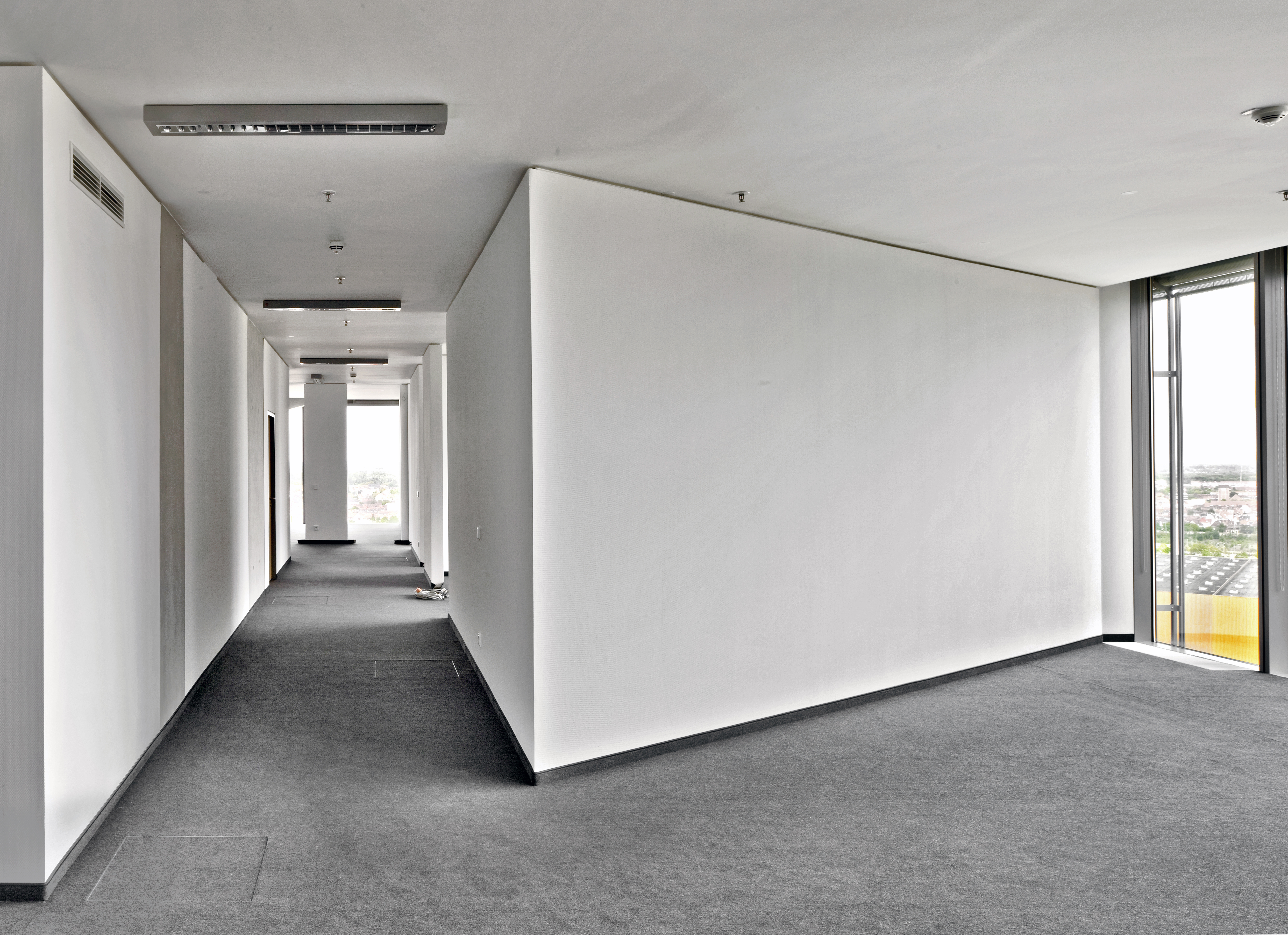 Genauso innovativ wie die Gebäudehülle und -technik sollte auch die Innengestaltung sein. Die Stockwerke sind unterschiedlich aufgeteilt, mal als Großraumbüro mit Betonsäulen, mal mit Trennwänden. Innen wirkt das Gebäude zurückhaltend edel. Sichtbetonwände und -säulen, raumhohe Glasfronten, kombiniert mit Edelstahlelementen sowie anthrazitfarbige Teppichböden in den Büroräumen bzw. dunkelgrauer Naturstein in der Empfangshalle, bestimmen das Bild. Eine in der Farbigkeit sehr reduzierte, materialhaftige Inszenierung, die sich auf Schwarz, Weiß und Grautöne beschränkt. Es stellte sich die Frage welcher Wandbelag zu einem solch beeindruckenden, anspruchsvollen und modernen Objekt passt? Aufgrund der Beanspruchung der Innenwände, der dekorativen Oberflächenoptik und der vielfältigen Gestaltungsmöglichkeiten fiel die Wahl auf Glasgewebe und Beschichtung. Die Projekt-Team, bestehend aus Vertretern von Bauherr, Architekt und der ECE als Projektsteuerer entschieden sich nach einer umfangreichen Bemusterung für eine Ausführung mit dem Capaver-System von Caparol. Die gesamte Gebäudehülle ist aus Glas, warum also nicht Glas in Form von Glasfasergewebe an den Wänden? Ein weiteres Entscheidungskriterium, das für Glasgewebe spricht, ist die Nachhaltigkeit in Bezug auf die Renovierungsintervalle. Gestalterisch besticht das Glasgewebe nicht nur durch seine ansprechende Strukturierung, sondern auch durch seine hohe Lichtreflexion und das moderne Erscheinungsbild, passend zur hochmodernen Einrichtung. Ungefähr 19.000 m2 Wand- und Deckenflächen wurden mit Capaver VB Glasgewebe Plus tapeziert, nachdem sie vollflächig mit Caparol Akkordspachtel egalisiert worden waren. Glasgewebe ist ein rein mineralisches Produkt: Die verwebten Glasfasern werden aus Quarzsanden, die in der Natur abgebaut werden, hergestellt.