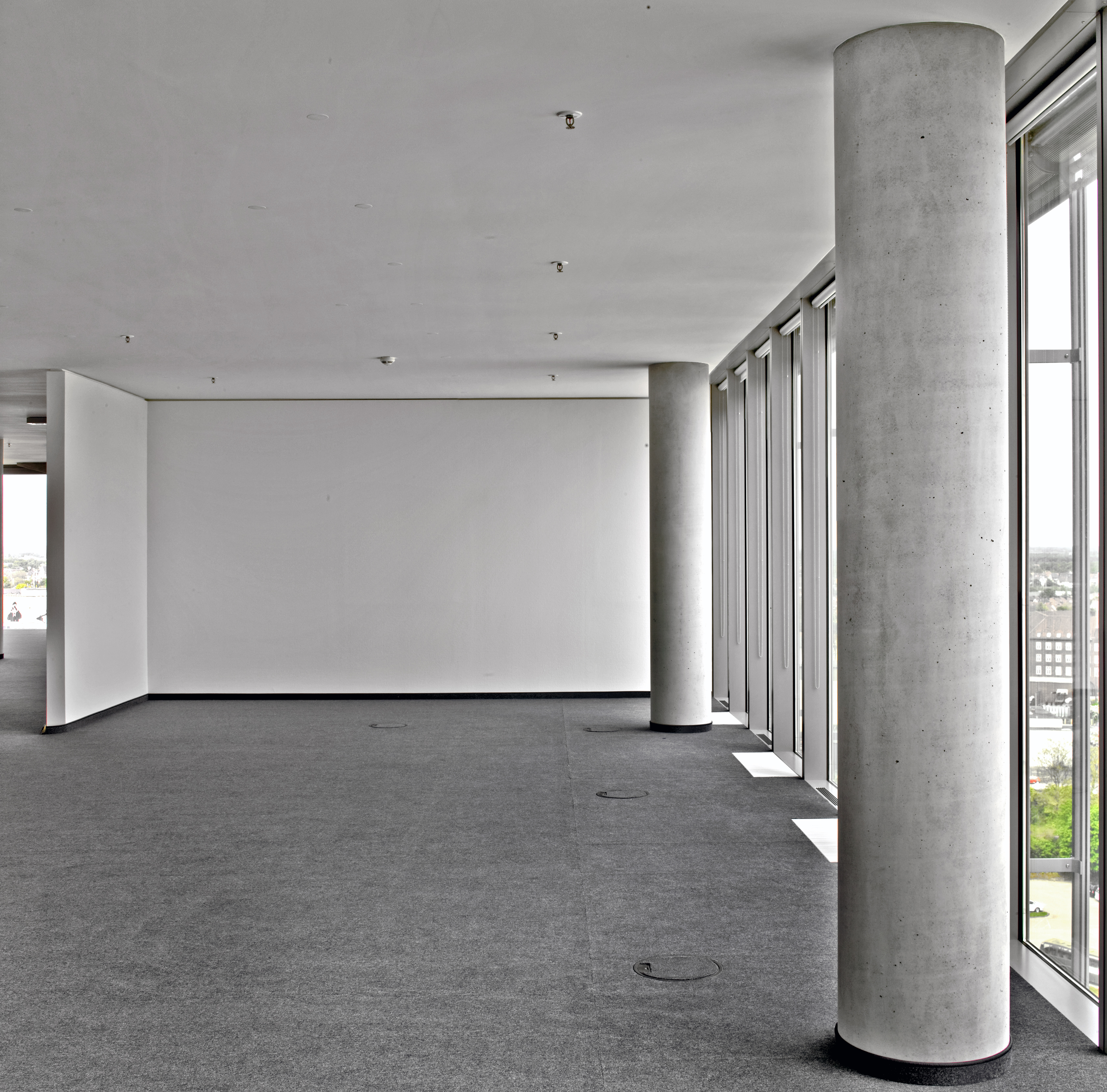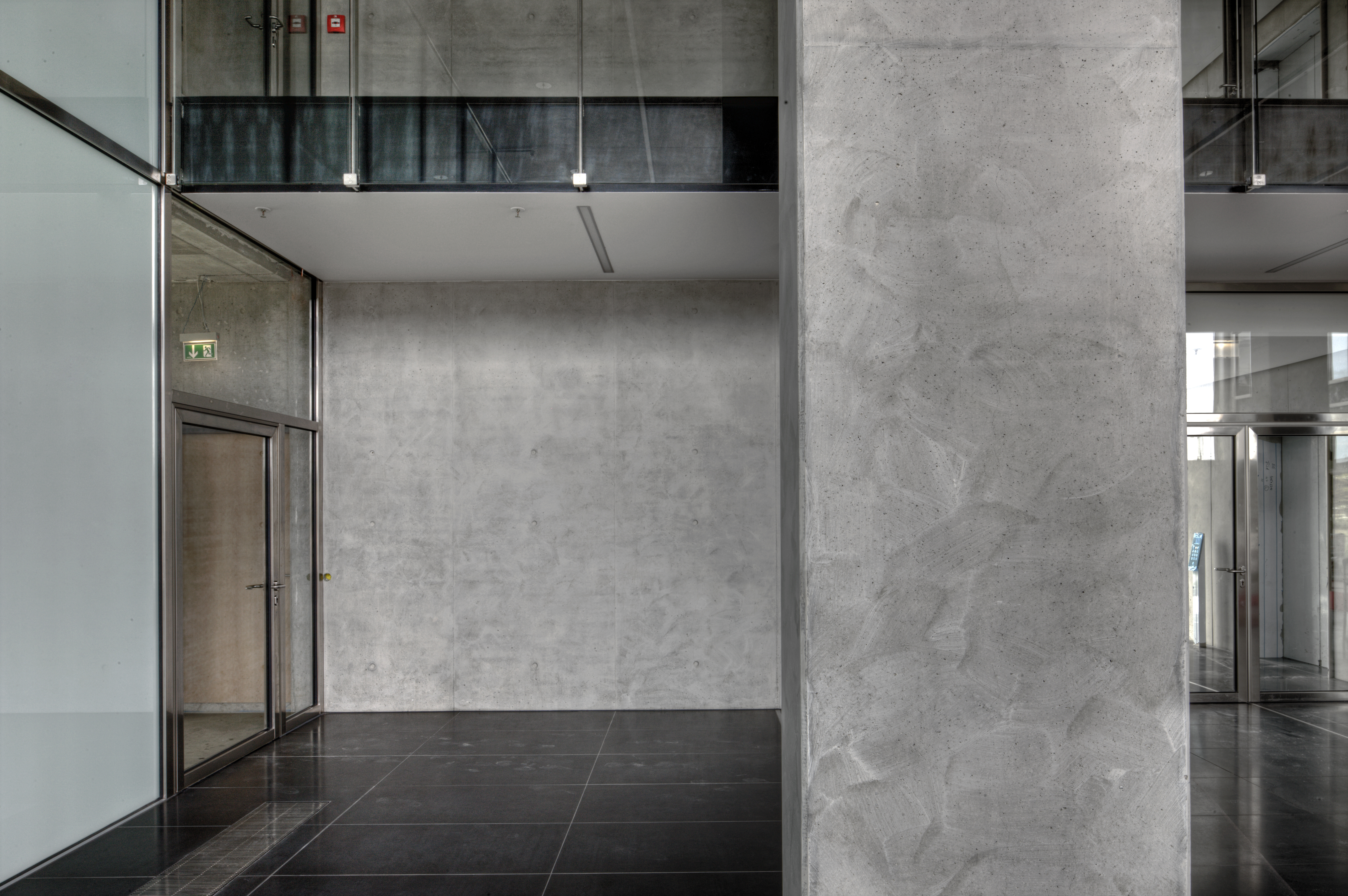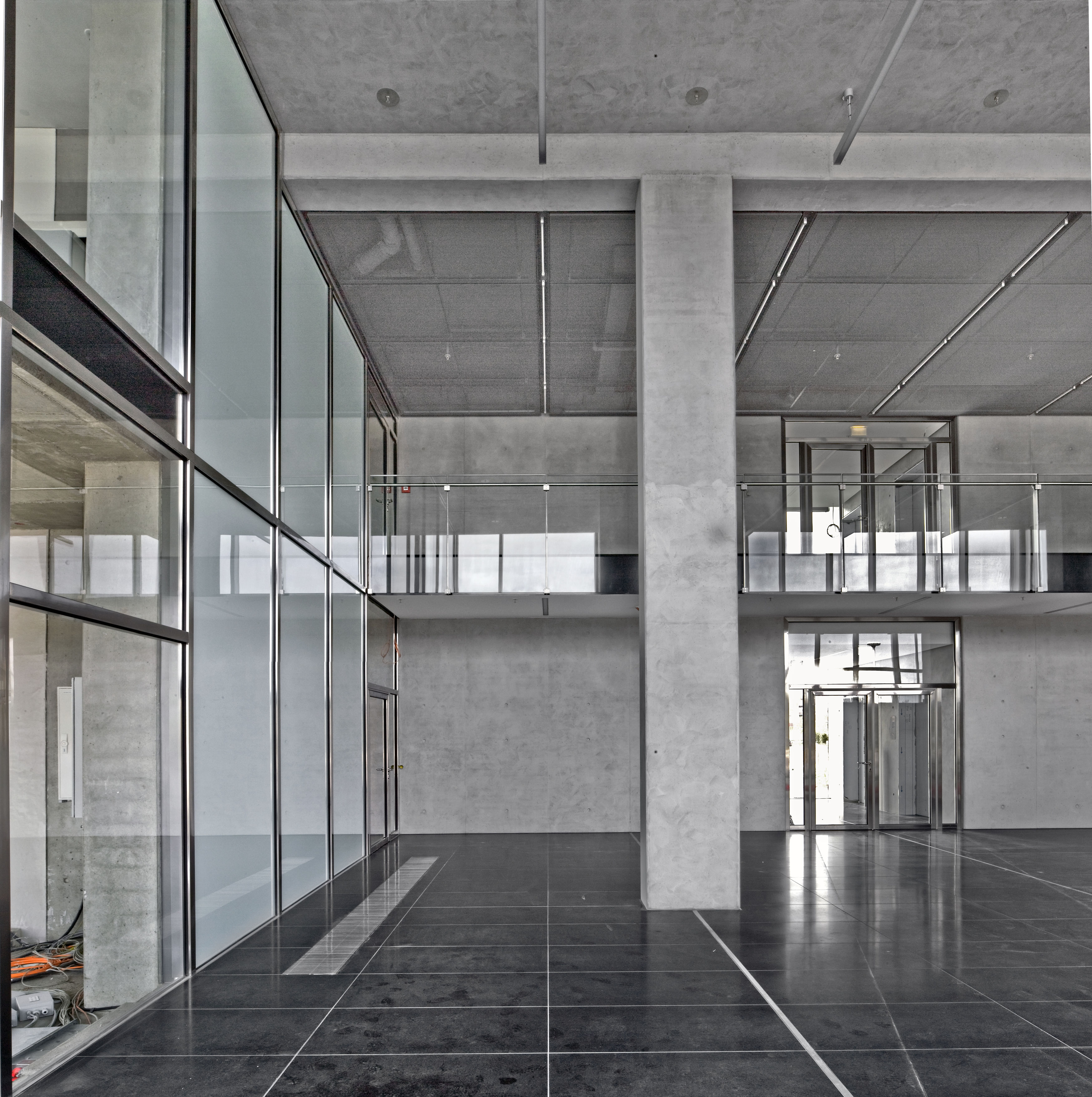 Genauso innovativ wie die Gebäudehülle und -technik sollte auch die Innengestaltung sein. Die Stockwerke sind unterschiedlich aufgeteilt, mal als Großraumbüro mit Betonsäulen, mal mit Trennwänden. Innen wirkt das Gebäude zurückhaltend edel. Sichtbetonwände und -säulen, raumhohe Glasfronten, kombiniert mit Edelstahlelementen sowie anthrazitfarbige Teppichböden in den Büroräumen bzw. dunkelgrauer Naturstein in der Empfangshalle, bestimmen das Bild. Eine in der Farbigkeit sehr reduzierte, materialhaftige Inszenierung, die sich auf Schwarz, Weiß und Grautöne beschränkt. Es stellte sich die Frage welcher Wandbelag zu einem solch beeindruckenden, anspruchsvollen und modernen Objekt passt? Aufgrund der Beanspruchung der Innenwände, der dekorativen Oberflächenoptik und der vielfältigen Gestaltungsmöglichkeiten fiel die Wahl auf Glasgewebe und Beschichtung. Die Projekt-Team, bestehend aus Vertretern von Bauherr, Architekt und der ECE als Projektsteuerer entschieden sich nach einer umfangreichen Bemusterung für eine Ausführung mit dem Capaver-System von Caparol. Die gesamte Gebäudehülle ist aus Glas, warum also nicht Glas in Form von Glasfasergewebe an den Wänden? Ein weiteres Entscheidungskriterium, das für Glasgewebe spricht, ist die Nachhaltigkeit in Bezug auf die Renovierungsintervalle. Gestalterisch besticht das Glasgewebe nicht nur durch seine ansprechende Strukturierung, sondern auch durch seine hohe Lichtreflexion und das moderne Erscheinungsbild, passend zur hochmodernen Einrichtung. Ungefähr 19.000 m2 Wand- und Deckenflächen wurden mit Capaver VB Glasgewebe Plus tapeziert, nachdem sie vollflächig mit Caparol Akkordspachtel egalisiert worden waren. Glasgewebe ist ein rein mineralisches Produkt: Die verwebten Glasfasern werden aus Quarzsanden, die in der Natur abgebaut werden, hergestellt.