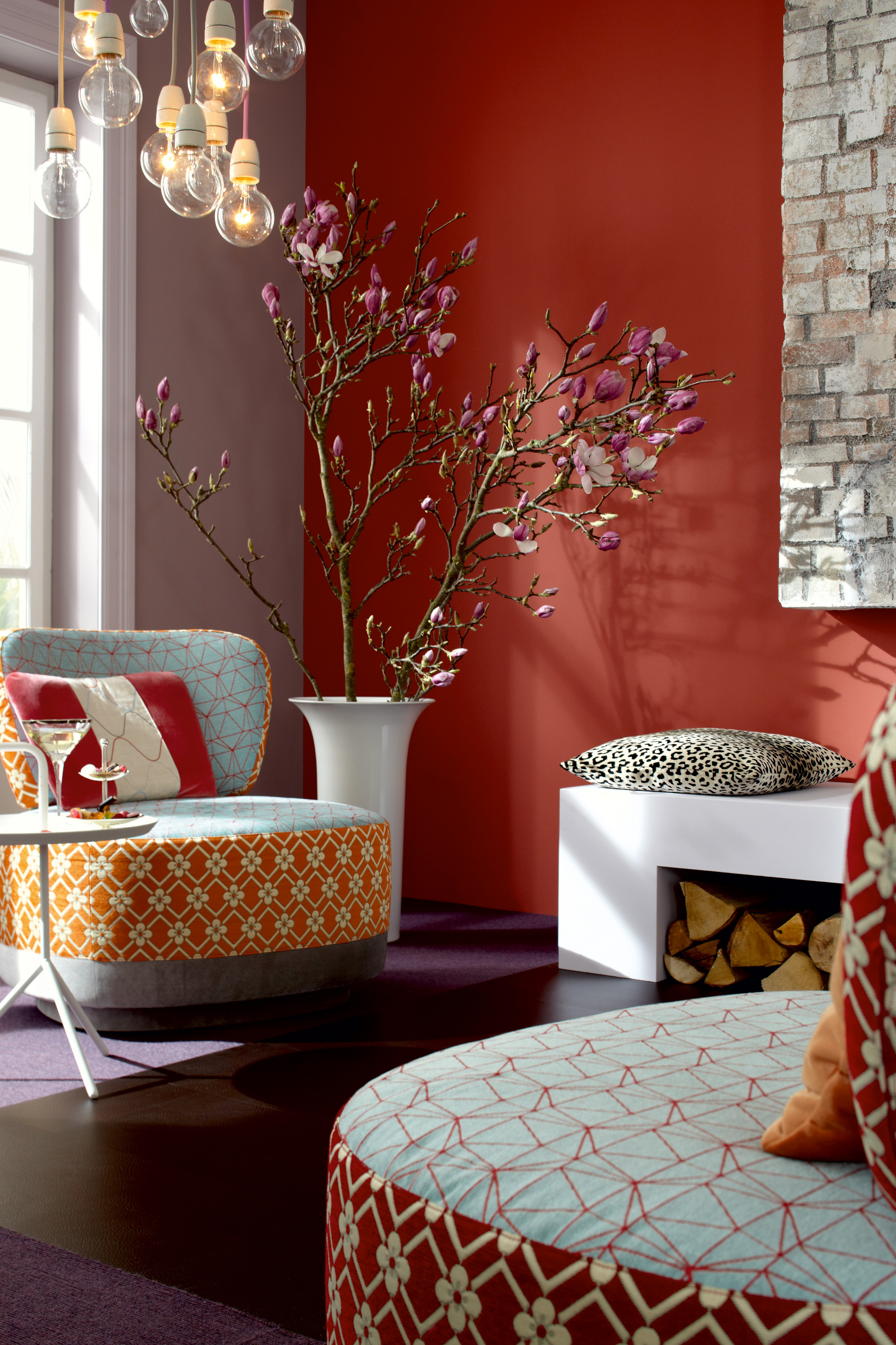 Ein warmer, aber auch extravaganter Stil prägt die aus Beerentönen, Ziegelrot und Beigenuancen bestehende Trendwelt „extraordinary“. Antikes und Rustikales verdeutlichen die Besinnung auf alte Werte, Tradition und Ursprünglichkeit. Hier entsteht Eleganz durch die stumpfmatte, ziegelrote Wand und ihres zurückhaltenden, violettgrauen Pendants, das den Ausgleich zur rustikal, patinierten Backsteinverblendung des Kamins bildet. Für den kräftig farbigen matten Wandanstrich eignet sich hervorragend Caparol-PremiumColor, Foto: Caparol Farben Lacke Bautenschutz/tretford