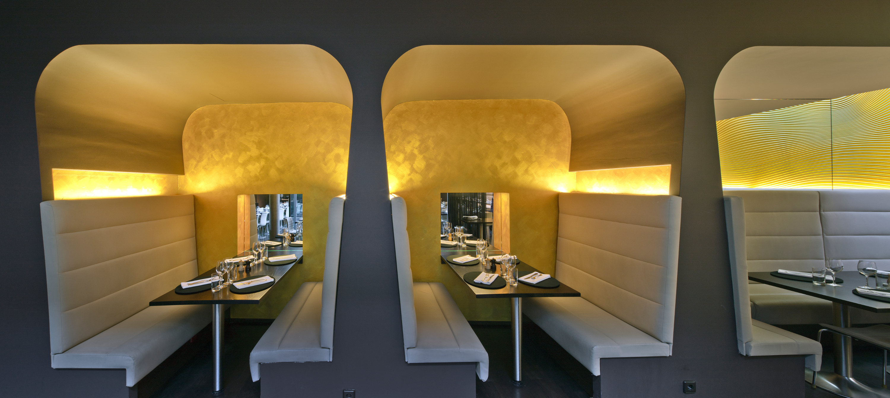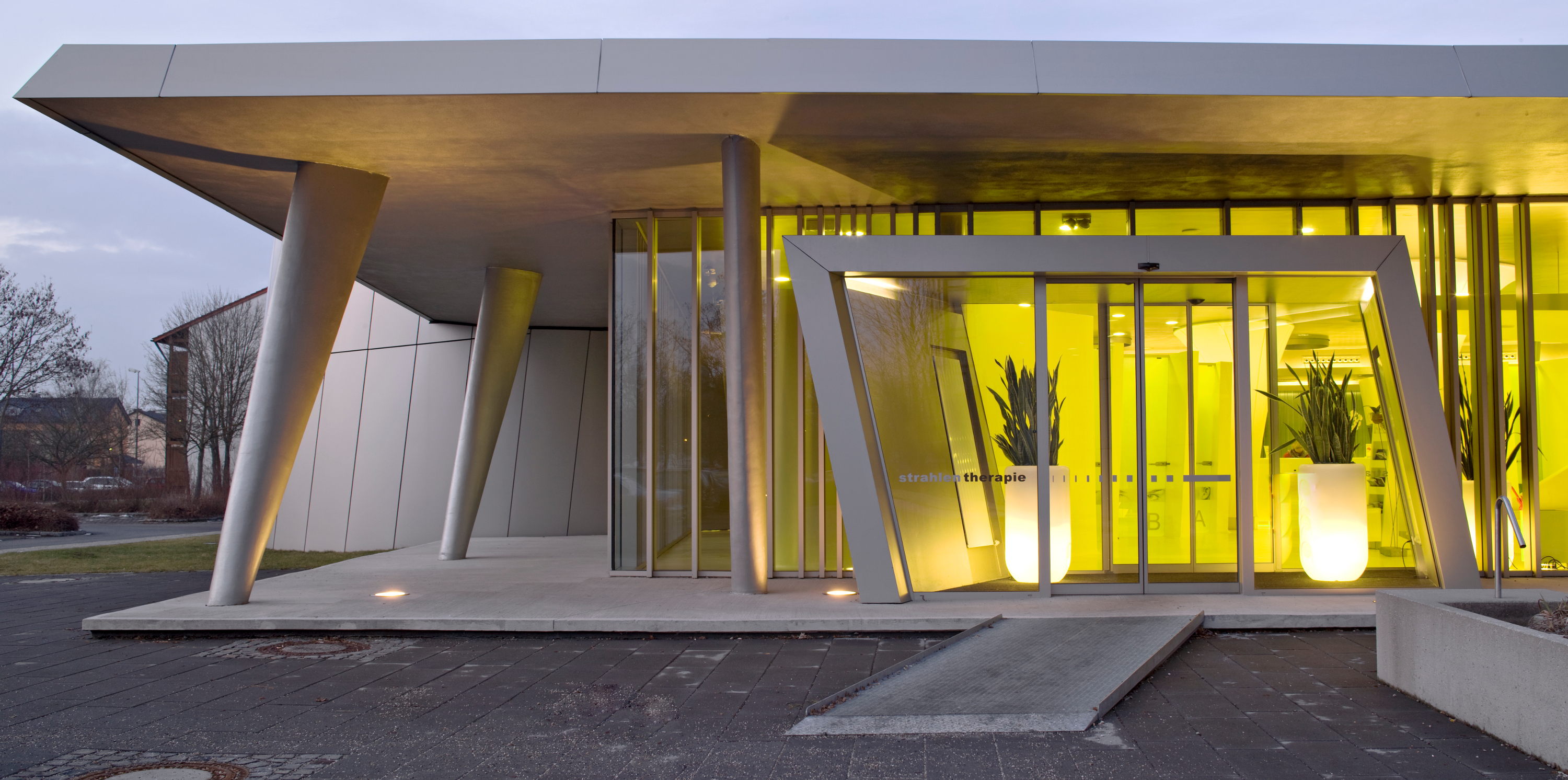 Besonders eindrucksvoll wirkt die Inszenierung von Farbe mit Licht in der Dämmerung oder Dunkelheit. Einblicke von außen begeistern und ziehen die Blicke an, wie ausgewählte Referenzobjekte von Caparol zeigen. So wird die gewagte Farbsymphonie aus roten und purpurfarbenen Flächen in einem Treppenhaus im Kocherquartier in Schwäbisch Hall durch die Beleuchtung zu einem echten Erlebnis. Indirektes Licht lässt eine mit der Effektbeschichtung CapaGold gestaltete Wand in einem Restaurant in Luxemburg edel und wertig anmuten. Und in der Radiologiepraxis in Altötting erstrahlen die in ein intensives Gelb getauchten Räume durch die Beleuchtung warm und vertrauenserweckend.