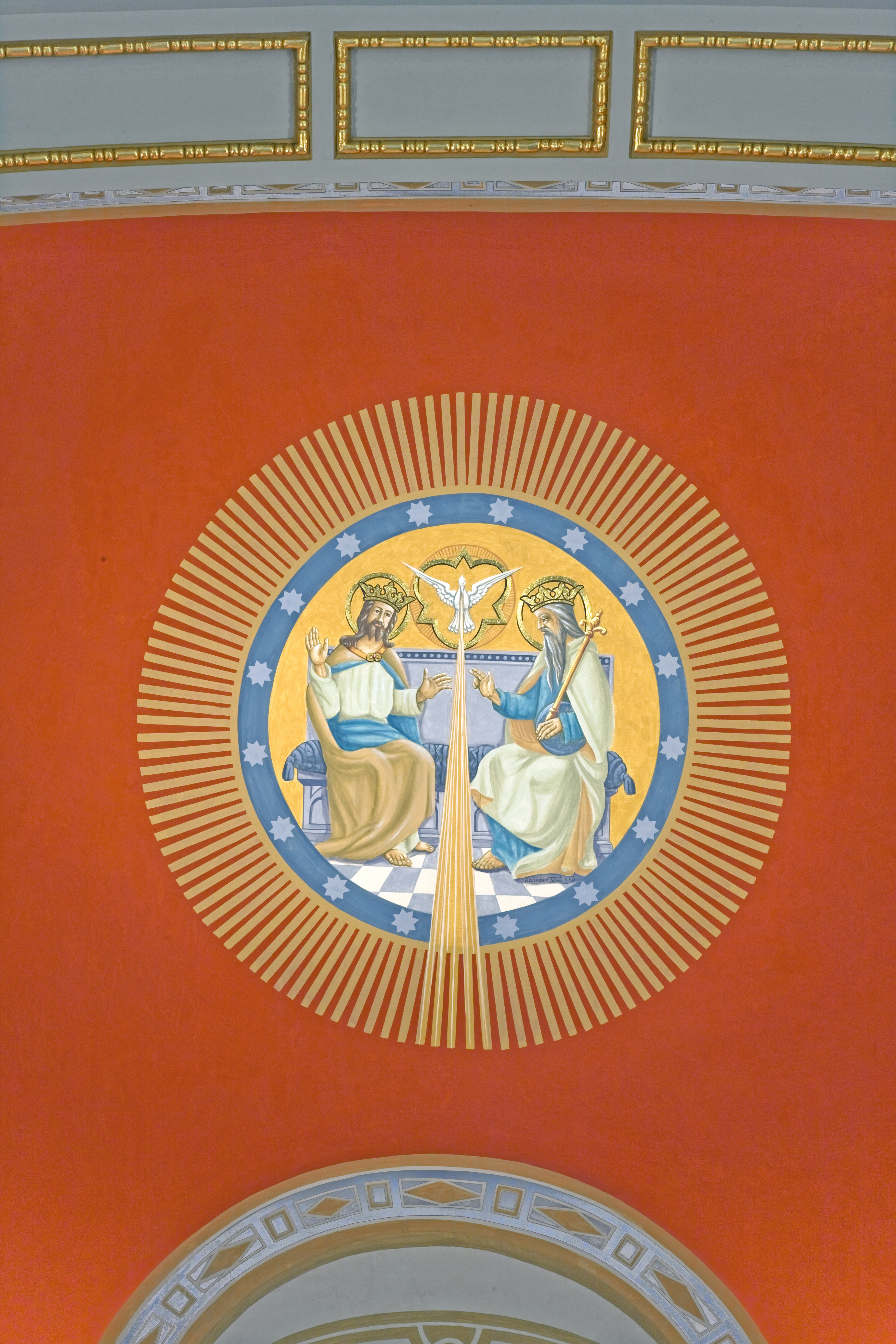 Die Farbigkeit richtet sich nach den Befunden der restauratorischen Untersuchungen; Gewölbekappen und Apsis sind oxidrot, die Gurtbögen und Sockelbereiche komplementär umbragrün, die Decken- und Wandflächen in einem gebrochenen Weiß gestaltet. Diese Farben ließ man nach Farbkarte werkseitig abtönen und glich sie vor Ort durch in Wasser angeteigte Pigmente an den Befund an.