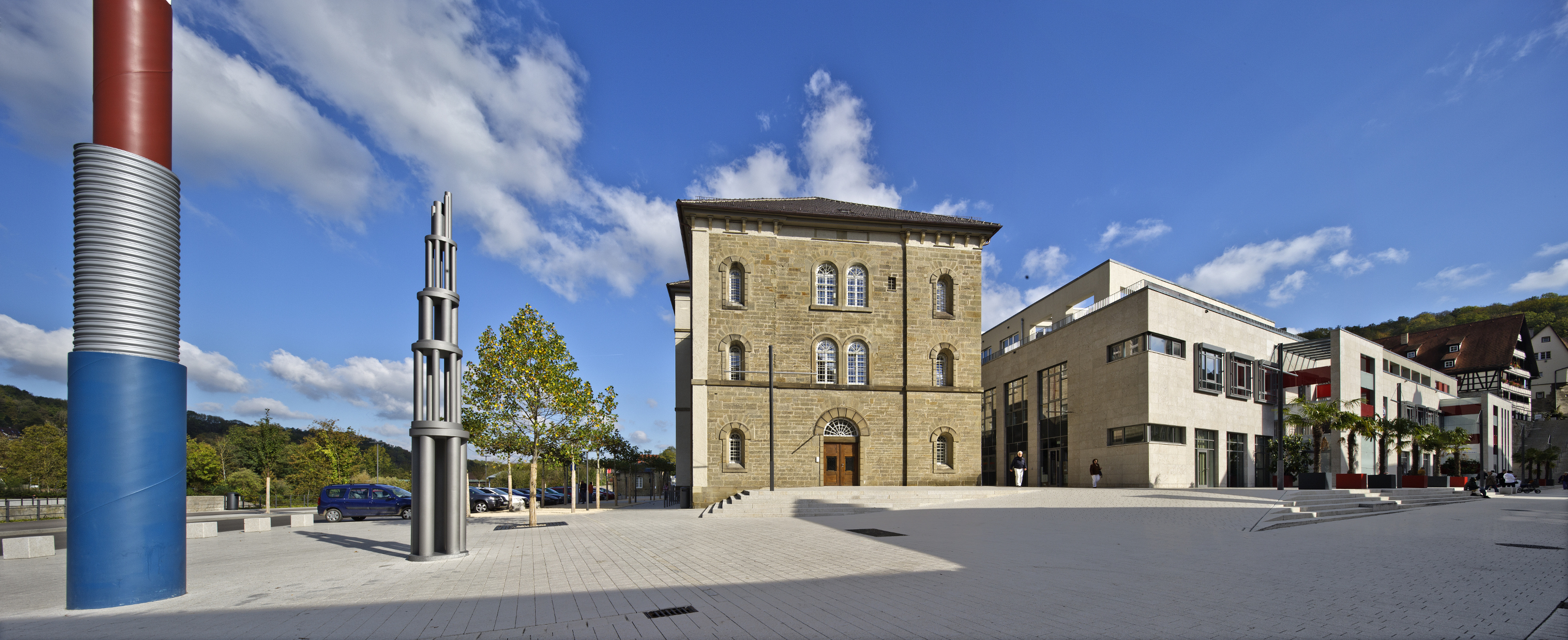 Die Lage ist großartig, vorne fließt das Flüsschen Kocher vorbei, hinten begrenzt die historische Stadtmauer das ca. 15 Hektar große ehemalige JVA-Gelände. Ein Potenzial, das es für die ehemalige freie Reichsstadt Schwäbisch Hall zu nutzen galt. Die alte Salzsiederstadt ist unter anderem für ihre Freilichtspiele bekannt: Wenn es in den Sommermonaten „Vorsicht Stufen“ heißt, verwandelt sich der Marktplatz mit der St. Michaelskirche in ein Open-Air-Theater. Das Besondere ist, dass nicht der Platz, sondern die Freitreppe vor der Kirche zur Bühne wird: Auf den steilen Stufen singen, tanzen und rezitieren die Schauspieler.