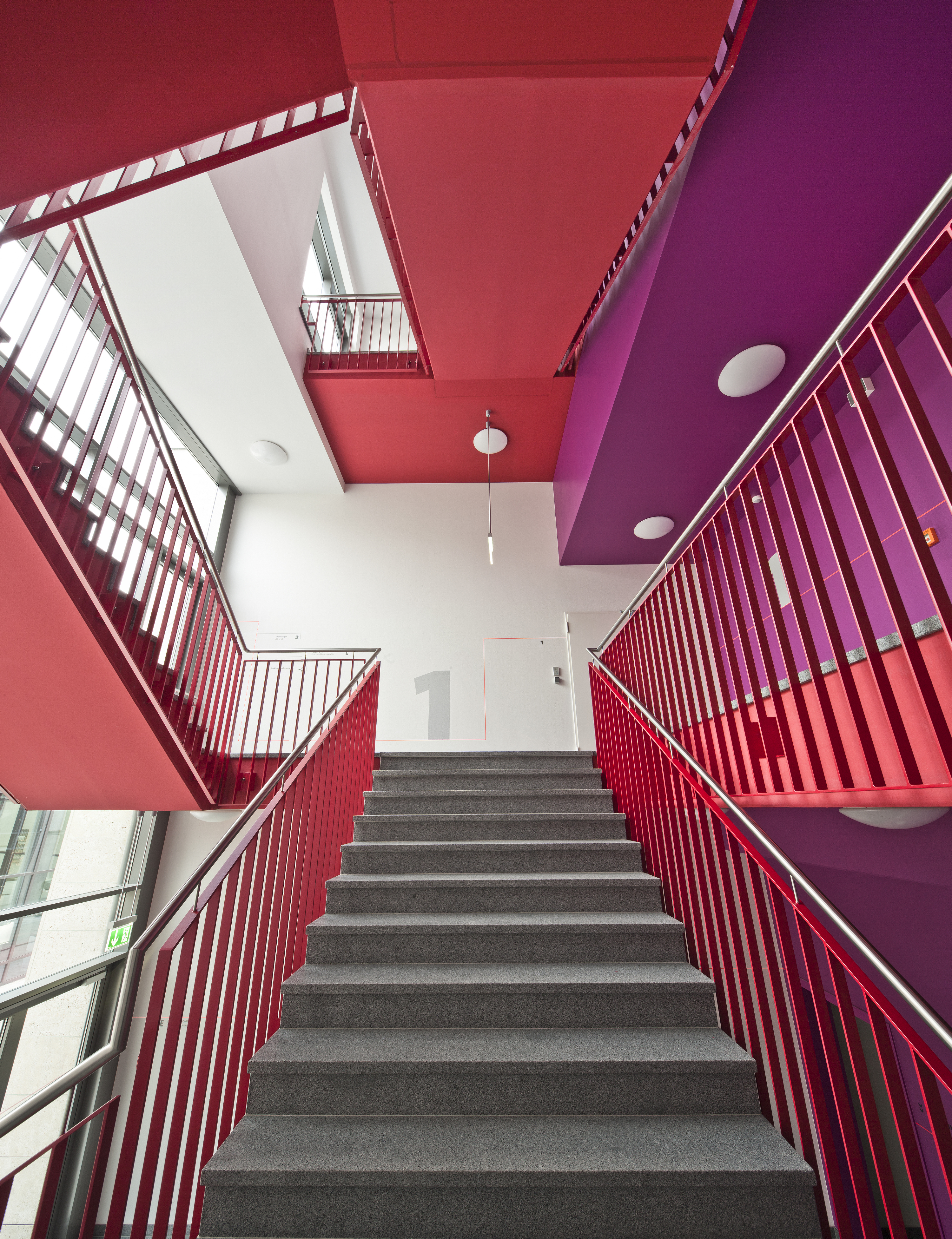 Betritt man das Treppenhaus über die gläserne Eingangsfront, fallen als erstes die in leuchtendem Rot gehaltenen Untersichten, Wangen und Geländerverstrebungen der Freitreppe auf. Dahinter hebt sich in schönem Kontrast die in Purpur getauchte Rückwand ab, die dem turmartigen Raum Weite verleiht. Die beiden Farbtöne aus der rotvioletten Farbreihe werden durch Silber, Grau und Weiß begleitet: Das Stahlgrau der Aufzugstüren setzt sich edel von den kräftigen Farben ab, während die grau-gesprenkelten Granitstufen und das Silbergrau des Edelstahlhandlaufs mit dem Rot der Treppe harmonieren. Die seitlichen Wandflächen sind in Weiß gehalten, wie auch die Decke. Die weißen Deckenlampen und die in Weiß applizierten Etagenzahlen, die auf einer feinen roten Linie balancieren, bilden eindeutige Kontraste. Je nach Tageslichteinfall und ganz besonders in der Dämmerung mit elektrischer Beleuchtung weist das Treppenhaus ein eigenes Farbenspiel auf. Die Materialität des Sichtbetons an Wänden, Decke und Treppe bringt Amphibolin gut zur Geltung. „Dass sich die intensiven Farbtöne in der Mischanlage des Großhandels rasch und unkompliziert herstellen ließen, überzeugte die Bauherrn sofort“, berichtet Martin Wißmann. Und auch die gute Reinigungsfähigkeit von Amphibolin sprach für die Verwendung in den stark frequentierten Treppenhäusern.