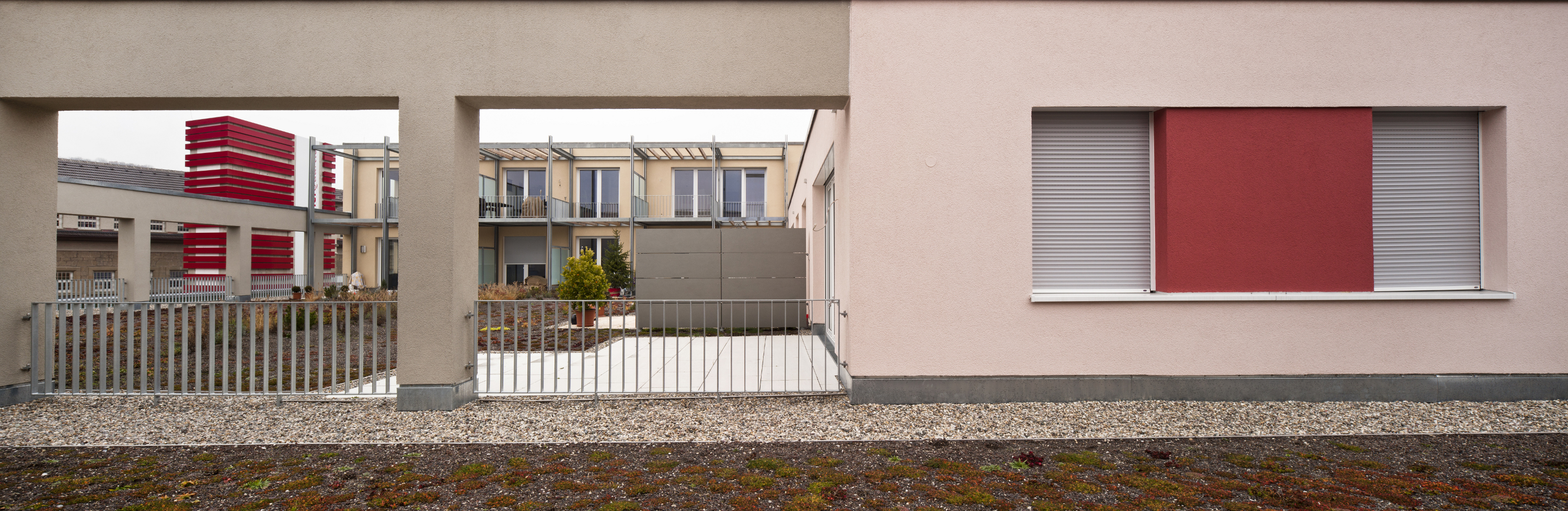 Was beim Betreten der Neubauten sofort ins Auge fällt, ist die Farbgestaltung in der Tiefgarage und in den Treppenhäusern. Das Farbkonzept stammt vom Architekturbüro Kraft + Kraft aus Schwäbisch Hall und ist auf zwei Farbspektren reduziert: „Rotviolett“ und „Blaugrün“. Zu Rotviolett gehören die Farbtöne RAL 3017 Rose, RAL 3020 Verkehrsrot, RAL 3015 Hellrosa, RAL 4002 Rotviolett, RAL 4006 Verkehrspurpur sowie ein RAL 4033 Erikaviolett. Zum blaugrünen Spektrum zählen die Farbtöne RAL 6018 Maigrün, RAL 6027 Lichtgrün, RAL 6029 Minzgrün, RAL 6019 Weißgrün, RAL 6018 Gelbgrün sowie RAL 5021 Wasserblau.