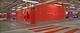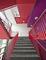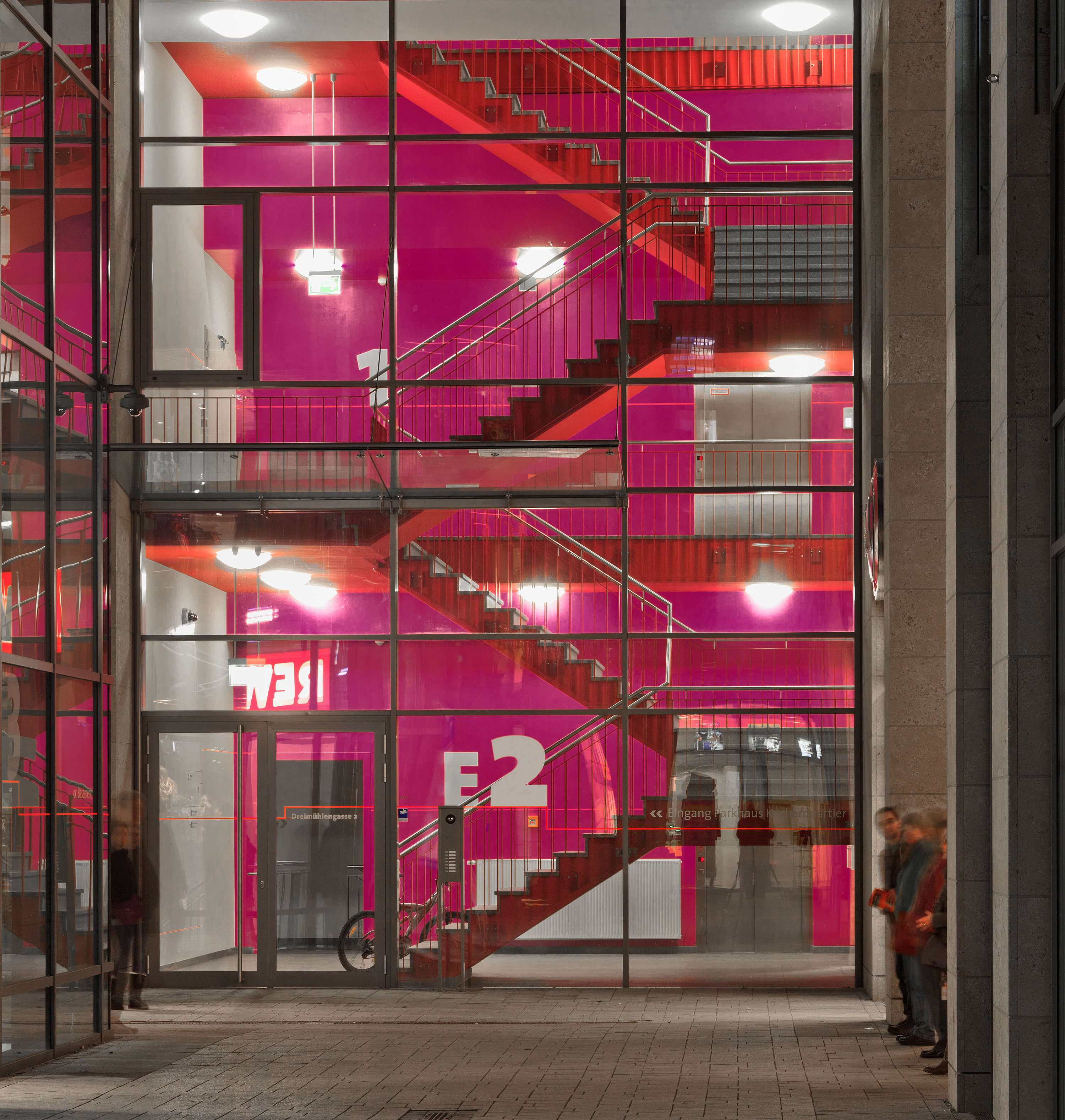 Im lichtdurchfluteten gläsernen Treppenhaus des zentralen Erschließungsturm setzen hohe Säulen aus der blaugrünen Farbreihe in Lichtgrün, Petrol und Weiß schöne Akzente. Richtig peppig wird es jedoch in den Treppenhäusern, die die beiden Verkaufsetagen und die Wohnanlage auf dem Dach des langgestreckten Neubaus erschließen. Eine wunderbar mutige, zugleich elegante und spannende Farbsymphonie in Verkehrsrot und Verkehrspurpur empfängt hier die Besucher. Was sich zunächst gewagt anhört, passt jedoch sehr schön zusammen, denn der Farbgestalter wählte zwei Farbtöne von Rot und Purpur, die wegen ihrer ähnlichen Sättigung sehr gut harmonieren und dennoch eine Spannung erzeugen und ein tolles Flair ergeben.