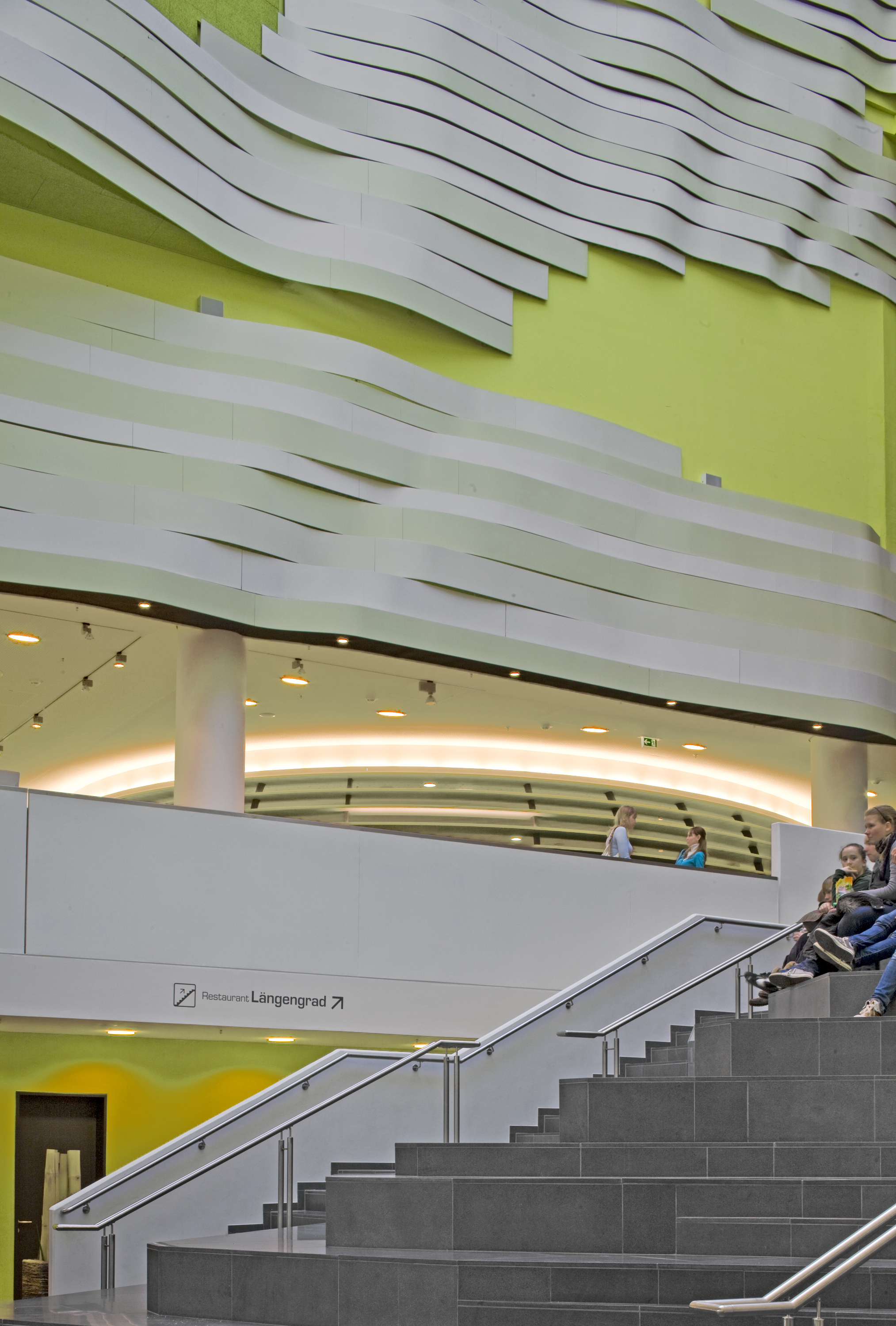 Das Klimahaus in Bremerhaven stellt mit der reliefartigen Wandgestaltung nicht nur einen Bezug zu klimatischen Wellenbewegungen her, sondern auch zu den Bewegungsströmen auf der Treppe. Die großzügige Treppenbreite lädt sogar zum Sitzen und Verweilen ein. Dadurch hat der Besucher die Möglichkeit, den imposanten Raum auf sich wirken zu lassen.