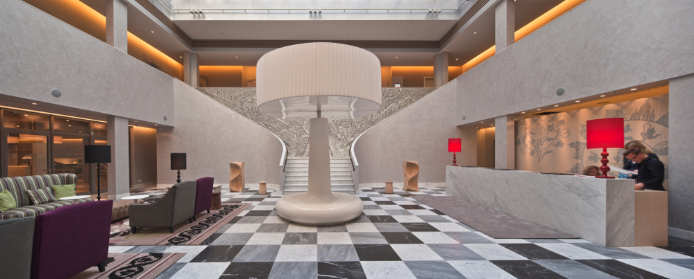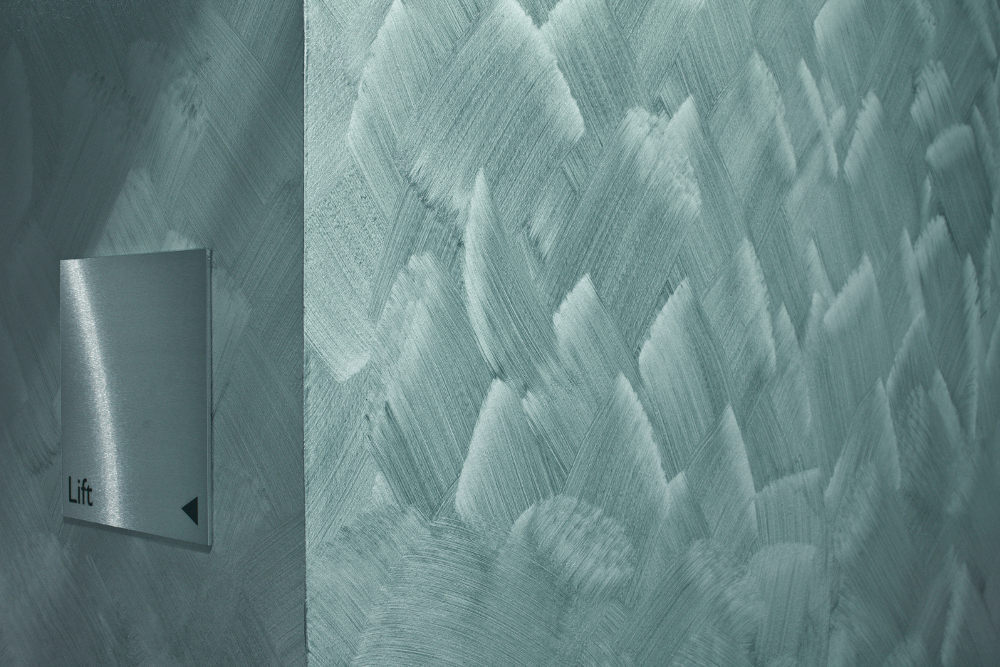 Bei der Raumgestaltung kamen hochwertige Materialien aus Nah und Fern zum Einsatz, deren Verarbeitung handwerkliches Geschick und sorgfältige Verarbeitung erfordern. Meißner Porzellan fand ebenso Verwendung wie Carrara-Marmor und das von einer in der Schweiz verbreiteten Zirbelkiefer gewonnene Arvenholz. Bei der Farbgebung liegen derzeit metallische Effekte im Trend, die im Ergebnis der Entwicklung entsprechender Werkstoffe und Techniken rationell aufgebracht werden können. Sie waren auch im Dresdner Swissôtel erwünscht. Die glasüberdachte Lobby sollte zum Beispiel mit einer Beschichtung ausgestattet werden, die diesen Metalleffekt besitzt und mit Blick voraus bei Bedarf auszubessern ist. Die Wahl fiel auf die dekorative, metallisch schattierende Spachtelmasse Art Velluto der Alligator Farbwerke im Farbton Basalt, die nach einer Grundierung in zwei Arbeitsgängen zunächst verdünnt mit einer Mohairwalze und anschließend unverdünnt mit einer Venezianer-Kelle aufgetragen bzw. nach kurzer Ablüftzeit abgescheibt wird. Auf diese Weise entsteht ihre charakteristische samtige Oberfläche. Als besondere Herausforderung bezeichnete Malermeister Dieter Jeschke, Geschäftsführer der ausführenden Jeschke Maler- Bau-Service GmbH aus Dresden, die Gestaltung des Treppenaufganges mit leicht geschwungenen Oberflächen, weil die Verarbeitung von Art Velluto üblicherweise ebene Flächen erfordert.