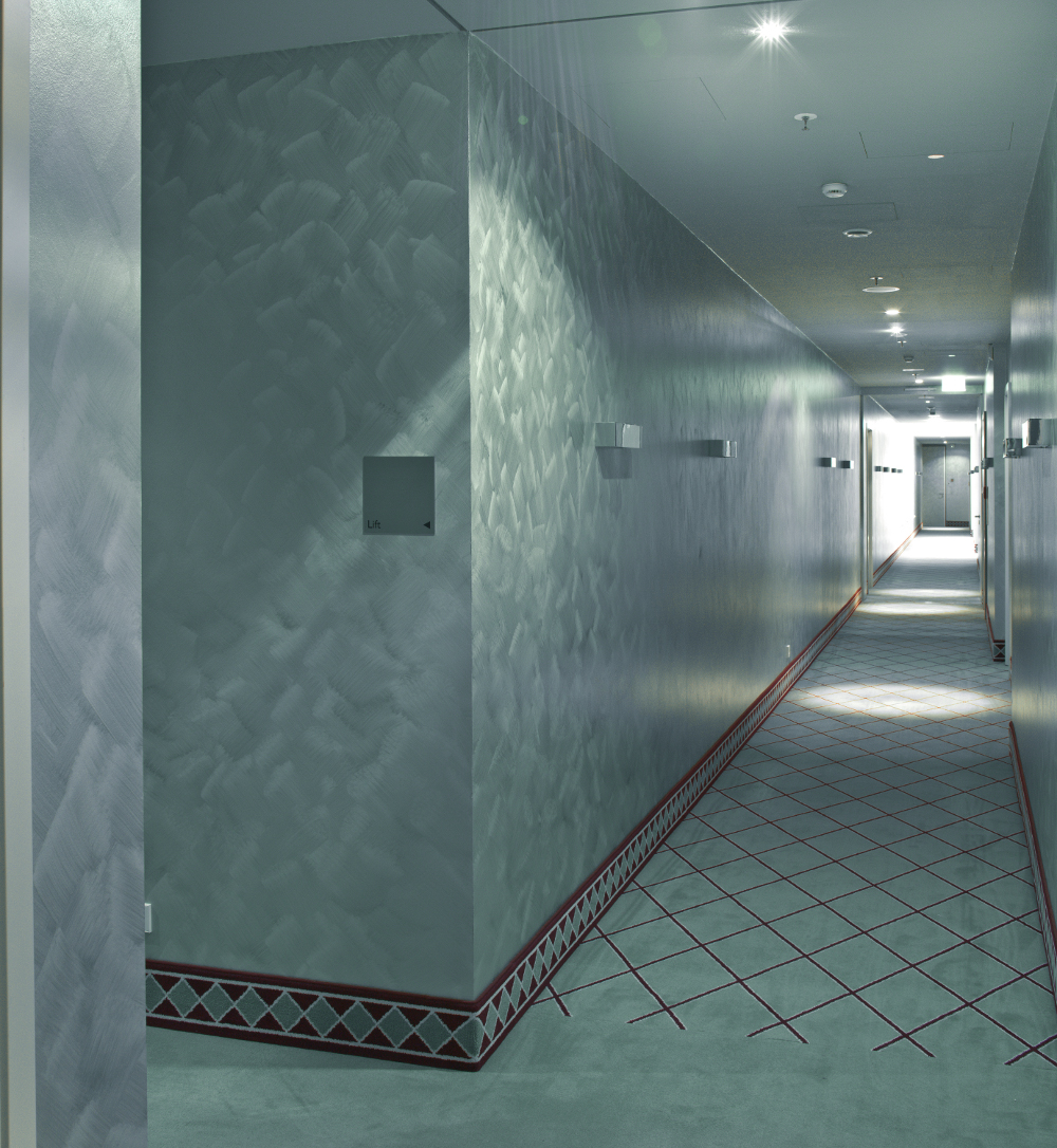 Eleganz und Glanz begleiten den Gast auf seinem weiteren Weg. Denn auch die Flure erhielten mit der metallisch anmutenden Spezialbeschichtung Metallocryl aus dem Hause Caparol, bei der Aluminiumpigmente für die glänzende Optik sorgen, ihr besonderes Flair. Durch das Reinacrylat-Bindemittel sind die Aluminiumpartikel fest eingebunden, so dass an der Oberfläche kein "Schreibeffekt" entsteht. Im Zuge der Vorbereitung des Untergrundes wurde Capaver AkkordVlies G40 auf die Wandflächen geklebt und mit der scheuerbeständigen, umweltschonenden Innenfarbe MattLatex überstrichen. Im nächsten Schritt erfolgte der Auftrag der wegen der starken Lichtreflexion für schwach beleuchtete Treppenhäuser und Flure besonders geeigneten, hochbeanspruchbaren Universalfarbe Amphibolin. Das Finale des aufwändigen Beschichtungsaufbaus bestritten extra dafür geschulte Mitarbeiter der Bau- und Malerfirma, die Metallocryl mit der Bürste gekonnt im Kreuzschlag auftrugen. Bei der Abnahme der mehr als 3000 Quadratmeter Wandflächen in den Fluren habe es keinerlei Beanstandungen gegeben, vermerkte Geschäftsführer Jeschke nicht ohne Stolz und verwies in diesem Zusammenhang auf die gute Partnerschaft mit Caparol-Fachberater André Wittwer. In den auf das Modernste eingerichteten Zimmern wurde auf das AkkordVlies G40 gleichfalls MattLatex gestrichen.
