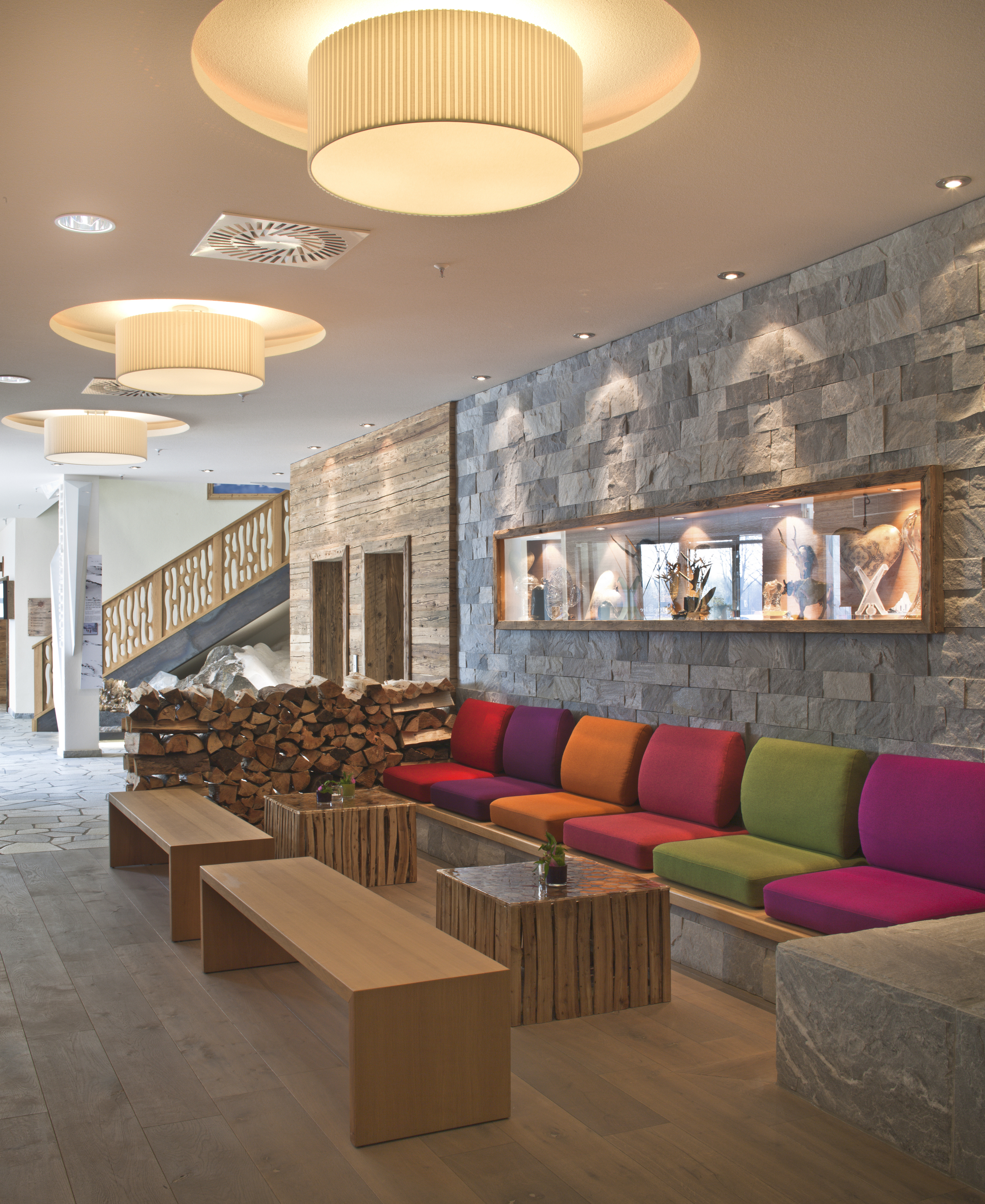 Architekt Martin Nienhaus vom Architekturbüro Bruno Braun, Düsseldorf, berichtet: „Ein reines Lochplatten-Akustiksystem hätte mit seiner technischen Anmutung nicht zum alpinen, hochwertigen Stil des Hotels gepasst. Da war es ideal, dass sich mit CapaCoustic Structure eine grobkörnige Putzbeschichtung über die Akustik-Lochplatten applizieren ließ. Entscheidend war, dass das System fugenlos ist.