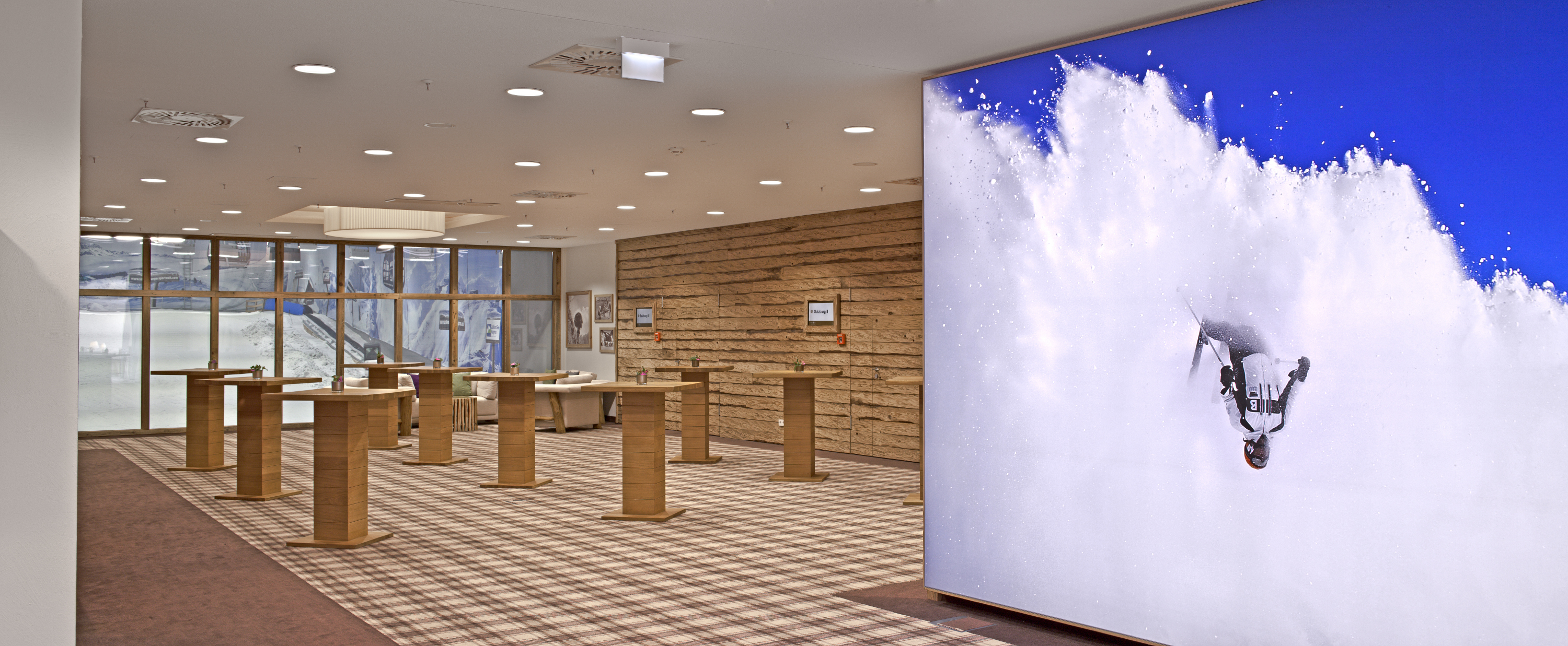 Der umgebende Eventbereich mit Ski-, Rodel- und Kletterincentives macht das Hotel auch für Tagungen und Seminare beliebt. Neun erstklassig ausgestattete Seminarräume mit viel Tageslicht, Aussicht ins Grüne und bis zu vier Meter lichter Deckenhöhe stehen zur Verfügung. Zusammen mit den beiden Tagungsräumen im Hauptgebäude der Skihalle sind das insgesamt 1000 Quadratmeter Tagungsbereich. Viel Raum, in dem es ohne akustische Maßnahmen schnell unangenehm laut werden kann. Damit in Tagungsräumen, Lobby und Treppenhaus die Akustik stimmt, war eine effektive Maßnahme erforderlich. Die Verantwortlichen entschieden sich für ein hochwertiges System, das sich gleichermaßen edel wie dezent in das gestalterische Gesamtkonzept des Hotels einfügt: CapaCoustic Structure von Caparol.