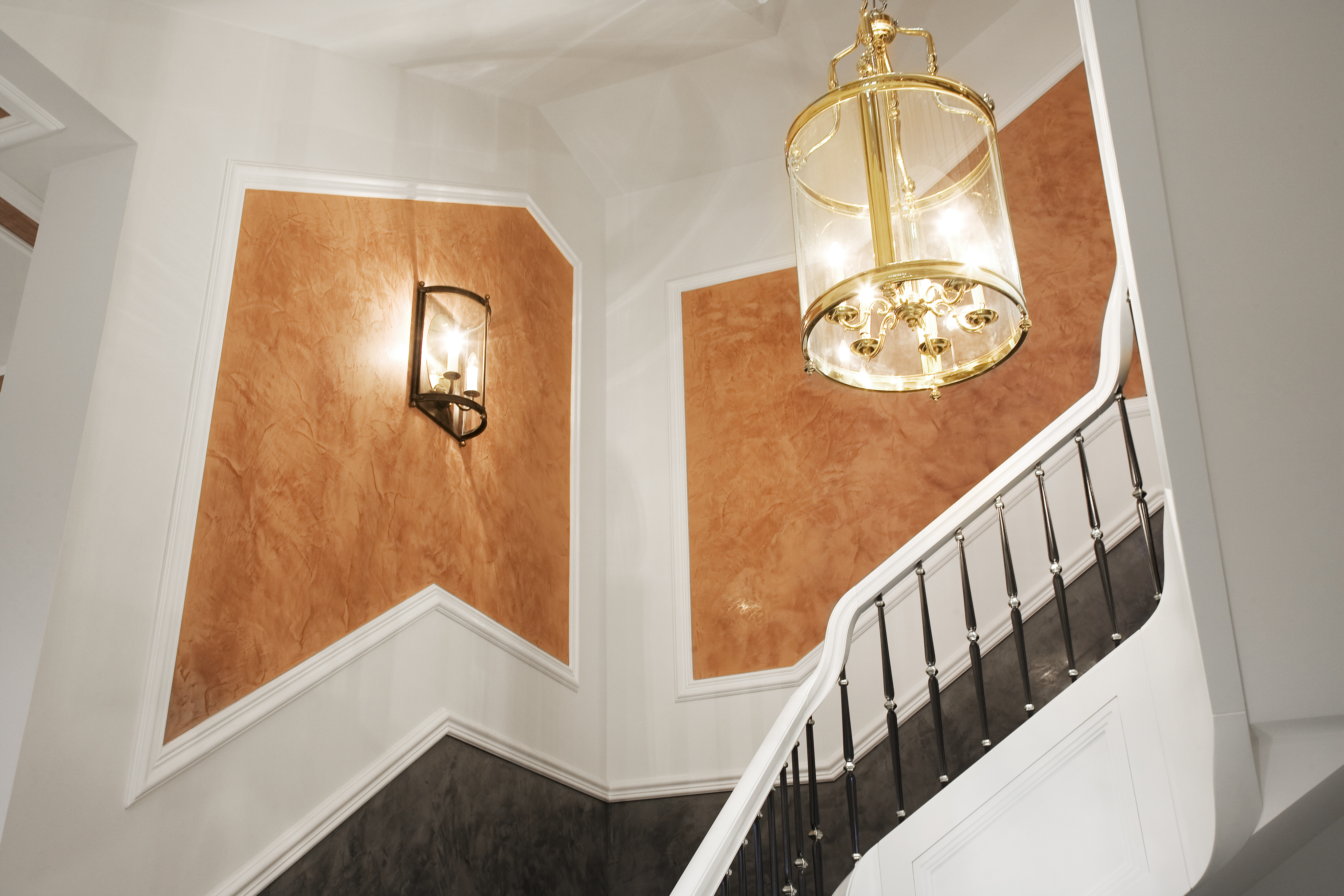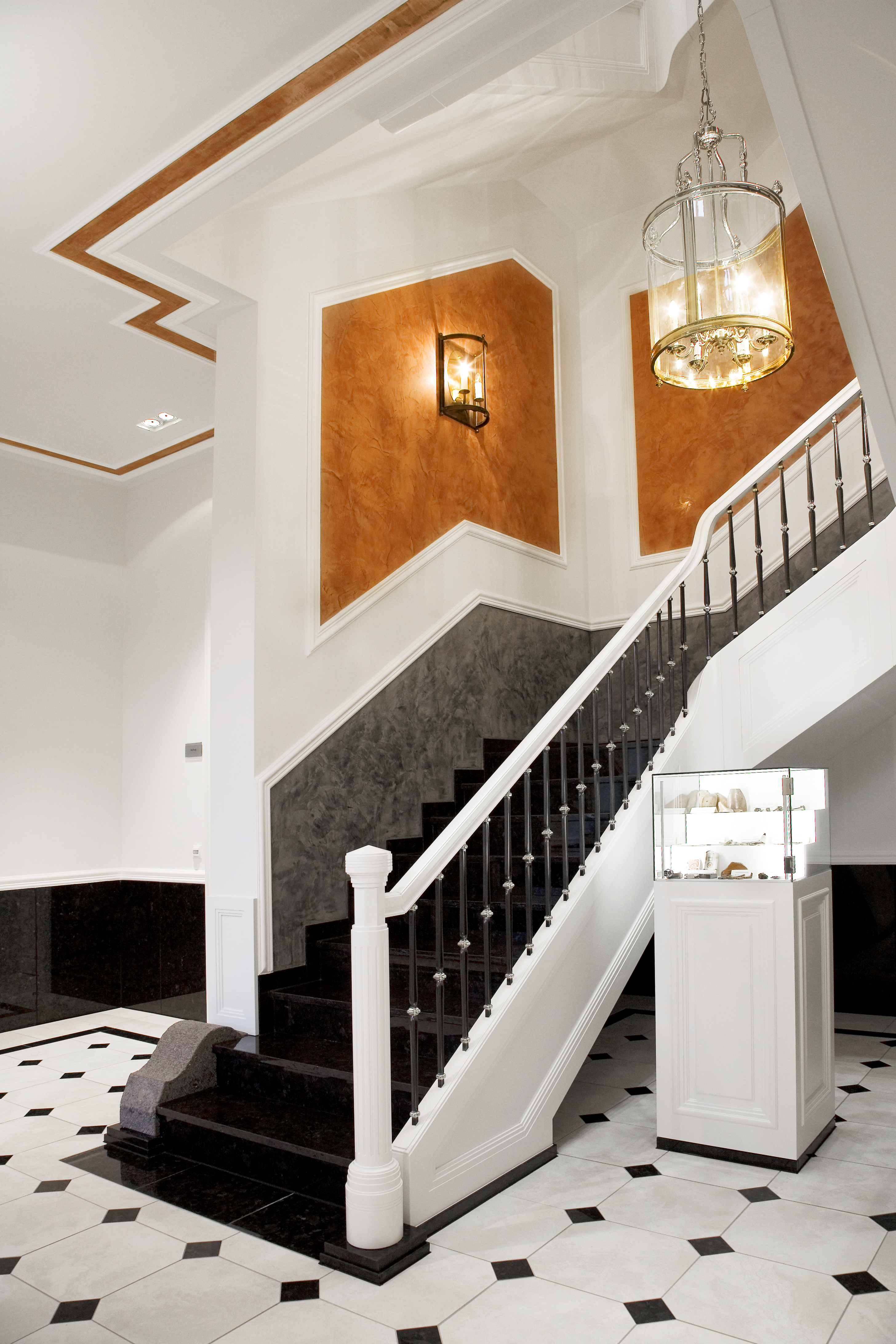 Das galt natürlich auch für das großzügige Treppenhaus, das zu gewerblichen Räumen und in den privaten Wohnbereich des Eigentümers führt. Beim ersten Objektgespräch zwischen dem Bauherren und Dietmar Kessler, Geschäftsführer der malerkessler GmbH wurden verschiedene Möglichkeiten diskutiert, die das Treppenhaus hergab und dann in grober Form ausgearbeitet. Mit diesen Vorgaben begann Malermeister Dietmar Kessler ein Gesamtbild zusammenzufügen. Da die malerkessler GmbH schon seit über 20 Jahren auf die Qualität der Caparol-Produkte setzt, hat Dietmar Kessler die mineralische Kalkspachtelmasse Calcino Decor eingesetzt, zumal der Auftraggeber einen Sonderfarbton ausgesucht hatte, der werkseitig von der Fa. Caparol abgetönt geliefert wurde. Darüber hinaus sorgt der hohe Marmor-Anteil für schlichte Eleganz und stilvolle Ästhetik - beste Eigenschaften für die gegebenen Anforderungen. Weiterhin wurden die Wandflächen mit Profilen akzentuiert, um Übergänge für verschiedene Materialien zu schaffen.