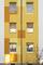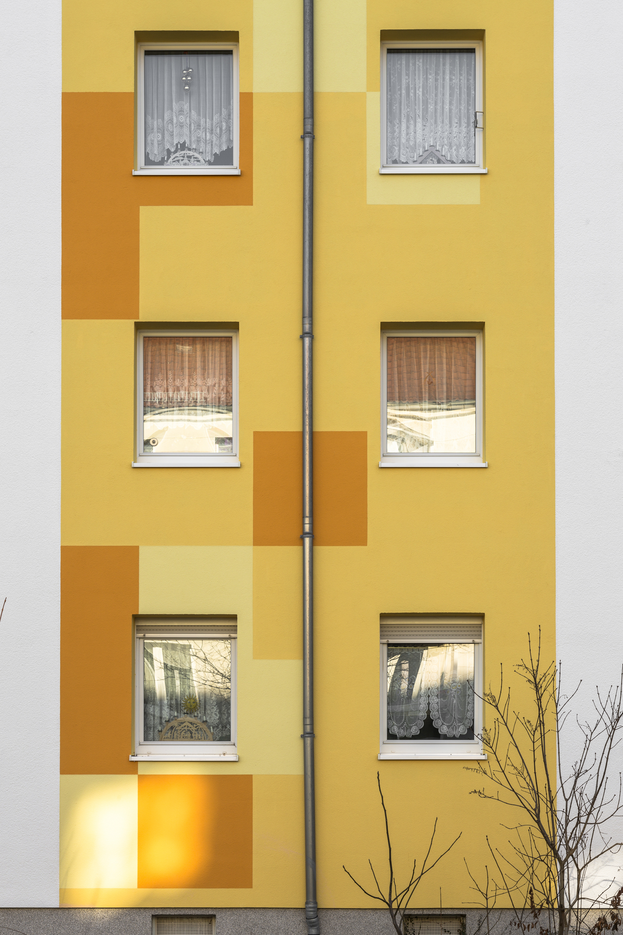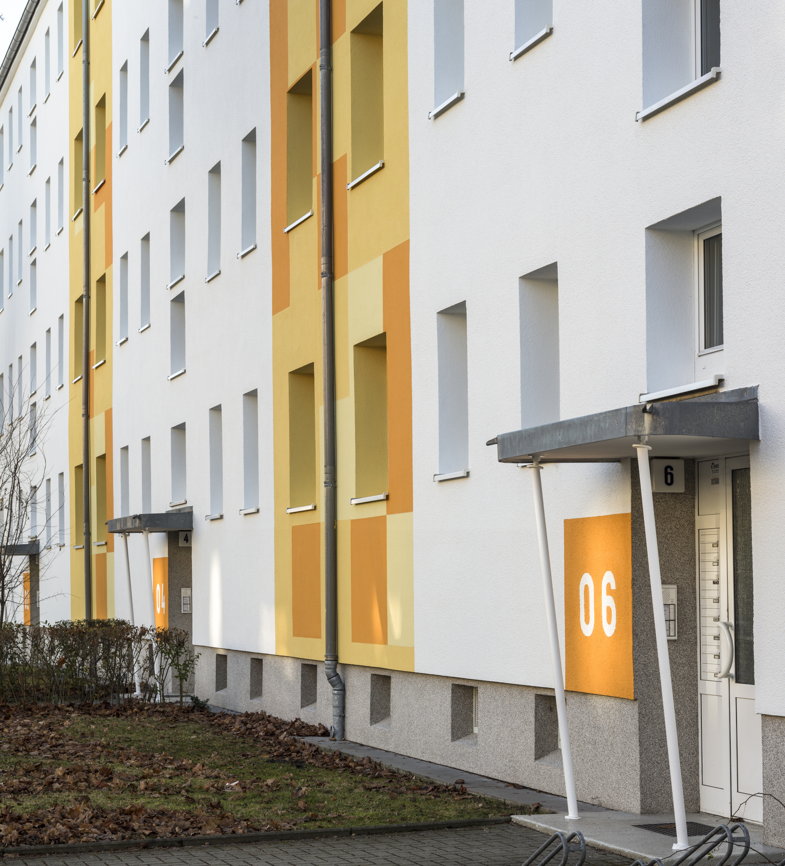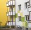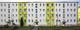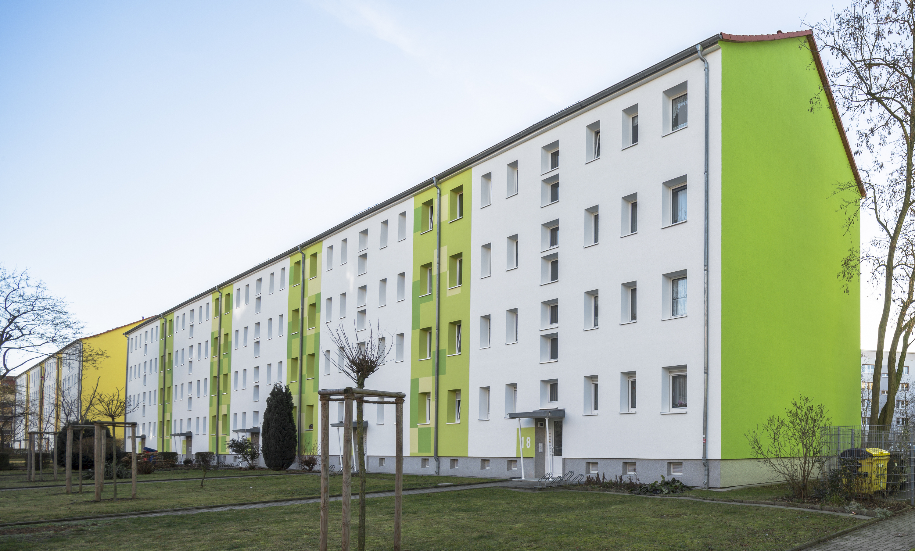Die Wohnungsgenossenschaft hatte in der Vergangenheit mehrfach die Kompetenz von Dipl.-Ing. Eva Helterhoff vom Caparol FarbDesignStudio in Anspruch genommen und war damit gut gefahren. Sie entschied sich auch in diesem Fall für die Farbdesignerin. "Frau Helterhoff besitzt ihre eigene unverkennbare Handschrift und weiß, wie wir ticken", bescheinigte ihr Dirk Neumann. Gefragt war ein Entwurf, der Bewohnerschaft, Quartier und Umfeld gerecht wird. Was die Gestalterin in Halle vorfand, war eine in die Jahre gekommene Straßenzeile, die wenig Ausstrahlung besaß und den Bezug zur Umwelt vermissen ließ. In der Baugleichheit der Gebäude und nur einem Eigentümer sah sie die Chance, die vier nebeneinander stehenden Häuser über die Farbgebung in ein ansehnliches, lebendiges Wohnensemble zu verwandeln. Das war mit einer klassischen, nur von wechselnden Farbtönen getragenen Gestaltung nicht zu machen. So empfahl sie die Verwendung von weiteren spezifischen Gestaltungselementen. In den Entwürfen setzen die zwischen den Eingangsbereichen angeordneten, über zwei Fensterbreiten reichende Farbbänder in Gebäudehöhe die farblichen Akzente auf der im Grundton weißen Fassade, in die als Gestaltungselemente farblich kräftigere Quadrate eingestreut sind. "Sie durften nicht zu kleinteilig sein, um ihren Rhythmus nachvollziehbar zu machen", beschrieb die Designerin ihre Überlegungen. Zu berücksichtigen war außerdem, dass es im Sommer durch Bäume zu Sichteinschränkungen kommt, was eine Kleinteiligkeit der Elemente verbot. Der von der Gestalterin gewählte Farbkreis von Orange über Gelb nach Grün gestand jedem der vier Häuser ein bestimmtes Maß an Individualität zu, verband sie aber andererseits wie gewünscht zu einem harmonisch in die Wohnlandschaft eingepassten Ensemble. Eingeleitet wird die Farbgestaltung jedes Hauses mit einem Paukenschlag: Die fensterlosen Giebel erhielten einen vollflächigen Farbanstrich. Auf der straßenfernen Seite bestimmen die vorhandenen Putzbänder und Balkonbrüstungen die Farbwahl. Alle Balkonrückwände sind als verbindendes Element in einem Gelbton abgesetzt.