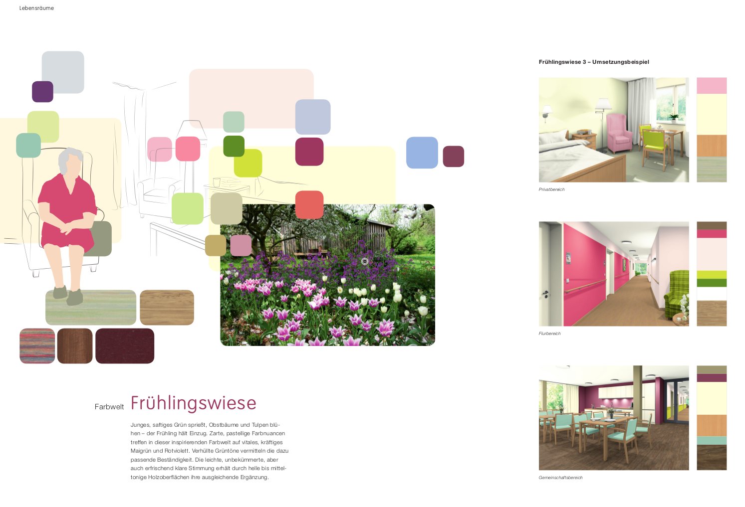 Die Broschüre führt in die "Wohn-Lebenswelt" von Senioren ein und bietet viel Hintergrundwissen zur Gestaltung verschiedener Nutzungsbereiche sowie zu den dafür geeigneten Materialien. Sie zeigt, wie Farbkonzepte im realen Raum wirken und angewendet werden können. Exemplarische Raumvisualisierungen helfen dabei, sich die Harmonien des Fächers in der Umsetzung vorzustellen.