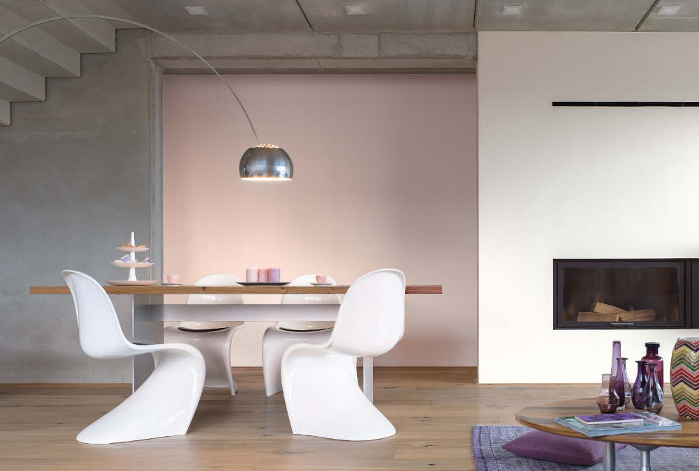 Ausgehend von rosigem Weiß dominieren elegante, neblige Rosenholztöne. Der klassisch-stilvolle Anklang weckt Assoziationen zu Stofflichem, zu Glanz und seidigem Schimmer. Samtiges Violett setzt einen Akzent. Nuancen in lichtem Grau und Blau scheinen die Grenze zwischen drinnen und draußen aufzuheben.