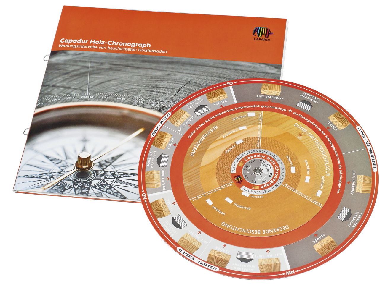 Wann die nächste Renovierung für beschichtete Holzbauteile fällig ist, hängt von vielen Faktoren ab und ist nicht ohne weiteres zu beantworten. Architekten und Handwerker bekommen jetzt ein einfach zu bedienendes, aussagekräftiges Hilfsmittel für die Planung der Wartungsintervalle an die Hand: Den neu entwickelten Capadur Holz-Chronograph. Das Tool besteht aus einer Drehscheibe, die sich aus drei gegeneinander verstellbaren Einzelscheiben zusammensetzt. Diese berücksichtigen sämtliche wartungsrelevanten Faktoren wie Himmelsrichtung (Exposition), die Montagerichtung der Schalungsbretter, die Jahrringlage sowie die gewählte, deckende oder lasierende Beschichtung (Imprägnierlasur, Dünn-/Mittelschichtlasur, Holzfarbe). All diese Faktoren fließen nach der Einstellung der Scheiben auf dem Capadur Holz-Chronographen in die objektspezifische Instandhaltungsberechnung ein. Als Ergebnis erscheint eine Jahresangabe auf der Drehscheibe, die das Wartungsintervall prognostiziert.