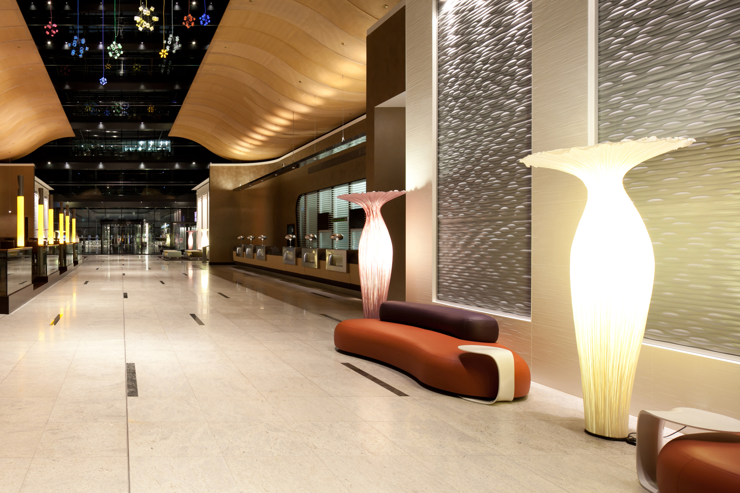 Interessant ist insbesondere die Lobby des Hotels, ein großzügiger und zum Himmel hin offen verglastes Atrium. Hier finden sich als zentrale Elemente die Rezeption und die Bar, beide von weit aufschwingenden Deckenelementen akzentuiert, die an Tragflächen oder die Flügel großer Vögel erinnern. Diese Geste des Willkommens verstärken hier noch golden gefasste Rückwände mit wolkigem Duktus - wobei der Goldton dem Gast sehr modern entgegentritt. Denn nicht etwa das makellose, hoch glänzende Gold des Barocks findet sich hier, sondern eine wolkige, changierende Erscheinung, die das Unnahbare des Materials in ein sympathisches Umfangen verwandelt.