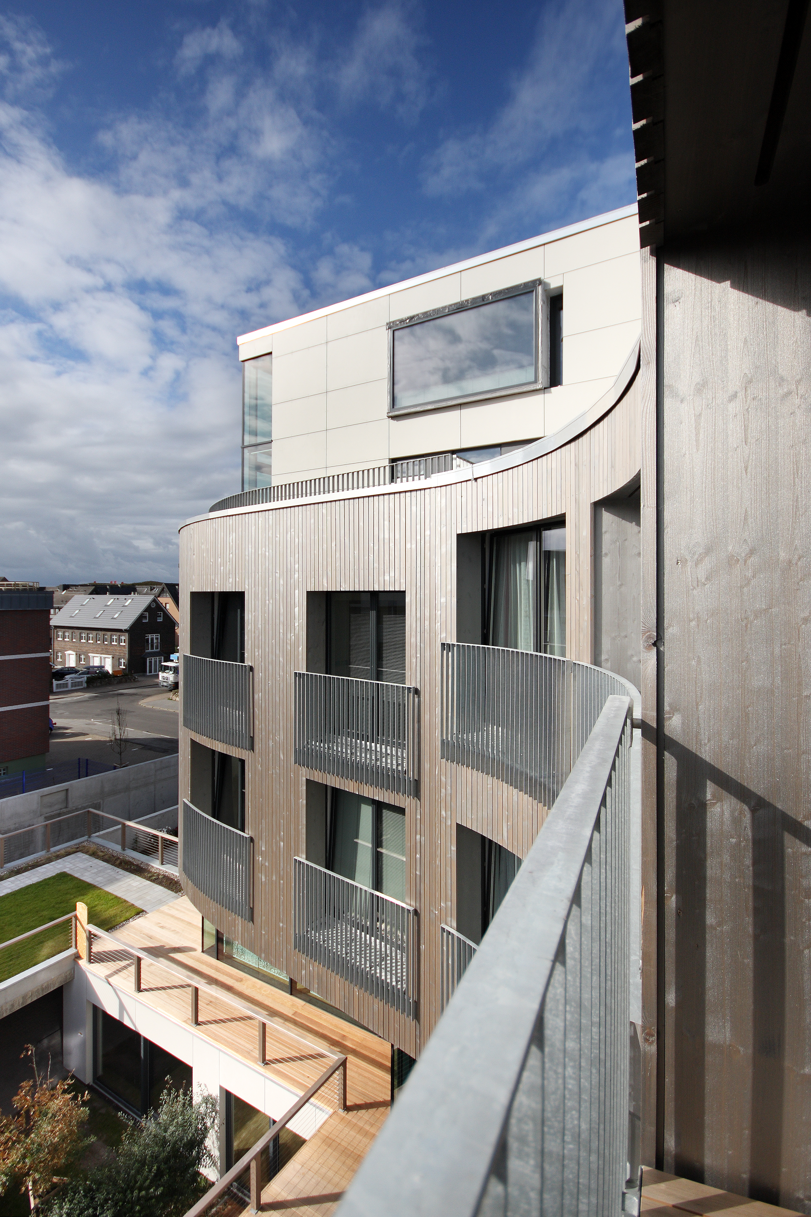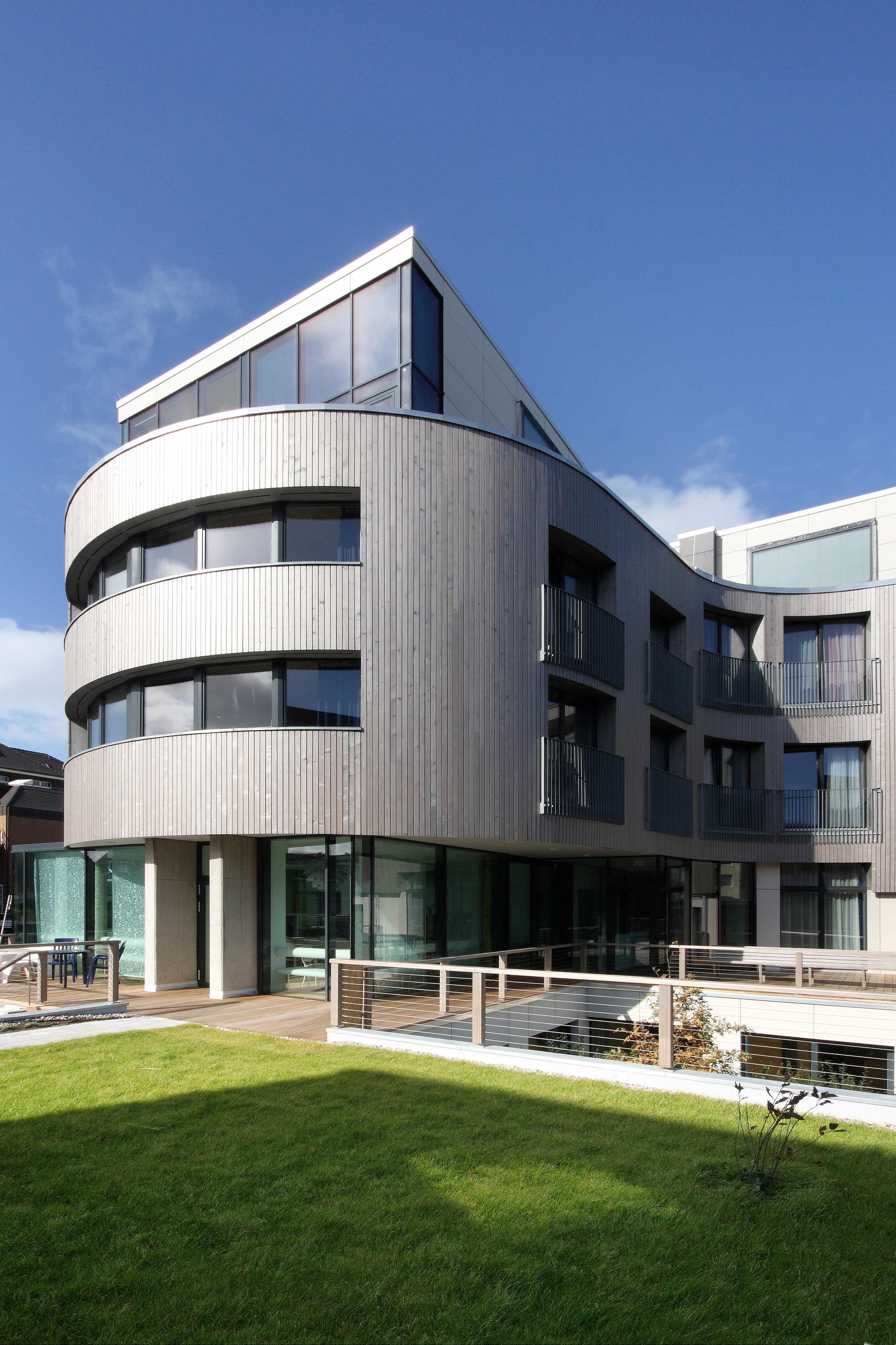 Neben der neuen Fassade deutet auch die Formensprache des Anbaus sein jüngeres Baujahr an: In Wellen fließt der Anbau dahin und ergänzt den Bestand, der praktisch und rechteckig daher kommt. Dadurch wird deutlich: "Die kubischen Formen sind der Bestand, alles was an der Außenhülle gebogen ist, ist Neubau", so der Architekt Johannes Kaufmann.