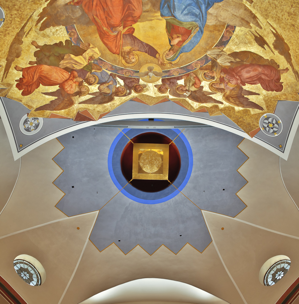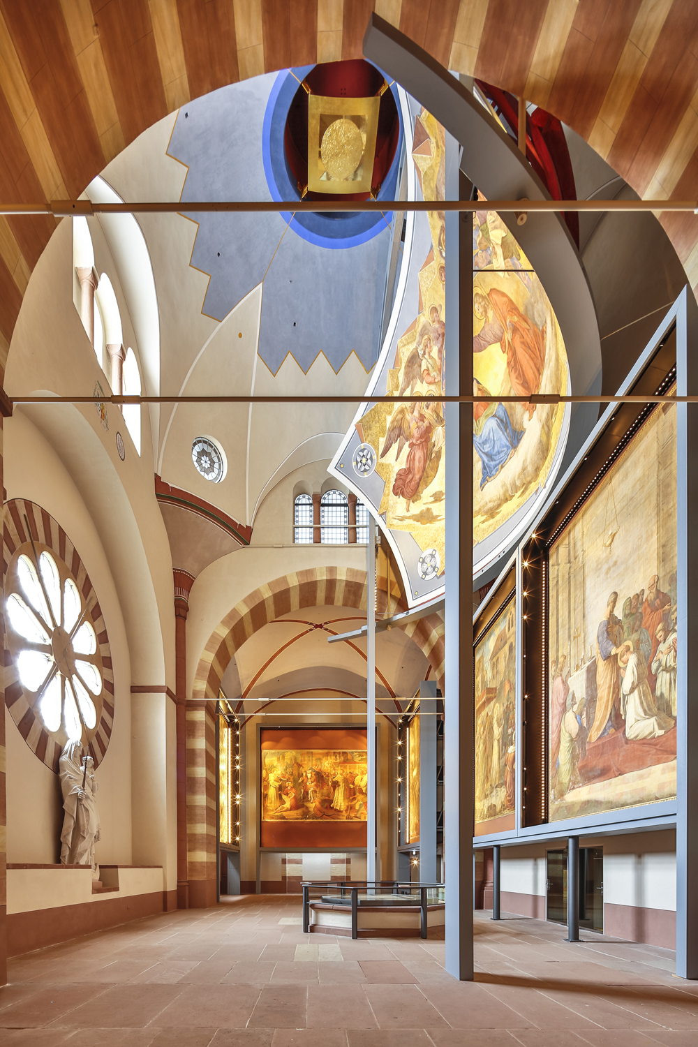 Der Kaisersaal im Weltkulturerbe Speyerer Dom hat mit der Dauerausstellung der Schraudolph-Fresken erstmals eine konkrete Bestimmung erhalten. Zuvor stand der 500 Quadratmeter große Saal im Westbau des Doms leer oder diente als Lagerraum. 2010 begann der Ausbau mit Mitteln aus dem Konjunkturpaket II. „Weil der Saal nie richtig genutzt worden war, gab es keinen historischen Befund“, berichtet Architekt Mario Colletto, der noch als stellvertretender Dombaumeister mit der Ausgestaltung des Kaisersaals beauftragt wurde. Seit Januar ist er Dombaumeister. „Wir mussten den Raum komplett neu fassen“, betont er. Für die elf Meter breite und siebeneinhalb Meter hohe Marienkrönung, die in der Apsis des Chorraums hing, wurde sogar eine Kuppelkonstruktion aus Gips nachgebildet. Bei der Farbgebung und ornamentalen Gestaltung orientierte Colletto sich an Vorlagen des Dekorationsmalers Joseph Schwarzmann, der gemeinsam mit Schraudolph Mitte des 19. Jahrhunderts dem Dom ausgemalt hat.