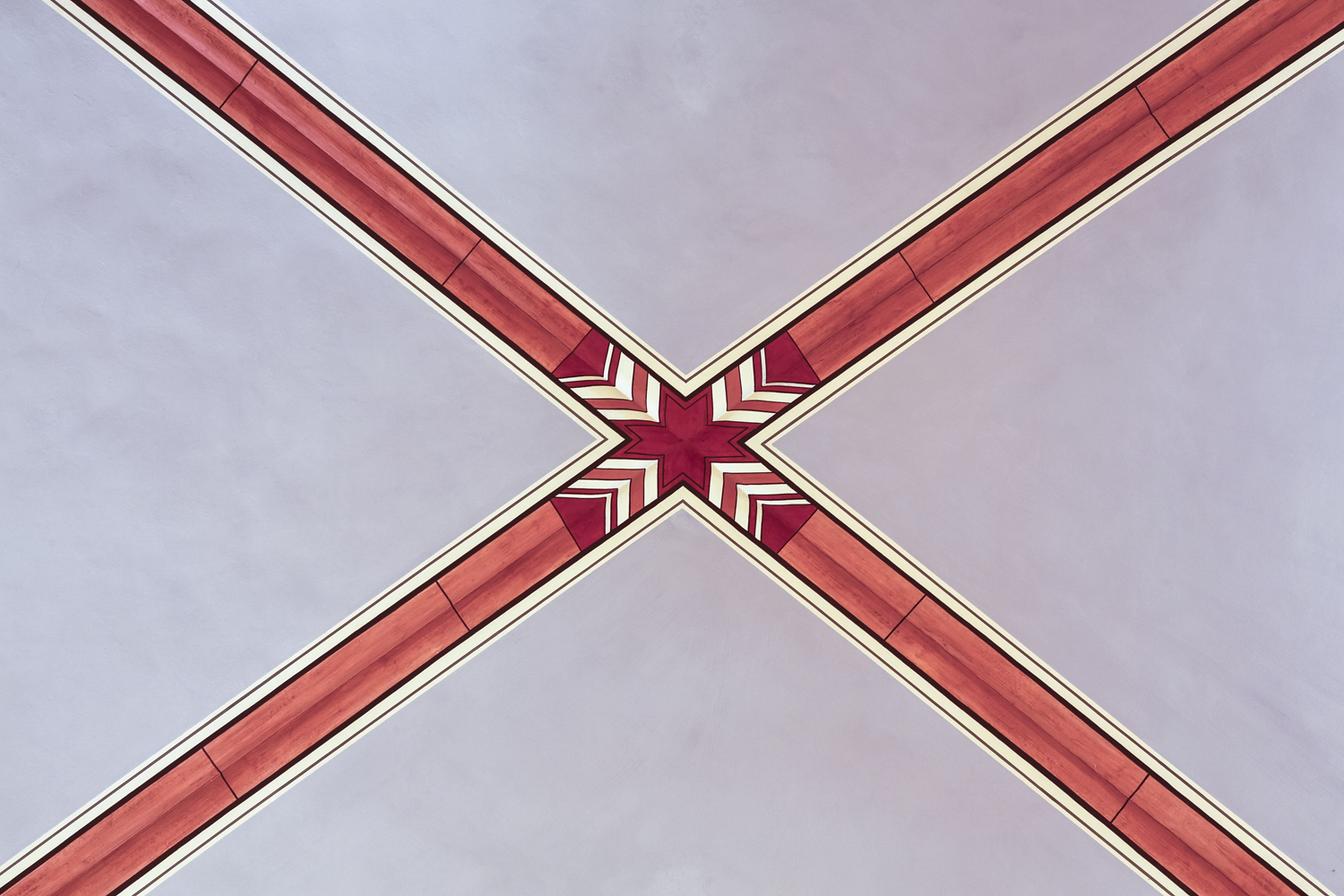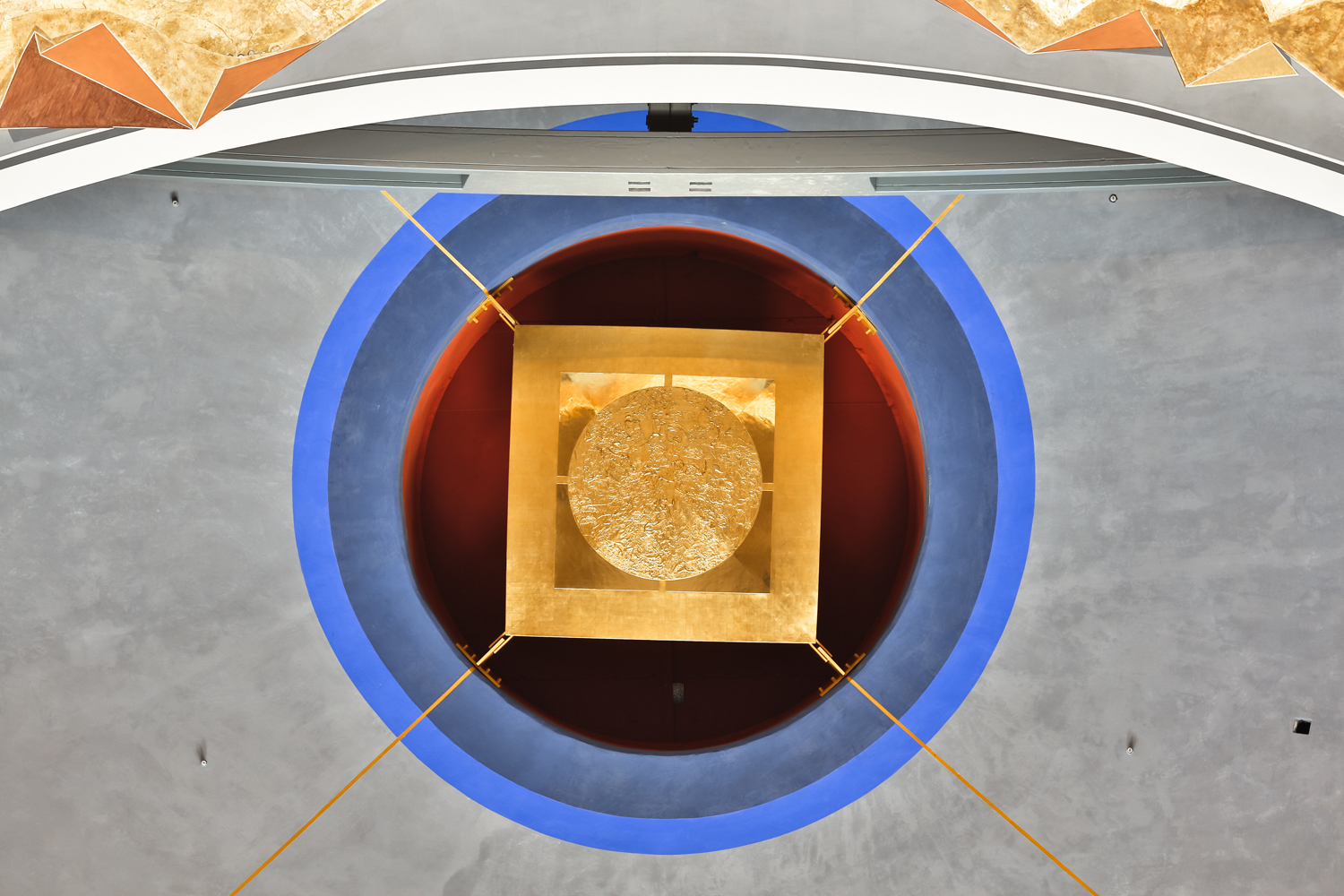 Colletto ließ sich Musterflächen zeigen und Mischproben anfertigen, er prüfte Deckkraft und Trocknung – und war schließlich überzeugt. „Die Farben sind sehr gut. Sie entsprechen von der mineralischen Optik her der Oberfläche des Kalks und haben sehr gute physikalische Eigenschaften, zum Beispiel eine hohe Dampfdiffusionsoffenheit“, sagt Colletto. Alle Gewölbe im 25 Meter hohen Kaisersaal wurden mit Histolith Innenkalk gestrichen – in kräftigem Blau, Rot, Grün und Gelb. Auch für die Applikationen und Dekomalereien wurde der Kalkanstrich von Caparol verwendet.