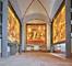 „Durch die flächige Beleuchtung der Bilder erreichen wir, dass im gesamten Raum kein weiteres künstliches Licht nötig ist“, erklärt Colletto. Wie früher, als ausschließlich Kerzen in den Kirchen brannten und das Gold der Heiligendarstellungen das Licht reflektierte, wird nun auch der Kaisersaal allein durch die Beleuchtung der Kunstwerke illuminiert – die Heiligen erhellen gewissermaßen den Raum. „Das ist ja ein sakraler Raum“, betont Colletto, „da kann man nicht einfach auf die Bilder draufstrahlen wie im Museum.“ Der geistliche Charakter des Kaisersaals wird den Besuchern der Freskenausstellung auch durch die Sichtbeziehung zum Innenraum des Doms vergegenwärtigt: Eine Glastür zur Empore ermöglich den Blick in die Kathedrale und durch das mit einer Glasplatte abgedeckte Glockenloch im Fußboden kann man in die Vorhalle schauen.