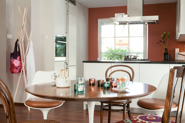 Die Familie ist sehr glücklich mit den neu gestalteten Räumen: "Wir fühlen uns unglaublich wohl in unserem Haus. Auch unsere Besucher finden es gemütlich, schick. Wir mögen die warmen Töne, die sowohl tagsüber als auch abends eine ruhige, angenehme Stimmung bringen. Die Beerentöne im Eingangsbereich sind ein echter Hingucker. Die Küche setzt sich durch die rostrote Stirnwand schön ab, obwohl sie offen mit dem Wohnbereich verbunden ist. Alle Farbtöne harmonieren hervorragend mit dem Parkettboden." Und noch etwas begeistert Familie B.: Die Farben und Oberflächen sehen nicht nur toll aus, sie sind auch unempfindlich - ein wichtiges Kriterium in einem Haushalt mit Kleinkindern.