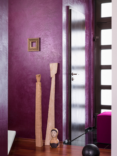 TSP.DESIGN erstellte schnell und professionell ein individuelles Farbkonzept - abgestimmt auf Raumproportionen, Lichtverhältnisse und Möblierung, das 1:1 realisiert wurde. Neben deckenden Farbanstrichen kamen zusätzlich Effektbeschichtungen zum Einsatz, die einzelne Wände durch Struktur und Glanz besonders akzentuieren. Das Spiel glatter und strukturierter sowie matter und glänzender Oberflächen in Kombination mit der extravaganten Farbigkeit charakterisieren die Atmosphäre des Wohnhauses.