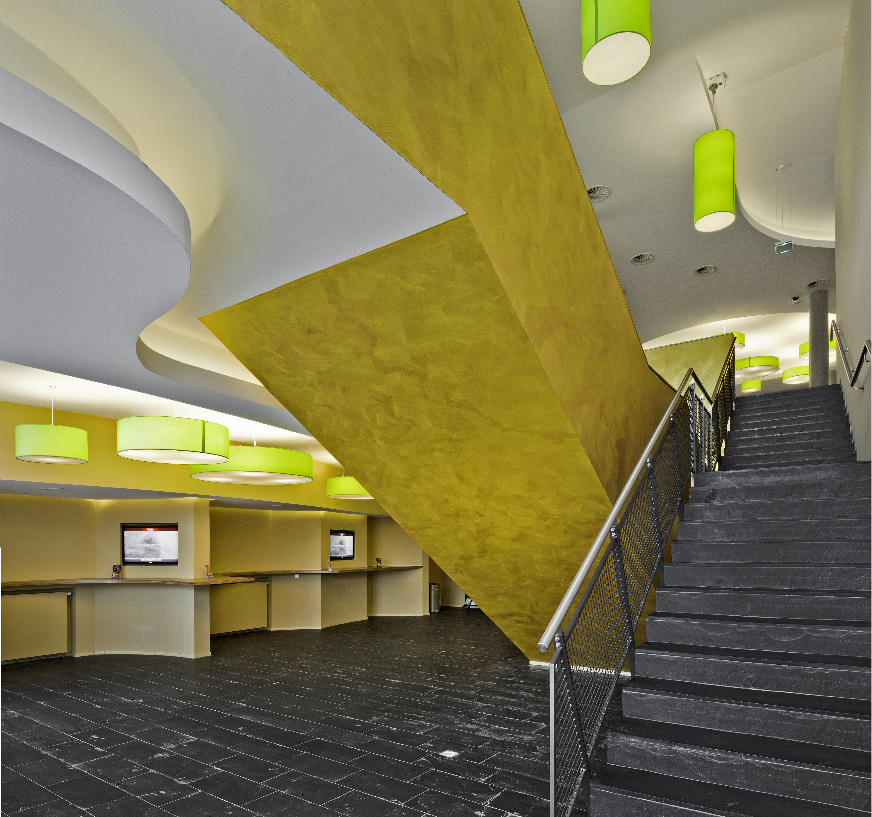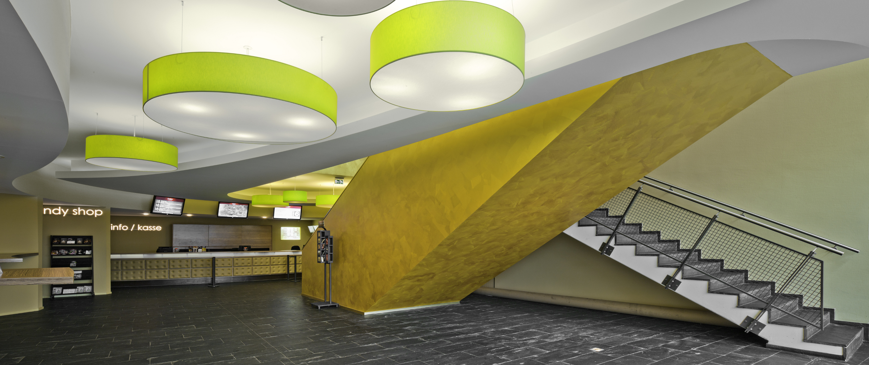 (pressebox) (Ober-Ramstadt, 10.01.2014) An keinem anderen Ort lässt es sich so gut in andere Welten eintauchen wie im Kino. Im besten Fall trägt schon das Ambiente des Lichtspielhauses dazu bei, dass die Zuschauer den Kinobesuch als Ausflug ins Reich der Fantasie und in die glamouröse Filmwelt erleben – wie im neu gestalteten Cineplex in Singen: Cremefarbene Wände und ein schwarzer Schieferboden in der Eingangshalle sowie im ersten Stock bilden den edlen Rahmen für das geradezu magisch leuchtende Gold an den Treppenaufgängen. „Wir wollten die Kinobesucher zum Träumen bringen“, erklärt Architekt Jürgen Presser von der Architektengruppe Numerobis, der im Auftrag der Cineplex Singen GmbH & Co. KG das Muliplexkino renoviert hat. „Dazu passt Gold natürlich hervorragend.“