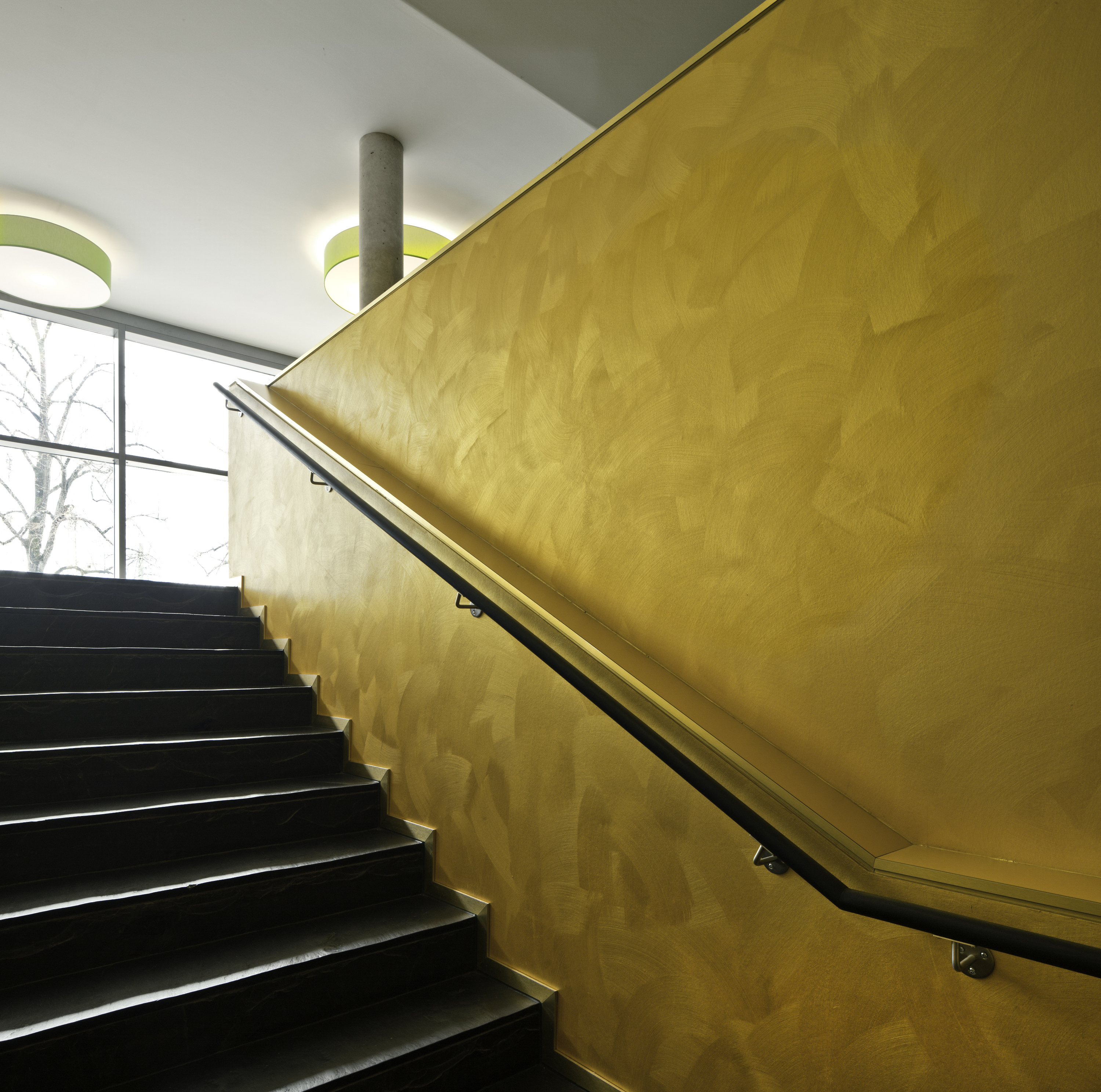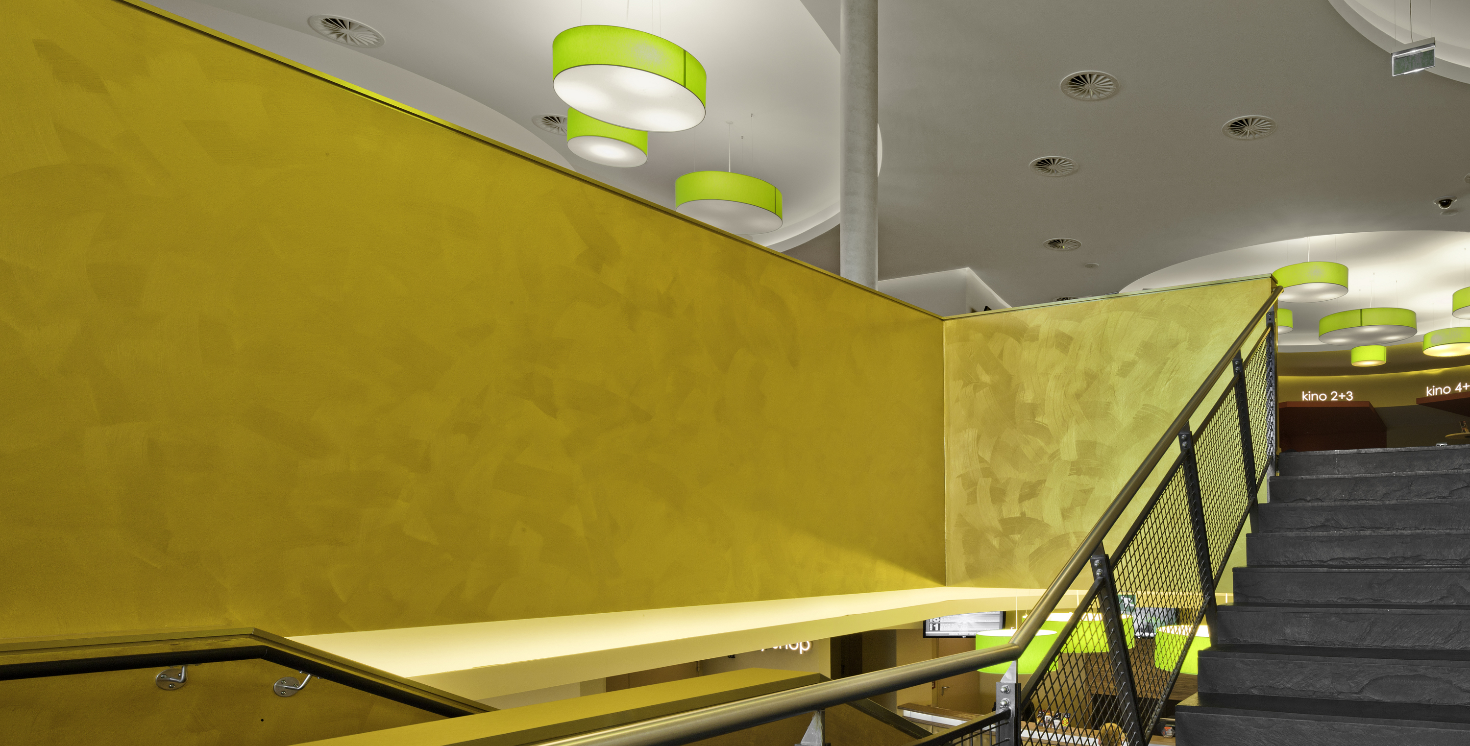Im Cineplex Singen hat Maler Markus Giner im gesamten Eingangsbereich zunächst vollflächig ein GlasVlies von Caparol auf den Rigips-Untergrund der Wände aufgebracht, um eine hochwertigere Wandoberfläche zu erhalten. Der Großteil des Foyers samt Kassenbereich und der erste Stock vor den Eingängen zu den Kinosälen wurden cremefarben gestrichen. Als Farbakzente wurden die Treppenaufgänge mit abgetöntem EffektGrund und CapaGold beschichtet, anschließend wurde die Goldoberfläche mit der Bürste nachstrukturiert. Die Bürstenschläge sorgen für changierende Lichtreflexe und ein luxuriöses Schillern der goldenen Wände. „Die Verarbeitung ist etwas aufwendiger, aber das Ergebnis ist dann auch entsprechend schön“, findet Giner. „Das Gold ein richtiger Blickfang im Kino.“