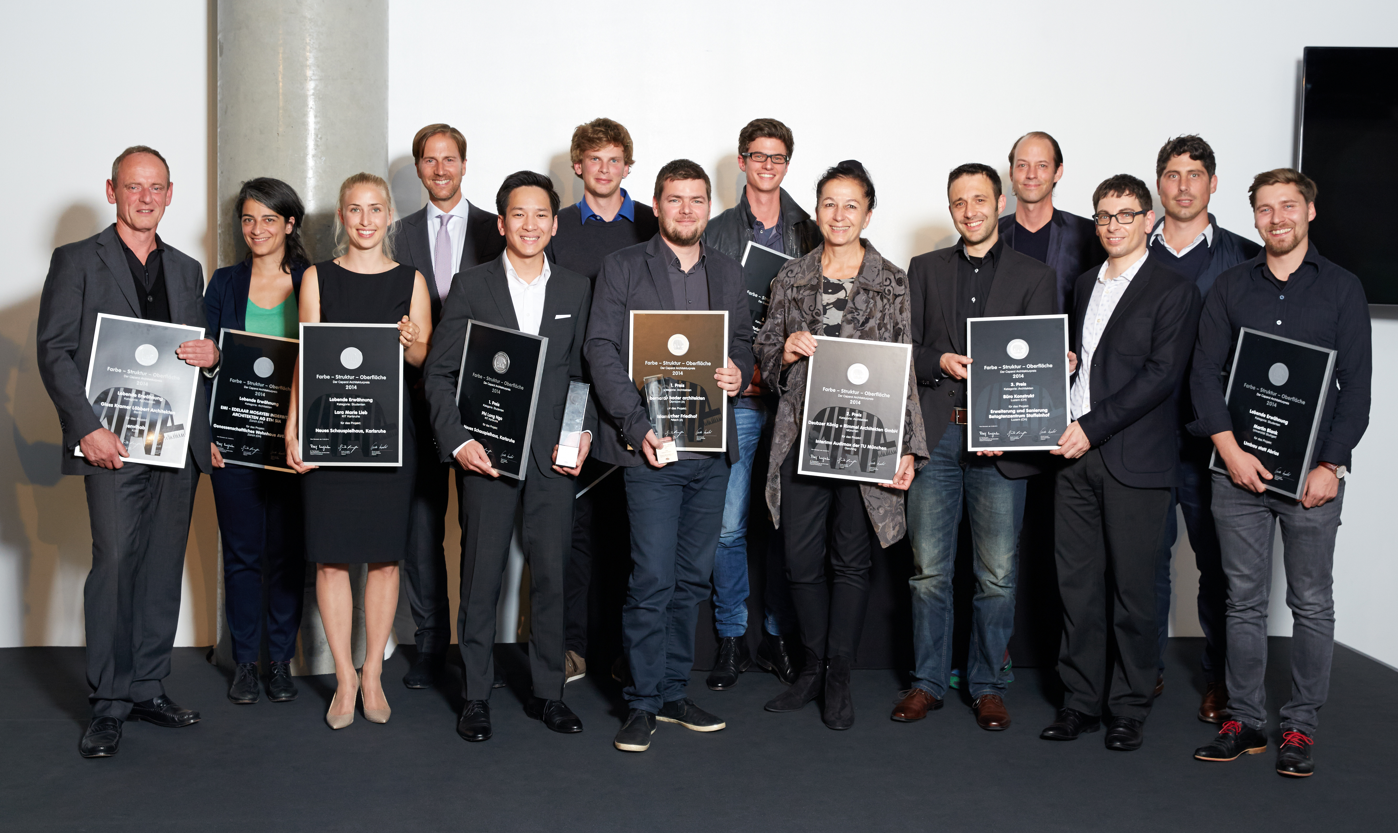 Glückliche Gewinner bei der Preisverleihung am 10. September 2014 (von links): Jürgen Ochernal (Glass Kramer Löbbert Architekten bda mit Prof. U. Graff Architektin bda), Elli Mosayebi (EDELAAR MOSAYEBI INDERBITZIN ARCHITEKTEN AG ETH SIA), Lara-Maria Lieb (KIT Karlsruhe), Dr. Ralf Murjahn (Caparol-Firmengruppe), Phi Long Ngo (KIT Karlsruhe), David Weber (Universität Stuttgart), Bernardo Bader (Bernardo Bader Architekten), Christoph Dörrig (Universität Stuttgart), Prof. Hannelore Deubzer (Deubzer König + Rimmel Architekten GmbH), Samuel Sieber (BÜRO KONSTRUKT), Nils Buschmann (ROBERT NEUN), Carlo Zampieri (BÜRO KONSTRUKT), Tom Friedrichs (ROBERT NEUN) und Martin Blank (Universität Stuttgart)