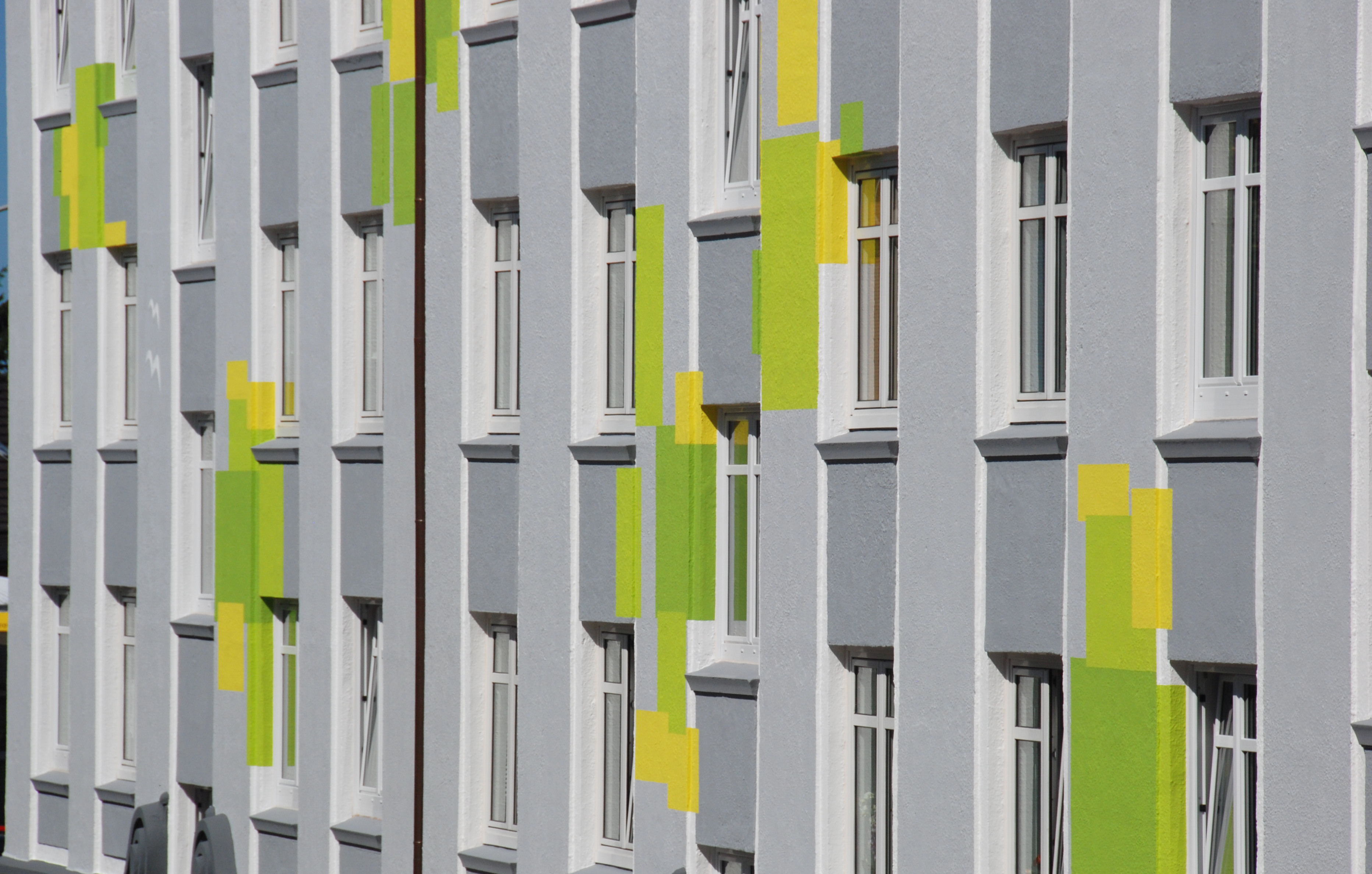 Der aus fünf Häusern und insgesamt 46 Wohnungen bestehende Gebäudekomplex der Wohnstätten Cuxhaven eG stammt aus dem Jahr 1930. Er steht direkt an einer Hauptdurchgangsstraße in Cuxhaven - ein auffallendes belebtes Objekt, schon von weitem zu sehen. Umfangreiche Modernisierungs- und Instandsetzungsarbeiten, wie die Erneuerung der Heizungsanlage, die seit einigen Jahre liefen, fanden in der Fassadengestaltung Ende August 2014 ihren Abschluss. Da für die Installierung von Sonnenkollektoren auf dem Dach zur Warmwasserbereitung und Heizungsunterstützung war ohnehin ein Gerüst gestellt werden musste, bot es sich an, Instandsetzungs- und Gestaltungsarbeiten an der Fassade vorzunehmen. Eine gute Entscheidung, denn seit 1930 war die Fassade zwar immer wieder überstrichen, doch nie richtig saniert worden. Und so fanden sich insgesamt neun Schichten in drei verschiedenen Farben an der Fassade, zudem wies der Putz Risse auf. Die große Frage war nun: Wie lässt sich die Farbe von 84 Jahren entfernen? Maler- und Lackierermeister Torsten Süß (Rudolf Süß oHG, Malerei & Gerüstbau) hatte die Lösung: Mit seinem 500 bar Heißwasser-Hochdruckreiniger ließen sich die alten Farbschichten effektiv entfernen. Maurer sanierten den freigelegten Putz und dann waren die Maler wieder dran: Sie brachten den faserverstärkten Rissgrund FibroSil zur Überarbeitung von Putzrissen auf, bevor die gesamte Fassadenfläche mit der hochdiffusionsfähigen Siliconharz-Fassadenfarbe Muresko SilaCryl im Spritzverfahren zwei Mal beschichtet wurde. Es war eine Grundsatzentscheidung der Wohnstätten Cuxhaven eG von dem bisherigen elastischen Farbsystem zur diffusionsoffenen Farbe Muresko SilaCryl zu wechseln. Hier sorgt das Zusammenspiel der Basiskomponenten Siliconharz und Reinacrylatdispersion für sehr guten Feuchteschutz und Wetterbeständigkeit sowie Kreidungsstabilität, Haftvermögen sowie eine hohe Farbtonstabilität. Muresko SilaCryl hat einen hohen Wasserdampf- und ausreichenden CO2-Durchgang, was das Raumklima im Gebäude begünstigt.