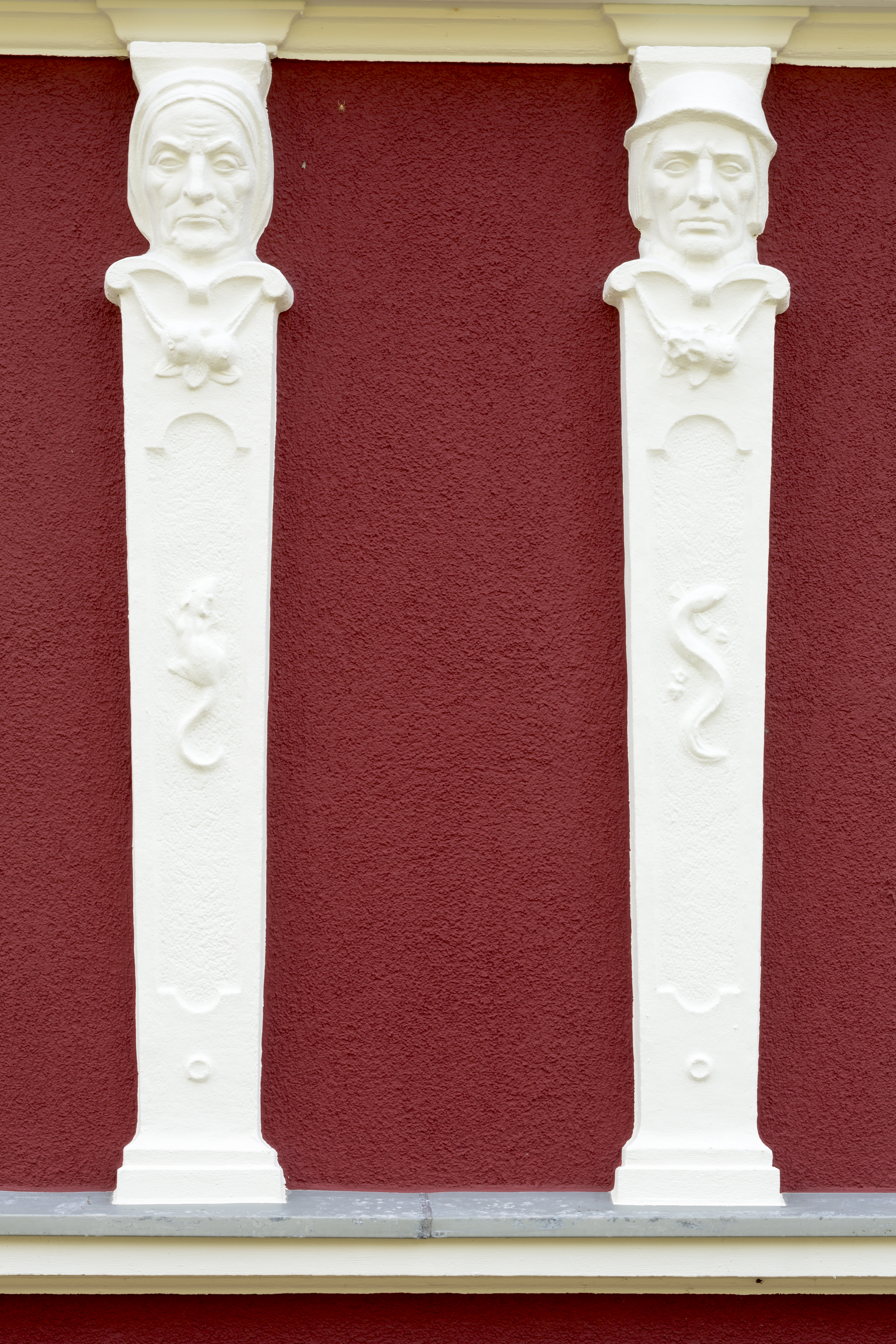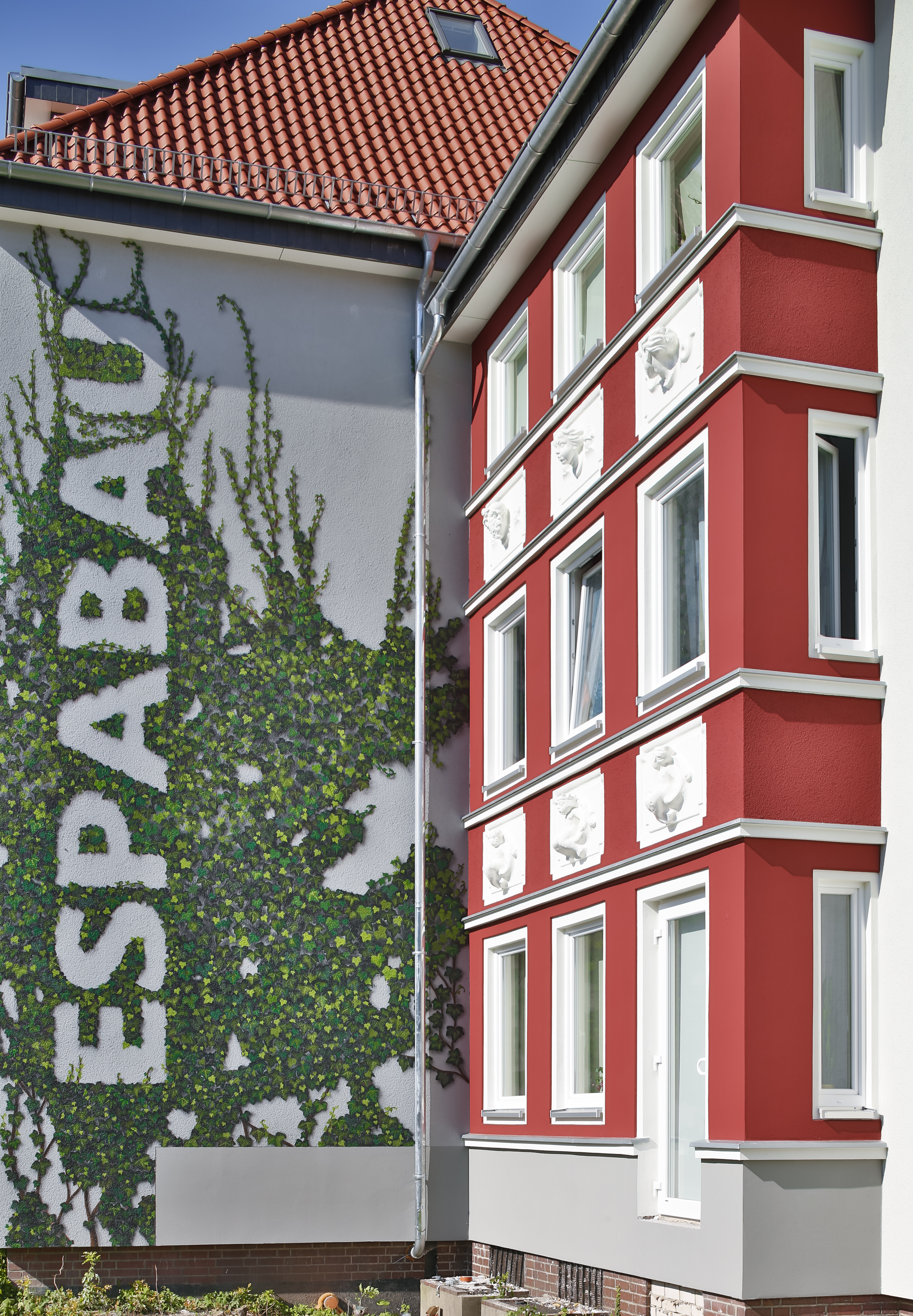 Der in den 1930er Jahre gebaute Häuserzug imponiert nicht nur durch seine geometrische Exaktheit, sondern insbesondere durch eine Vielzahl architektonischer "Kunstgriffe", die seine Attraktivität ausmachen. Gradlinigkeit wird durch Rücksprünge unterbrochen, schlichte Fassadenteile wechseln mit reich geschmückten Außenwandflächen. In die Vorbereitung des in vier Bauabschnitte gegliederten Vorhabens bezog die ESPABAU deshalb von vornherein Industrie und Verarbeiter ein. Vor Ort wurde entschieden, welche Fassadenprofile aus dem Standardangebot von Caparol genutzt werden sollten und wo die geschickten Hände des Stuckkateurs gebraucht wurden. Die Handwerker nahmen insbesondere den figürlichen Schmuck in ihre Obhut. Die mit dekorativem Strukturputz versehene Capatect Wärmedämmung erhielt nach dem "hausgemachten" Entwurf einen Anstrich mit AmphiSilan in grauem Grundton und roten Absetzungen, der den architektonischen Intentionen folgt.