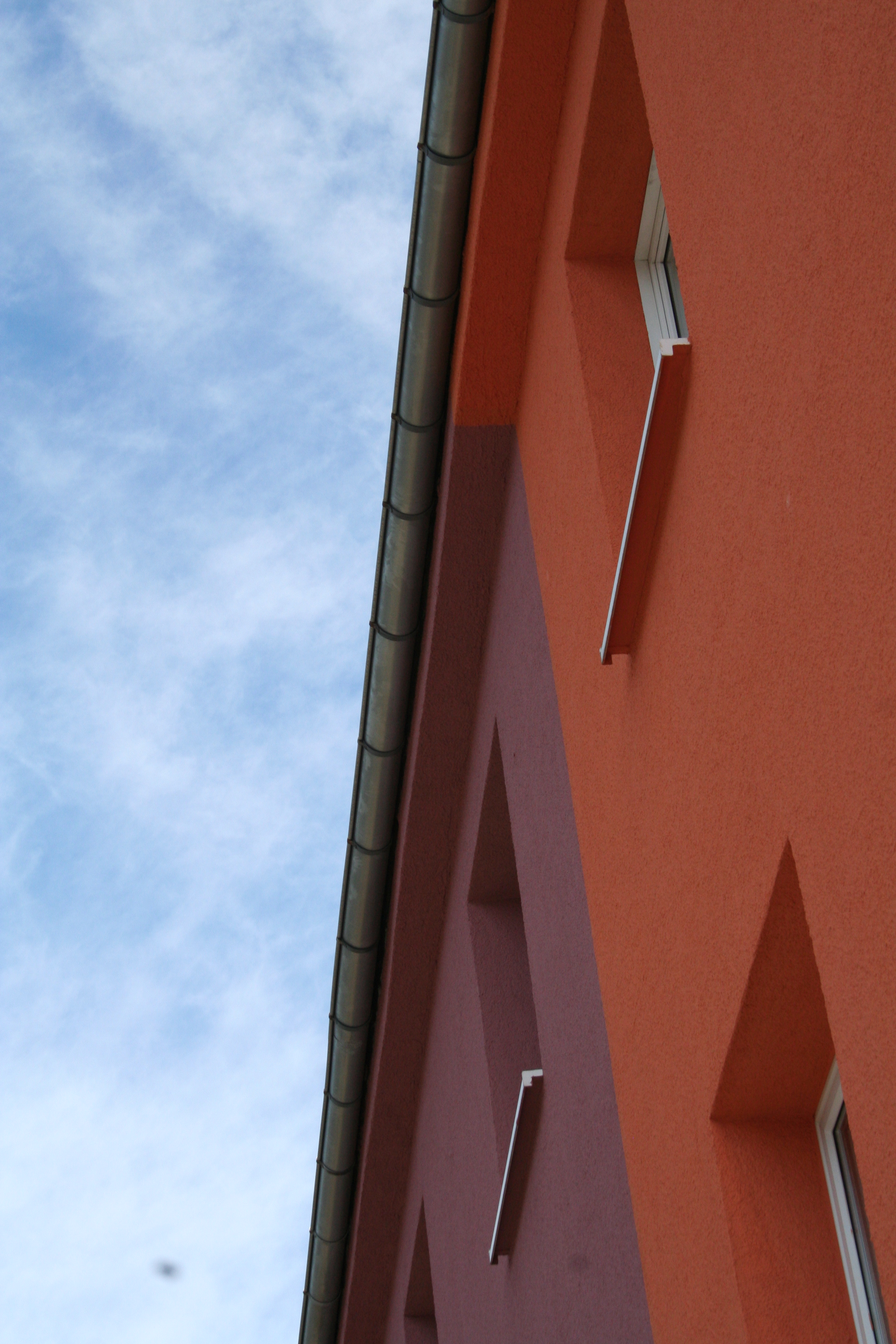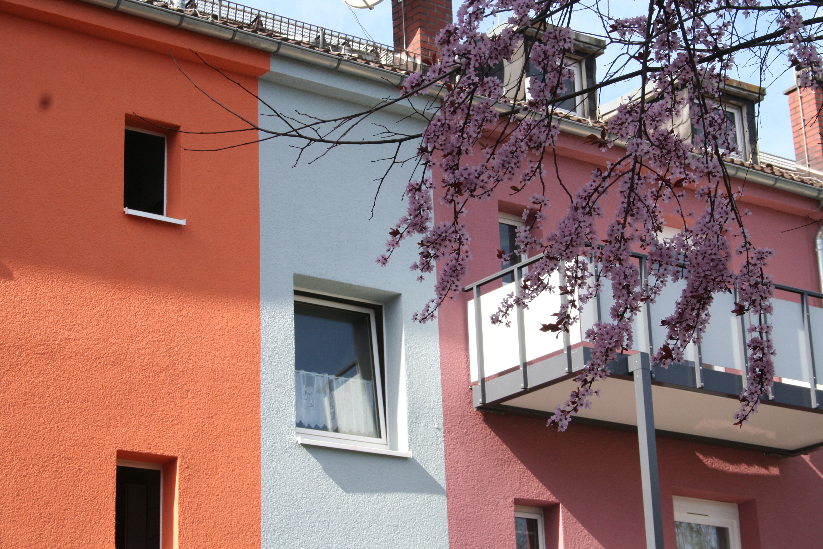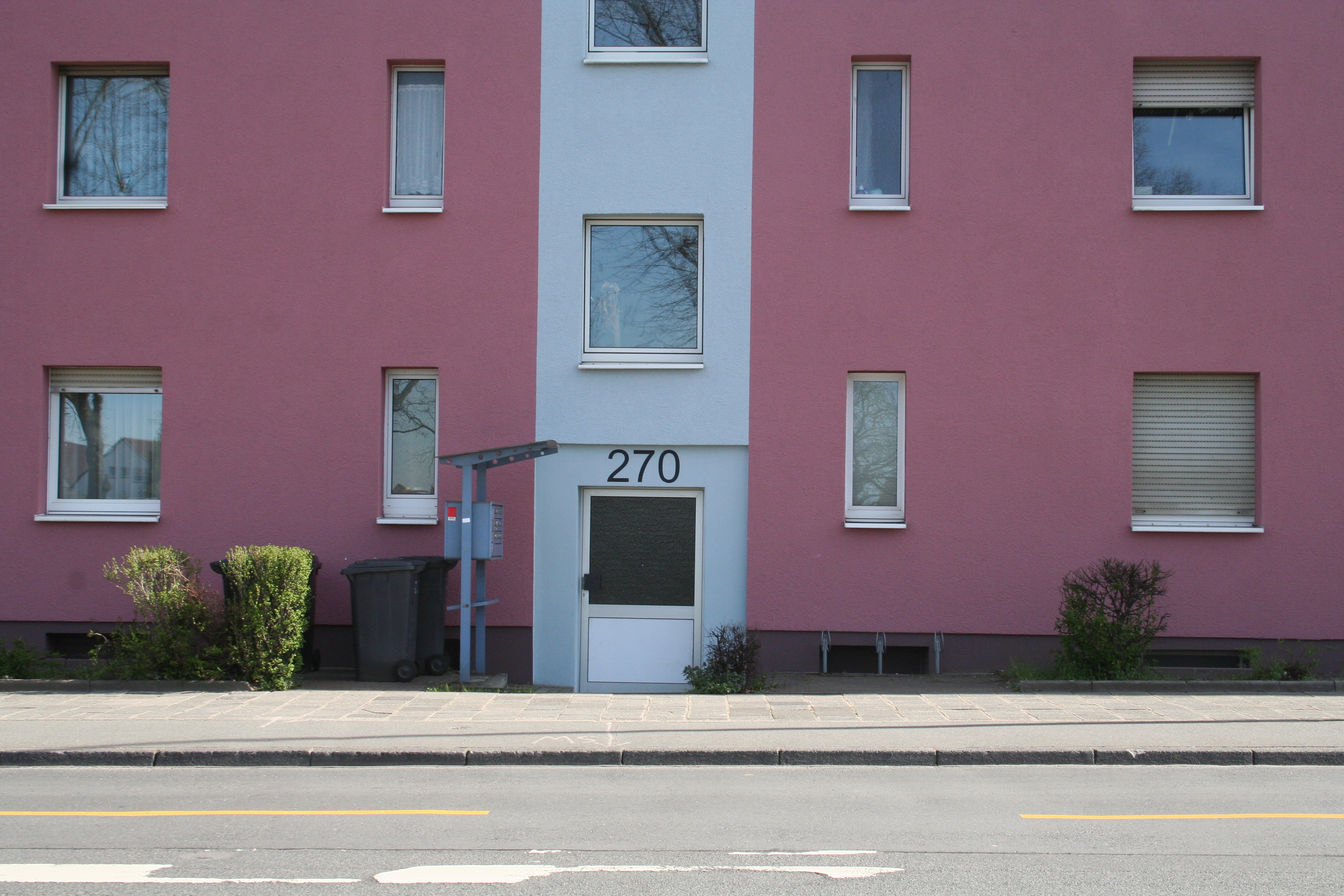 Wer den grauen, immer mehr verfallenden Darmstädter Südbahnhof verlässt, wird nach wenigen Schritten mit einem erfreulicheren Anblick belohnt. Sogar an Nebeltagen fällt die Gebäudezeile auf der gegenüberliegenden Straßenseite durch ihre dynamische, unregelmäßig wiederholte Farbkombination auf. Unwillkürlich beginnt man, die Komponenten zu zählen. Es sind derer sieben, wobei sich die Haupttöne im roten bis rotvioletten Bereich bewegen: Barolo und Arctis in jeweils zwei Abstufungen, Aprico, Papaya und Grenadine.