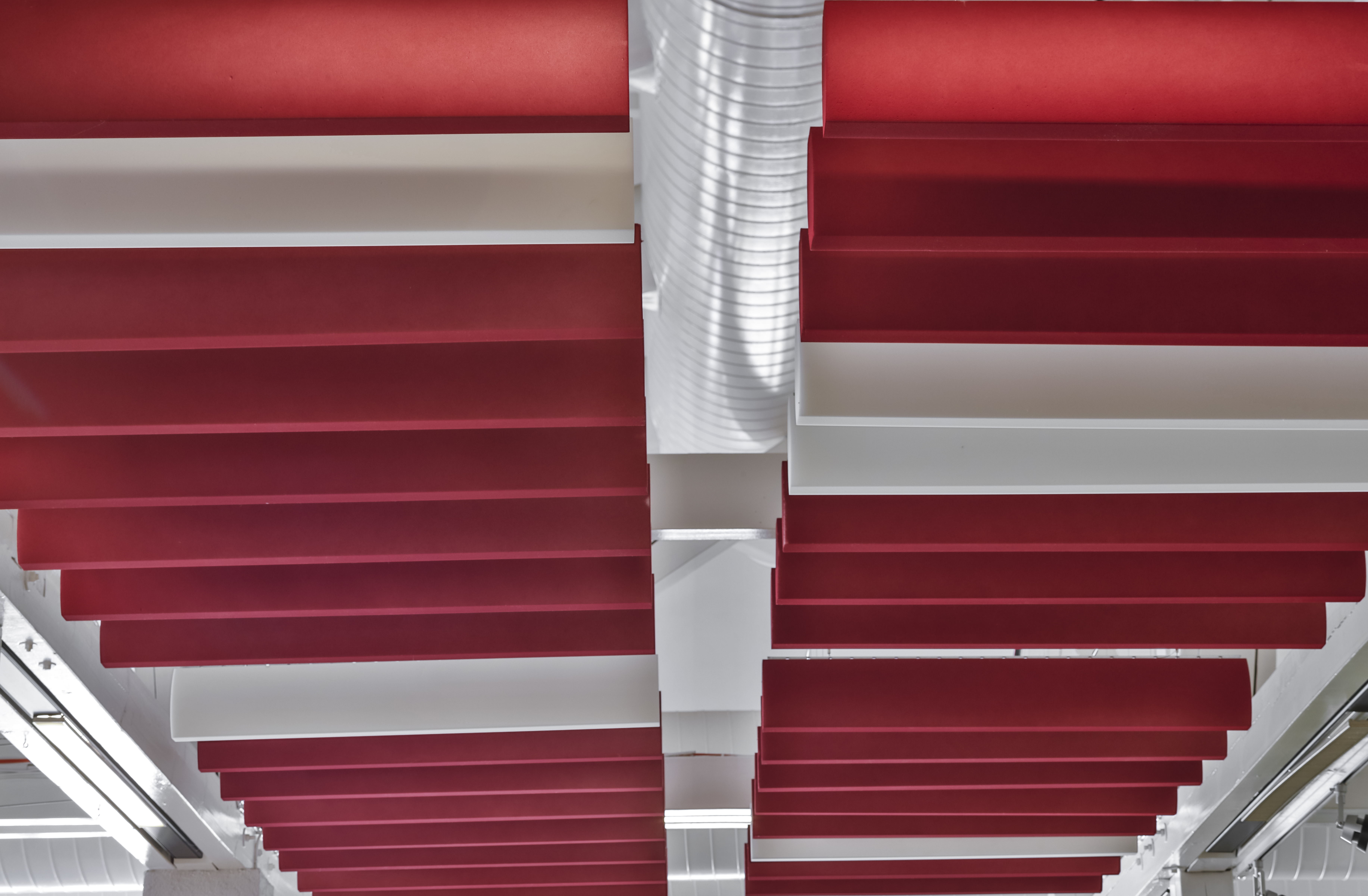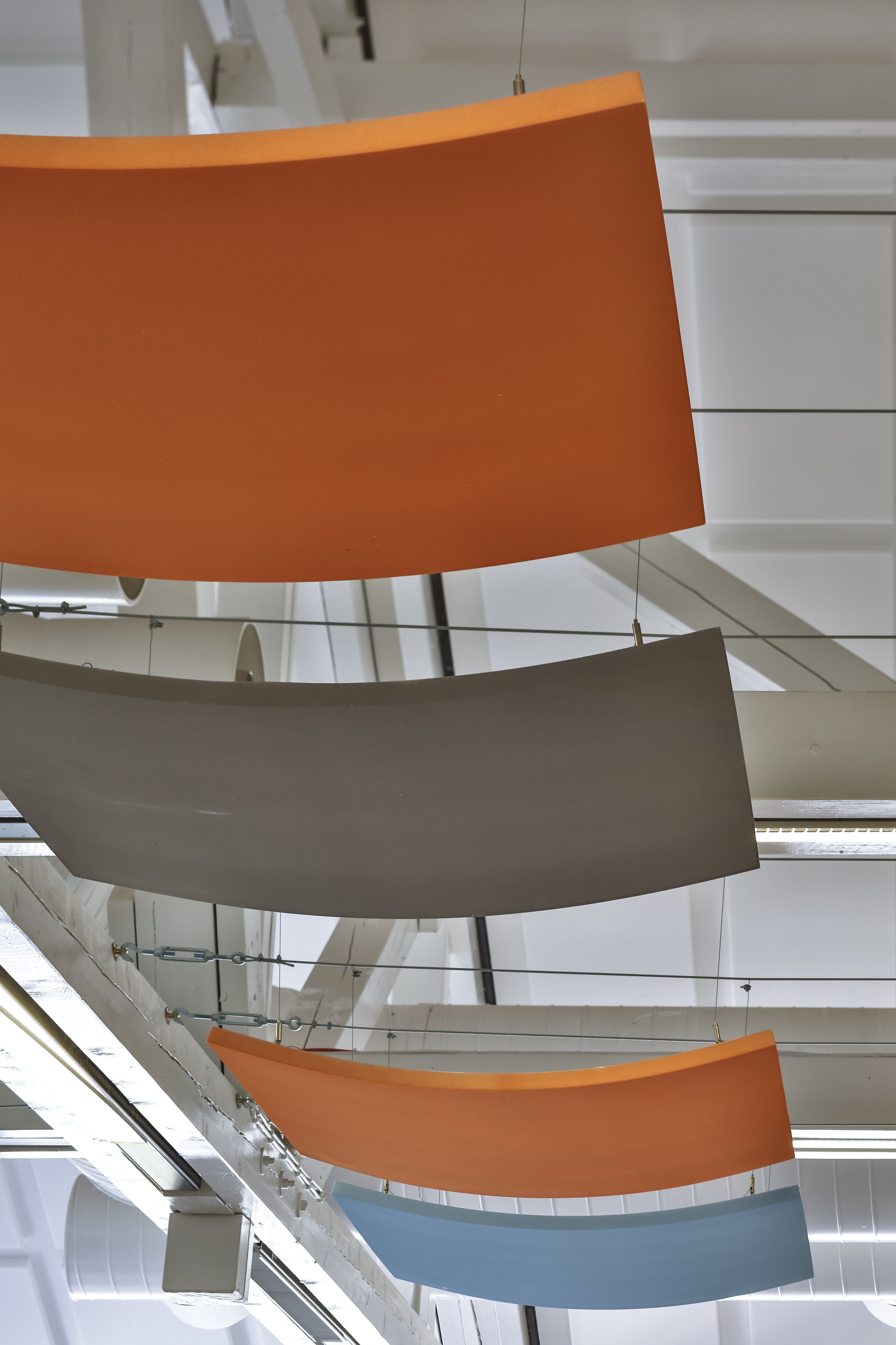 Das Gestaltungskonzept, das die Akustikmaßnahmen sehr gut veranschaulichte, beeindruckte die Verantwortlichen im Berufsbildungswerk durch die gelungene Kombination und Anordnung unterschiedlich farbiger und geformter Akustikelemente. Zum Einsatz kamen drei verschiedene Elemente aus dem CapaCoustic Melapor-System: walzenförmige Baffle, konkave und konvexe Deckensegel sowie glatte Panel. Sie alle bestehen aus einem duroplastischen, elastifizierten Weichschaumstoff auf Melaminharzbasis, der dank seiner filigranen offenzelligen Struktur den Raumschall optimal absorbiert. Die Melapor-Elemente können bis zu 90 Prozent der auftreffenden Schallenergie aufnehmen und abbauen. Sie sind in der Schallabsorberklasse A eingestuft, vergilben nicht und laden sich nicht statisch auf, weshalb sie keinen Staub anziehen. Baffle und Deckensegel werden abgehängt, die Panel dagegen – wie in Karben an den Giebelflächen – direkt bauseitig mit einem Spezialkleber verklebt. „Mit den Panels konnten wir ein optimales Preis-Leistungsverhältnis erzielen. Außerdem haben wir uns im Giebelbereich für die Panel entschieden, weil wir die offene Fachwerkkonstruktion nicht verdecken wollten“, erläutert Wolfgang Eberhard.