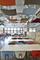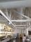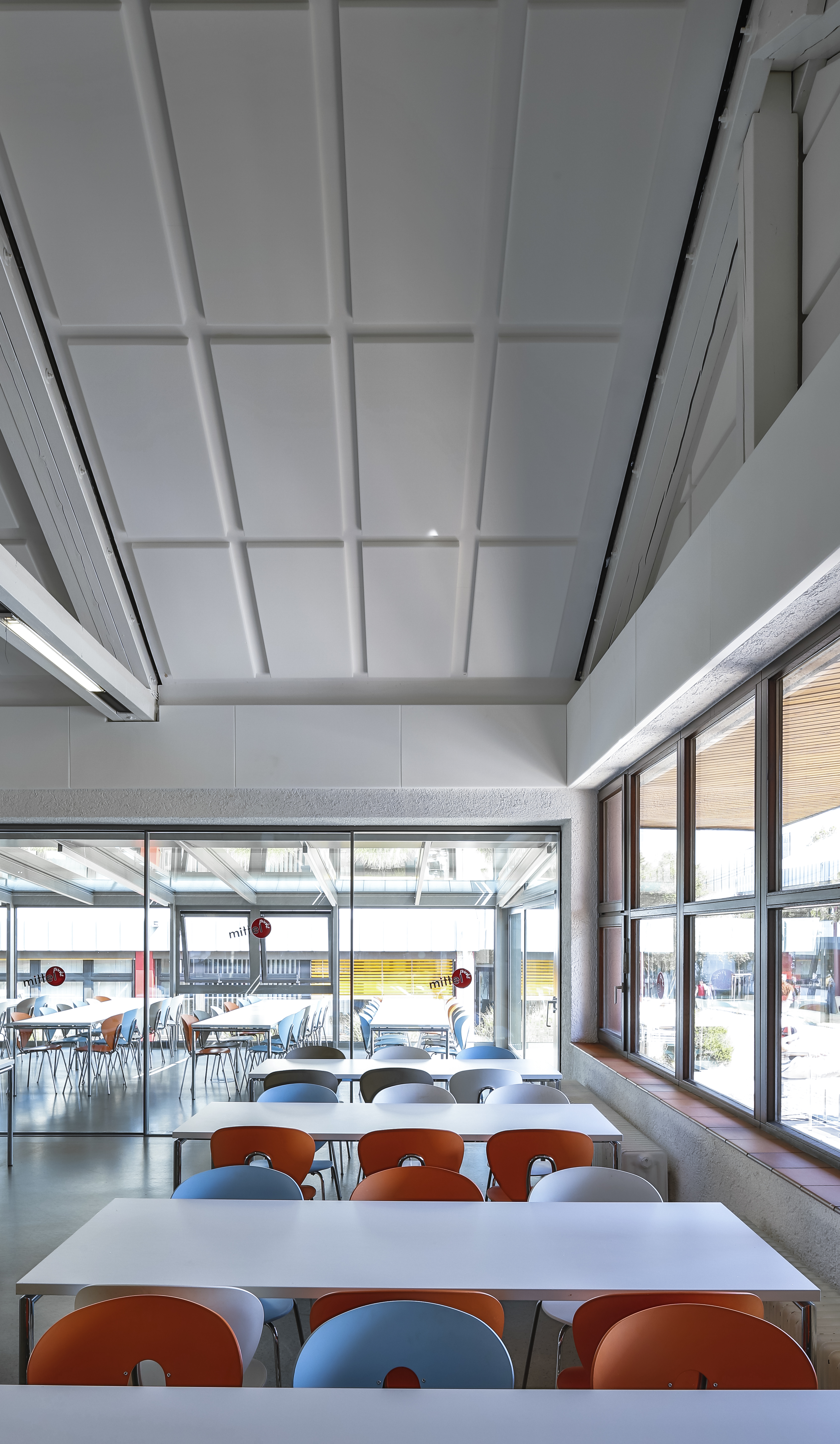 In besonders lärmintensiven Bereichen wie vor dem Tresen der Essensausgabe erhielten die an der Decke verklebten Panels Verstärkung durch abgehängte Baffle und Deckensegel. Ein kreatives Gremium bestehend aus Auszubildenden und Fachkräften befasste sich mit der genauen Anordnung dieser Elemente im Raum. Andreas Ziesing erläutert: „Wir haben mit den unterschiedlichen Melapor-Elementen ganz bewusst Bereiche markiert: Über die Essenausgabe und der Salatbar, also in einem Bereich, in dem viel Bewegung stattfindet, wurden die walzenförmigen Baffle an Metallschienen und -seilen abgehängt. Die Deckensegel mit ihrer dynamischen bewegten Formen sorgen über den Esstischen für gedämpften Schall.“