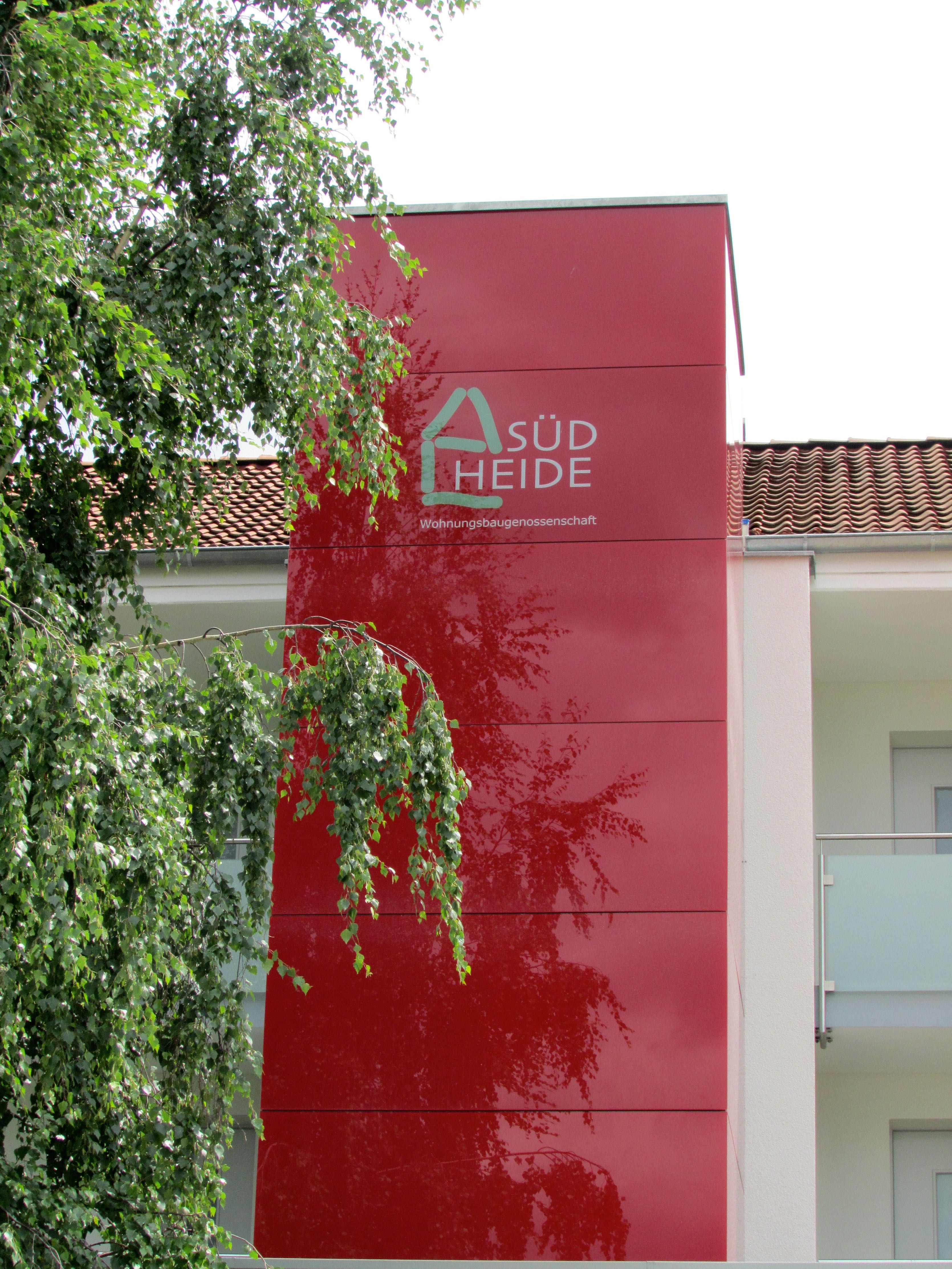 Das Schaufenster der Wohnanlage ist der im System „Airtec Glassic“ gestaltete Giebel der Wilhelm-Deecke-Str. 2, bei dem das im Digitaldruck auf das Glas aufgebracht Logo der Genossenschaft hinterleuchtet wird. Eine Acrylplatte verhindert, dass die hinter dem Glas installierten LED-Lampen die Fläche punktuell beleuchten. So ist bei Dunkelheit die Visitenkarte der Genossenschaft in rot-violetter Originalfarbe der Südheide als Symbol für zeitgemäßes modernes Wohnen weithin wahrnehmbar. Um den finanziellen Aufwand in Grenzen zu halten, sorgt an anderer Stelle Außenbeleuchtung dafür, dass das Logo als Markenzeichen der Wohnungsbaugenossenschaft auch nach Einbruch der Dunkelheit sichtbar bleibt. Lobende Worte fand Dieter Giemenz für die Wolfenbütteler Firma Hibbeln Gmbh, die die Glasfassaden nahtlos in das Capatect-WDVS eingebunden hat, und die für die Wärmedämmung zuständigen Celler Firmen Malerbetrieb Nowatschin und Christian Meyer GmbH sowie die Horst Matejat GmbH aus Bergen.