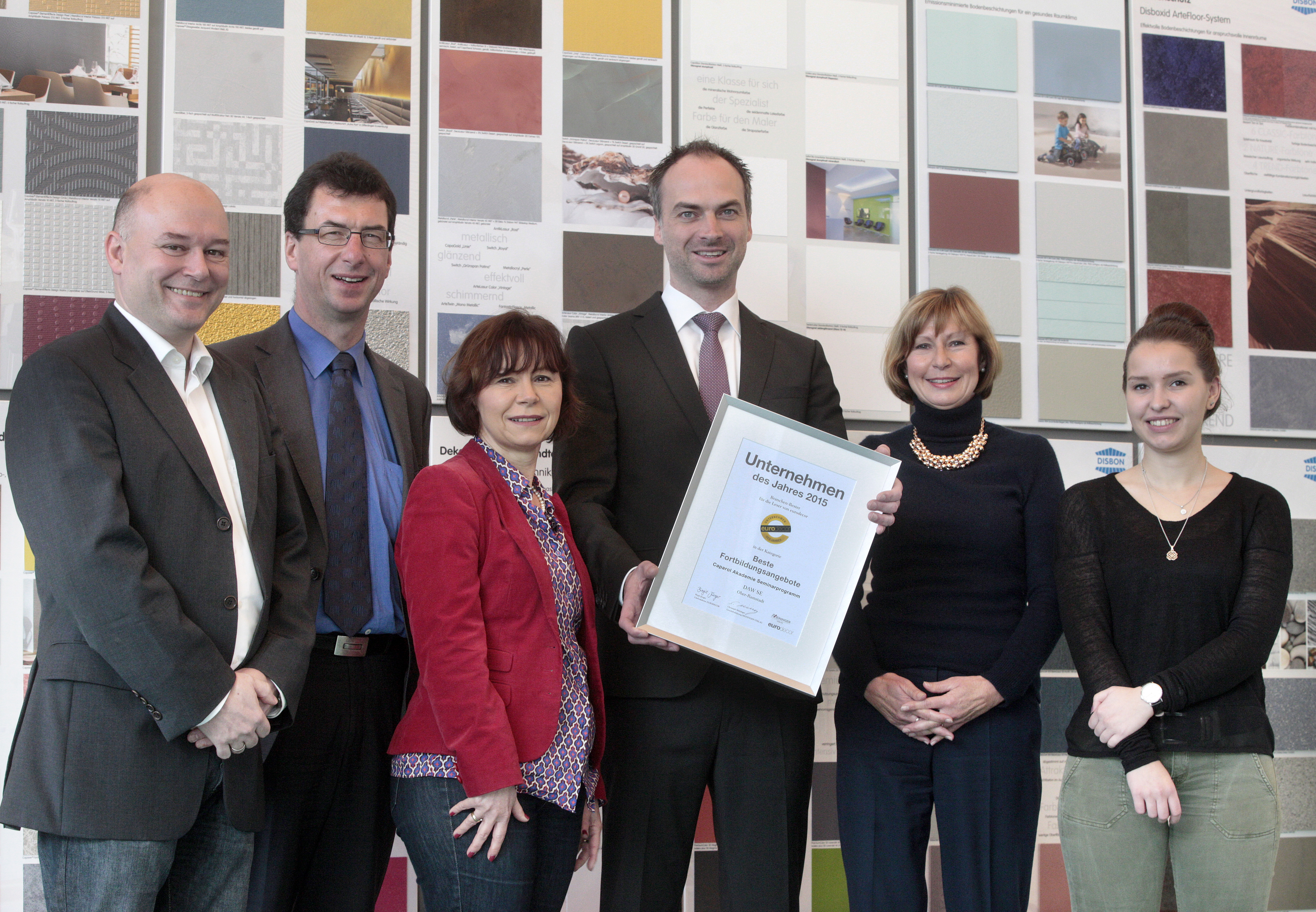Die jüngste Auszeichnung erhielt die Caparol Akademie von der Zeitschrift „eurodecor". Im Rahmen der Umfrage „Unternehmen des Jahres 2015" attestierten deren Leser der Akademie jetzt einmal mehr „Beste Fortbildungsangebote". Am 21. Dezember übergab Ute Schader von der Caparol-Presseabteilung die Urkunde im Namen der eurodecor-Redaktion.