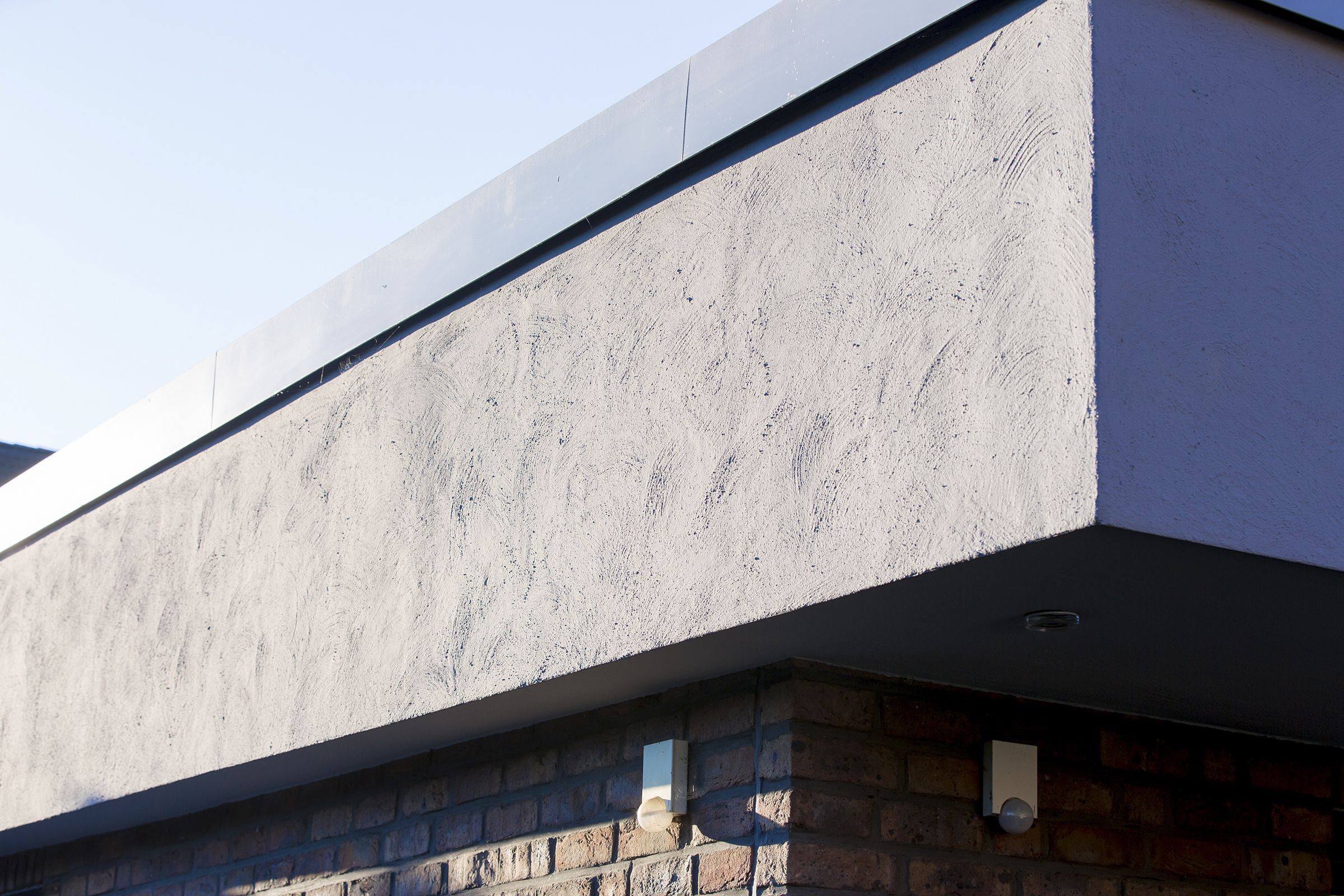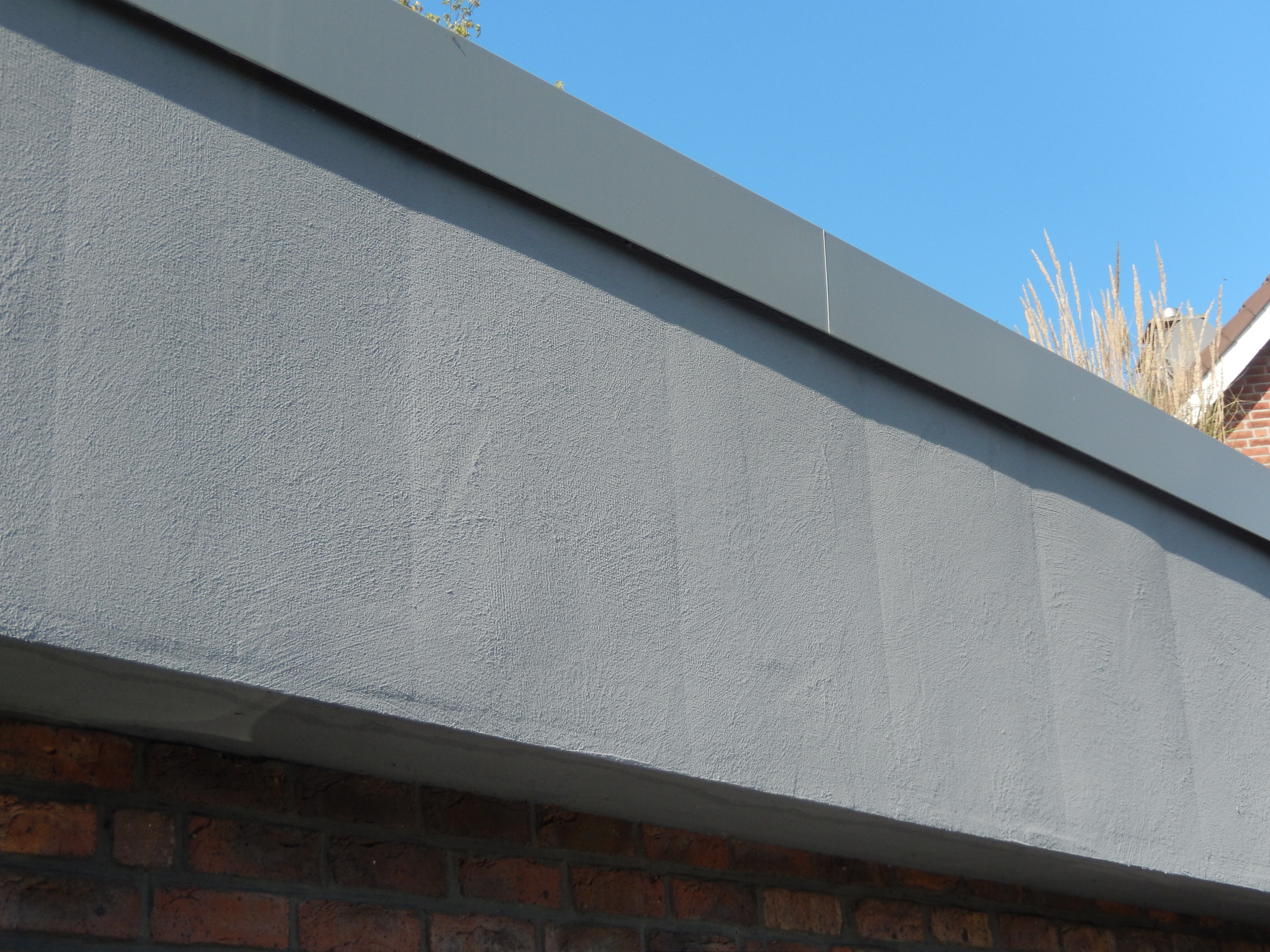 Gemeinsam mit dem Neusser Malermeister Thomas Welter wurde nach einer passenden Lösung gesucht. „Eine großflächige Verblendung der Attika mit Metallblech oder Schiefer kam nicht in Frage“, erinnert sich Unsel. Das wäre bei einer Gesamtlänge der Attika von 56 Metern und einer Höhe von 80 Zentimetern sowohl sehr kostspielig als auch gestalterisch nicht im Sinne des Bauherrn gewesen. Deshalb ging man einen anderen Weg, bei dem eine Tropfkante ausgebildet werden konnte und zugleich ein kreativer Verputz der Flächen mit individuell gestalteten Oberflächentexturen möglich war.