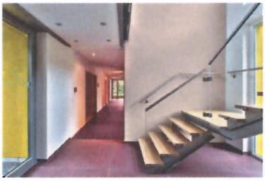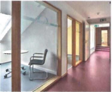 Gleich hinter der Eingangstür erinnert der mit dunkelrotem Linoleum ausgelegt Flur an einen „roten Teppich" für die Prominenz. Das satte Weinrot wird auf die hellen Wandflächen reflektiert und verleiht dem Flur einen warmen freundlichen Charakter. Auf der Flurachse laden kleine Plätze mit Sitzgelegenheit zum Verweilen oder zu kurzen Gesprächen ein. Farblich hervorgehoben werden diese kommunikativen Ankerpunkte mit einem lebendigen hellen Rot (30 Grenadin 100).