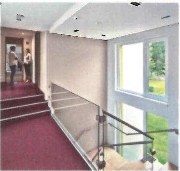 Der Architekt Heinz Jürgen Schneider hat Alt- und Neubau innen wie außen architektonisch sehr gelungen verknüpft. Ein wichtiger Aspekt war für ihn, dass sich die Gebäude harmonisch in die Umgebung einfügen. Beide Häuser sind durch einen kleinen Zwischenbau mit Treppenhaus verbunden - hier ist der zentrale Eingangsbereich.