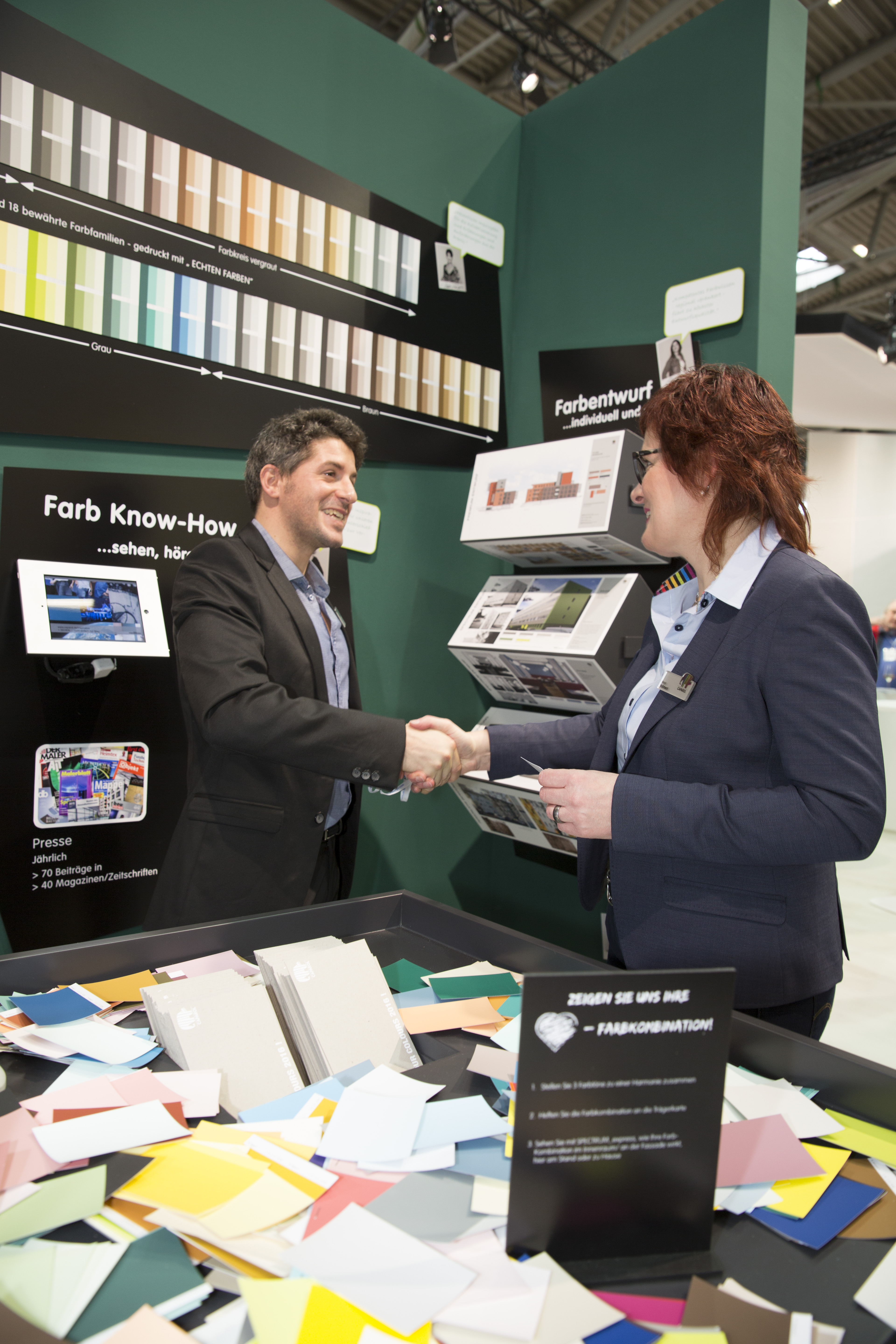 „Produktinnovationen in Kombination mit neuen Gestaltungsmitteln und -ideen eröffnen Inspirationen für hochwertige Oberflächen“, freute sich Marketingleiter Oliver Piontkowsky über das großartige Leistungsspektrum und die Servicevielfalt im Haus des Handwerks. Als idealen Einstieg für Kundengespräche hob er dabei nicht nur die Broschüre „Caparol Wunschfassaden“ mit kreativen Gestaltungsideen gerade für private Immobilienbesitzer hervor. Produktmanagerin Natascha Glenz erfuhr großen Zuspruch für neue dekorative Innenwandtechniken. In punkto Gestaltungskompetenz nutzten die Besucher die Möglichkeit, das Caparol-FarbDesignStudio (FDS) bei der Arbeit zu beobachten und hier neue Wege und umfassende Gestaltungsmöglichkeiten für sich zu entdecken. Jeder Besucher konnte unter Anleitung von FDS-Leiterin Margit Vollmert und Farbdesignerin Eva Helterhoff seinen persönlichen Farbklang zusammenstellen. Sie präsentierten den neuen CaparolColor Compact Farbtonfächer mit frischen, intensiveren Farbtönen und einzigartigen Echtfarben.