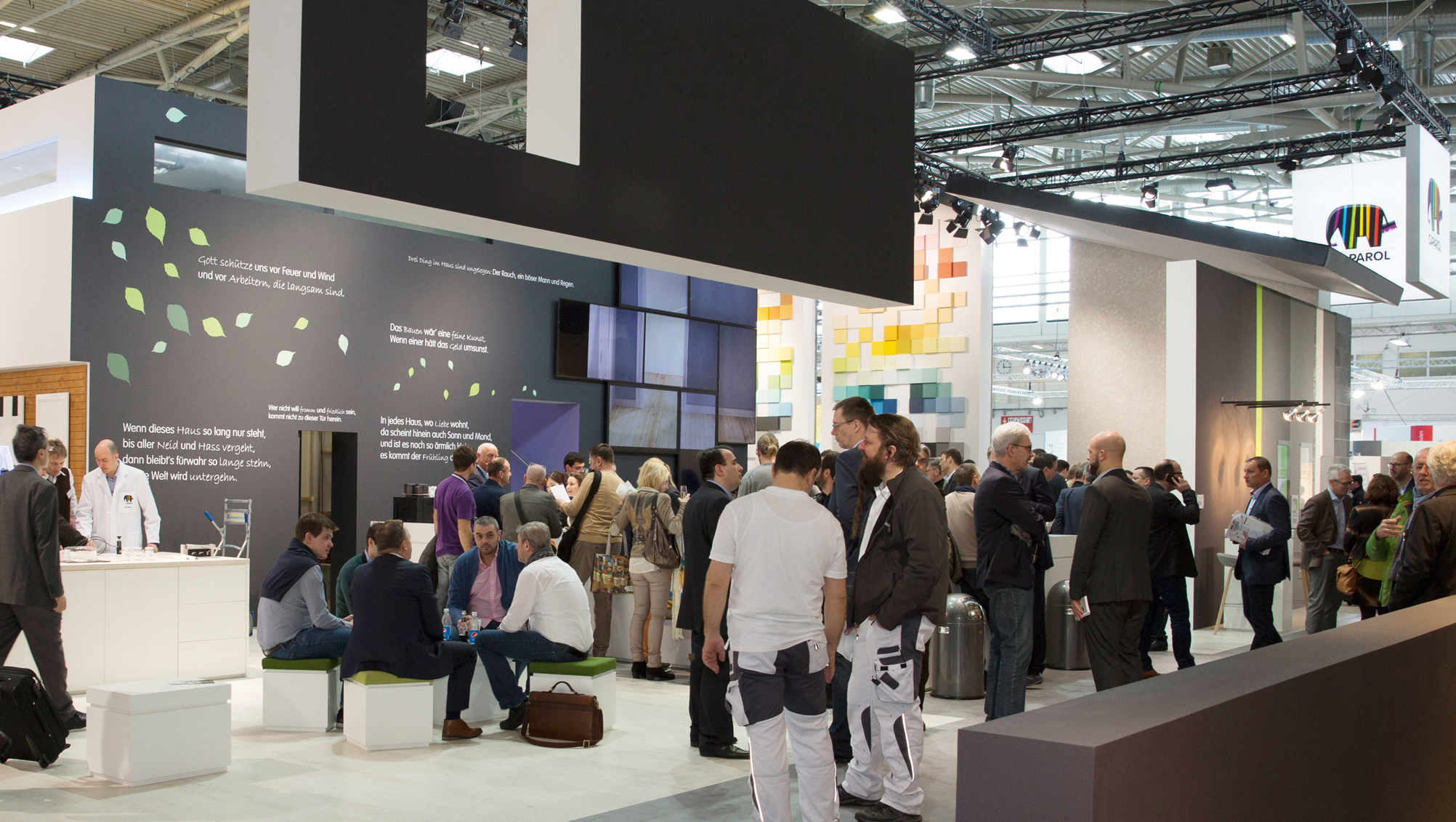 „Caparol hat dem Handwerk ein Haus gebaut, in dem sich jeder Maler, jeder Stuckateur sofort wohlfühlt und auch wiederfinden kann“, erläuterte Caparol-Messe-Projektleiter Tobias Becker das bemerkenswerte Standkonzept. Das spezielle Flair und eine betont offene, ausgesprochen phantasieanregenden Präsentation boten einen perfekten Rahmen für den gemeinsamen Dialog. Bemerkenswert war zum Beispiel die Baustellen-Atmosphäre im Cateringbereich mit Farbeimern und Sitzgelegenheiten aus gepolsterten Paletten. Sie waren Ton in Ton mit grünem Stoff bespannt, um die Verbundenheit des Bausektors mit der Natur zu signalisieren – natürliches Bauen und Gestalten zum Anfassen, Besitzen und Wohlfühlen.