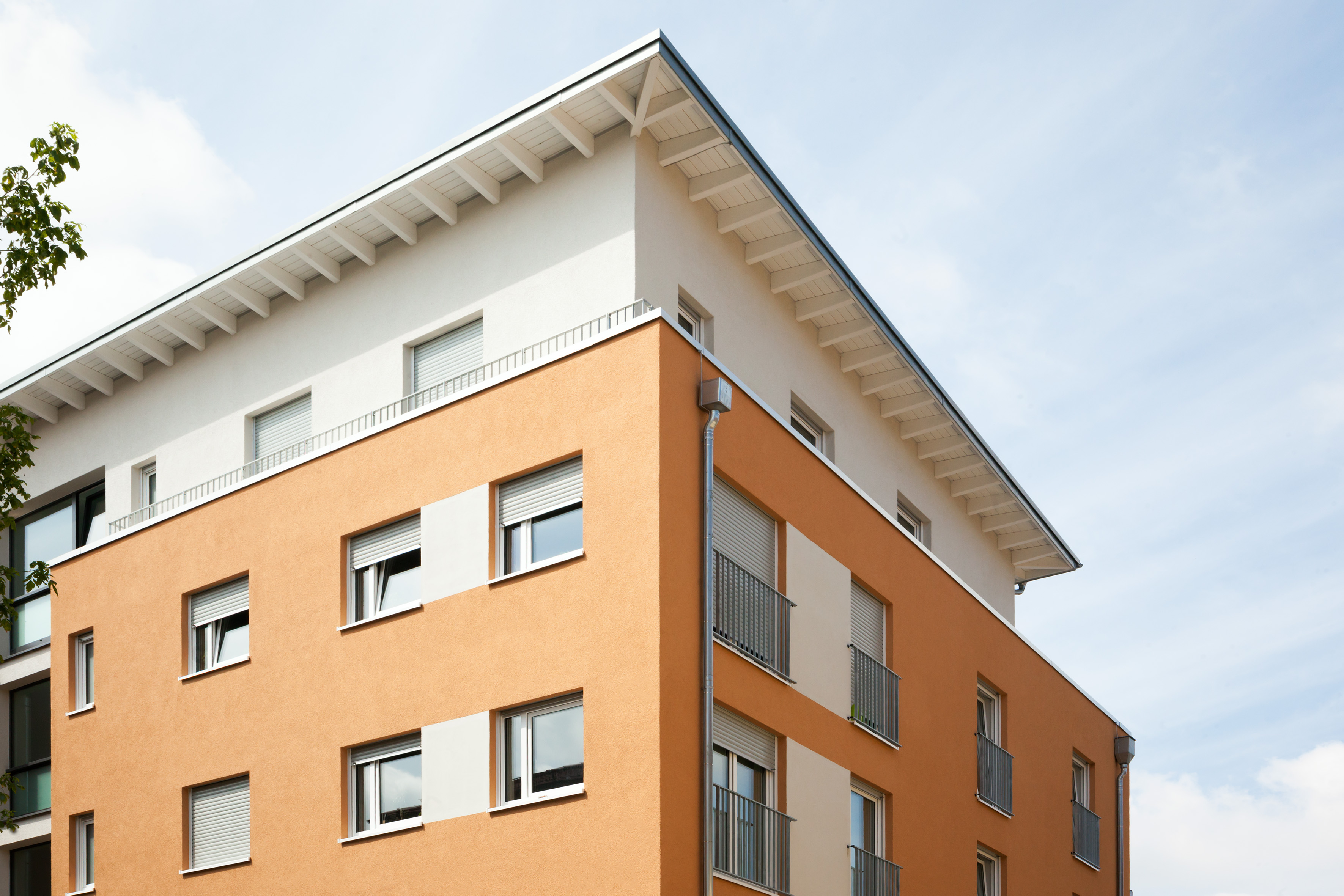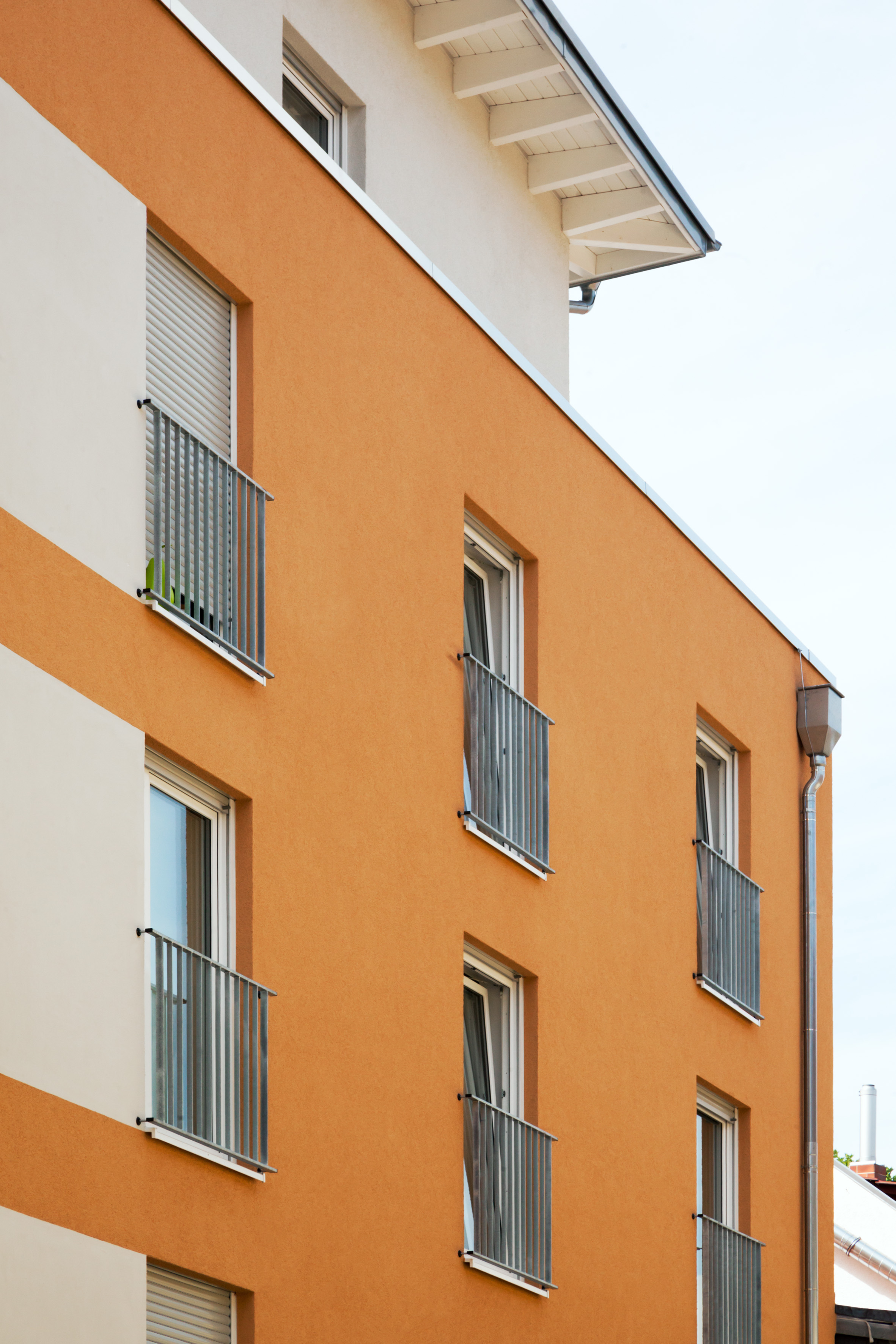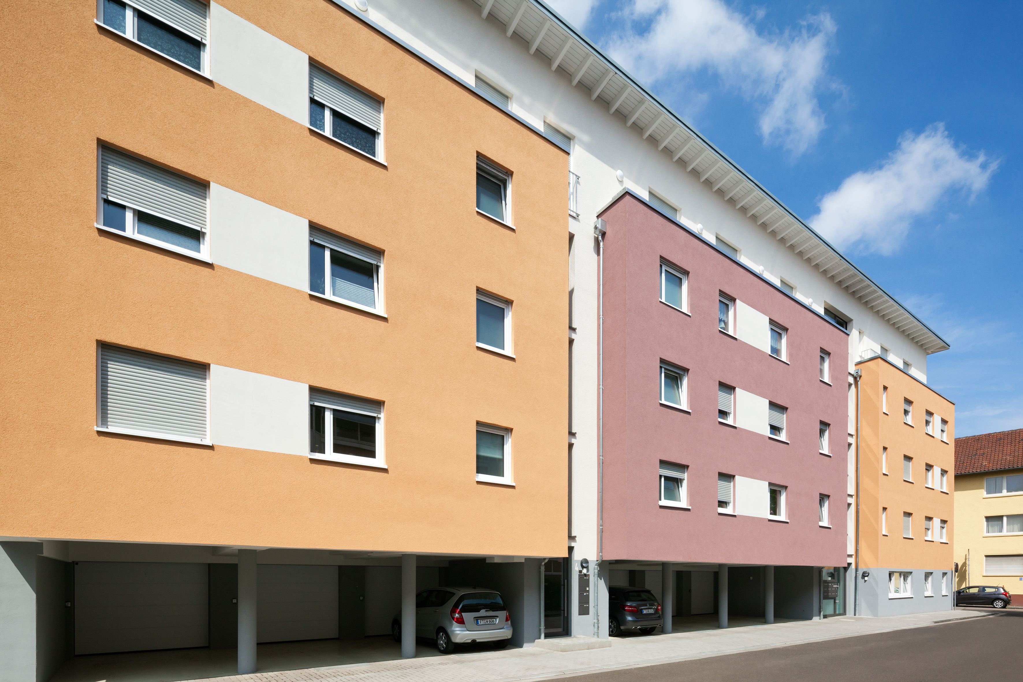 Die Fassade des viergeschossigen Baukörper mit aufgesetztem Staffelgeschoss wird zur Straßenseite durch zwei Treppenhäuser dreigeteilt. „Diese Dreiteilung greift das Farbkonzept auf“, so der Malermeister. Die beiden äußeren Gebäudeteile wurden in dem orangenen Farbton 3D Amber 75 verputzt. Der Mittelteil wurde mit dem rot-braun wirkenden 3D Grenadin 45 gestaltet. Eine zusätzliche Aufteilung erhielt die Fassade durch eine alternative Farbgebung des Erdgeschosses in einem hellen Grauton mit 3D Venato 30. Akzente setzt die Ausführung des Staffelgeschosses und der Eingangsbereiche im cremefarbenen 3D Curcuma 30, das die Fassadenflächen auch im Bereich von Fenstern durchbricht und auflockert.