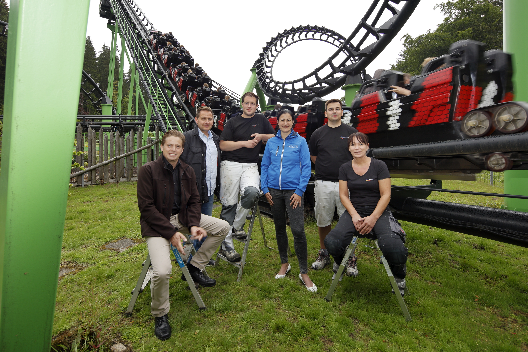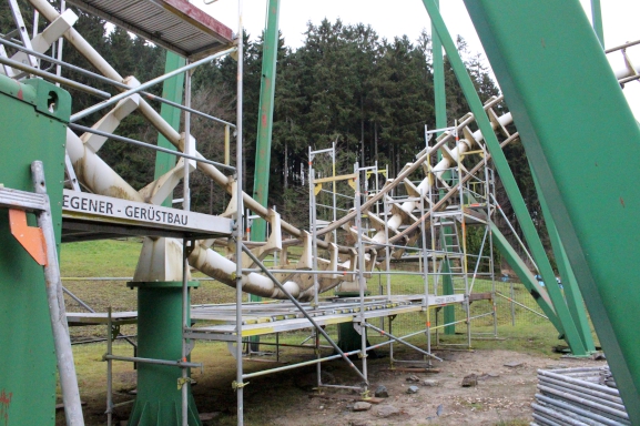 Doch nicht nur die Achterbahnfans brauchen hier Nerven wie Stahlseile: Auch Malermeister Andreas Stempel, Inhaber des ortsansässigen Malerfachbetriebs Becker, und seine Kollegen brachte die 1982 gebaute Attraktion ordentlich ins Schwitzen. Im Jahr 2013 hatte der Freizeitpark sie damit beauftragt, die Achterbahn zu reinigen und neu zu lackieren. Stattfinden mussten die Arbeiten in den Wintermonaten von 2013 auf 2014. Nur zu dieser Jahreszeit ist der Park für Besucher geschlossen und ein freier Zugang zu den Anlagen gewährleistet.