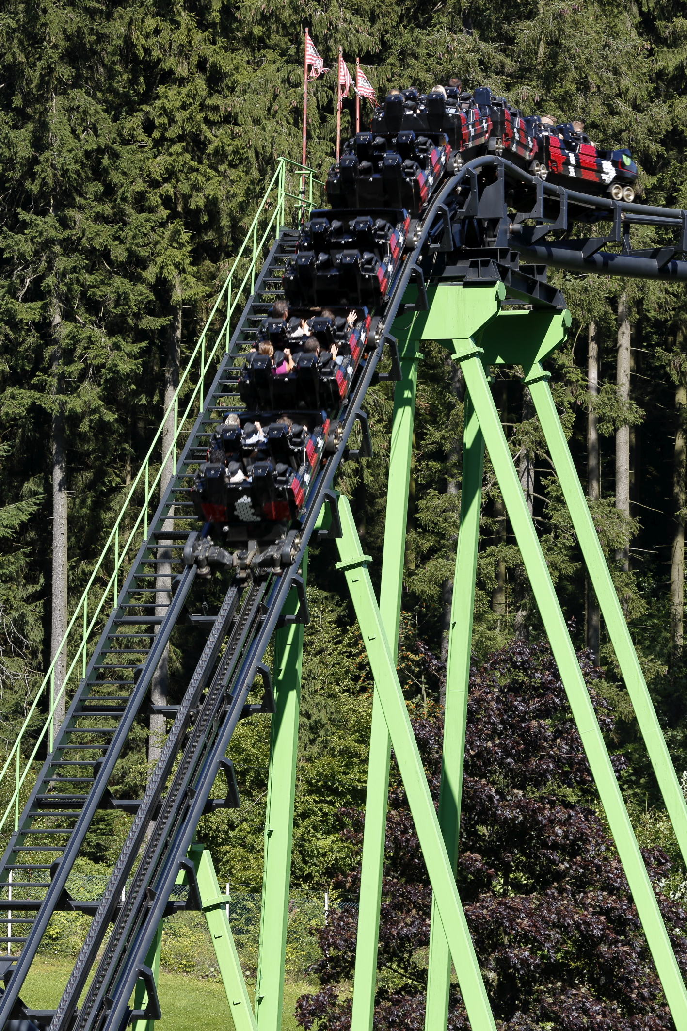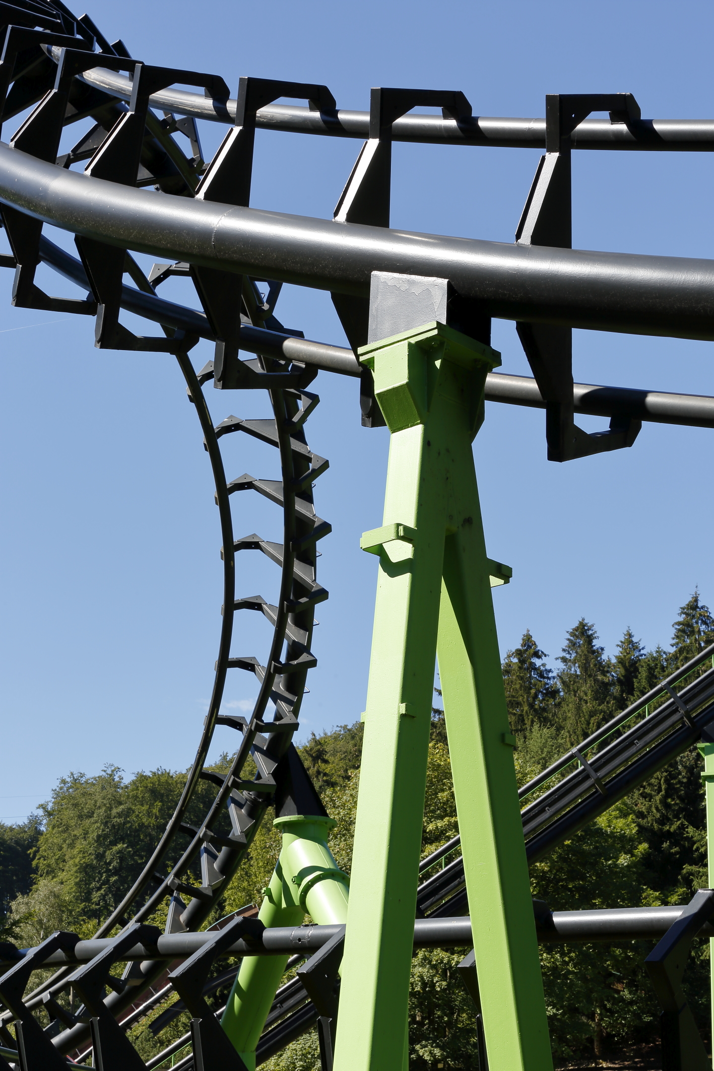 Nachdem die aufwändigen Reinigungsarbeiten abgeschlossen waren, machte sich der Malerfachbetrieb an die neue Lackierung der Achterbahn. Die Stahlstützen der SpeedSnake erhielten dabei einen frischen Anstrich in einem leuchtenden, grünen Farbton. Die früher in Weiß gehaltene Fahrstrecke dagegen glänzt jetzt in elegantem Schwarz. Bei dem Projekt setzte Andreas Stempel auf den Capalac Dickschichtlack, einen Metallschutzlack von Caparol. „Ich halte die Caparol-Produkte für zuverlässig und qualitätvoll: Wenn man sie fachgerecht anwendet, kann man sich voll und ganz auf sie verlassen“, erklärt er. „Wichtig war uns außerdem eine schnelle Lieferzeit. Immerhin muss man erst mal jemanden finden, der während der Wintermonate in kürzester Zeit so eine große Menge an Produkten beschaffen kann.“ Innerhalb von einer Woche erhielt Stempel eine erste, große Lieferung von Caparol. Weitere Gebinde orderte er nach und nach hinzu.