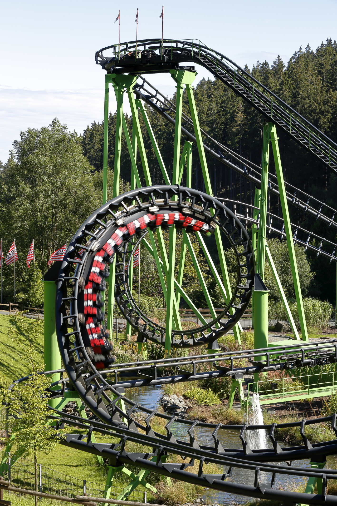 (pressebox) (Ober-Ramstadt, 07.10.2016) Die Idylle trügt. Gerade noch blicken die Besucher des Freizeitparks FORT FUN in Bestwig (Sauerland) in wunderschöne, grüne Natur – doch dann geht die wilde Fahrt mit der Achterbahn SpeedSnake auch schon los: Mit bis zu 60 Kilometern pro Stunde rauschen die sieben Wagen durch das Fahrgeschäft, ein rasantes Auf und Ab gehört dabei genauso zum Programm wie zwei haarsträubende Loopings.