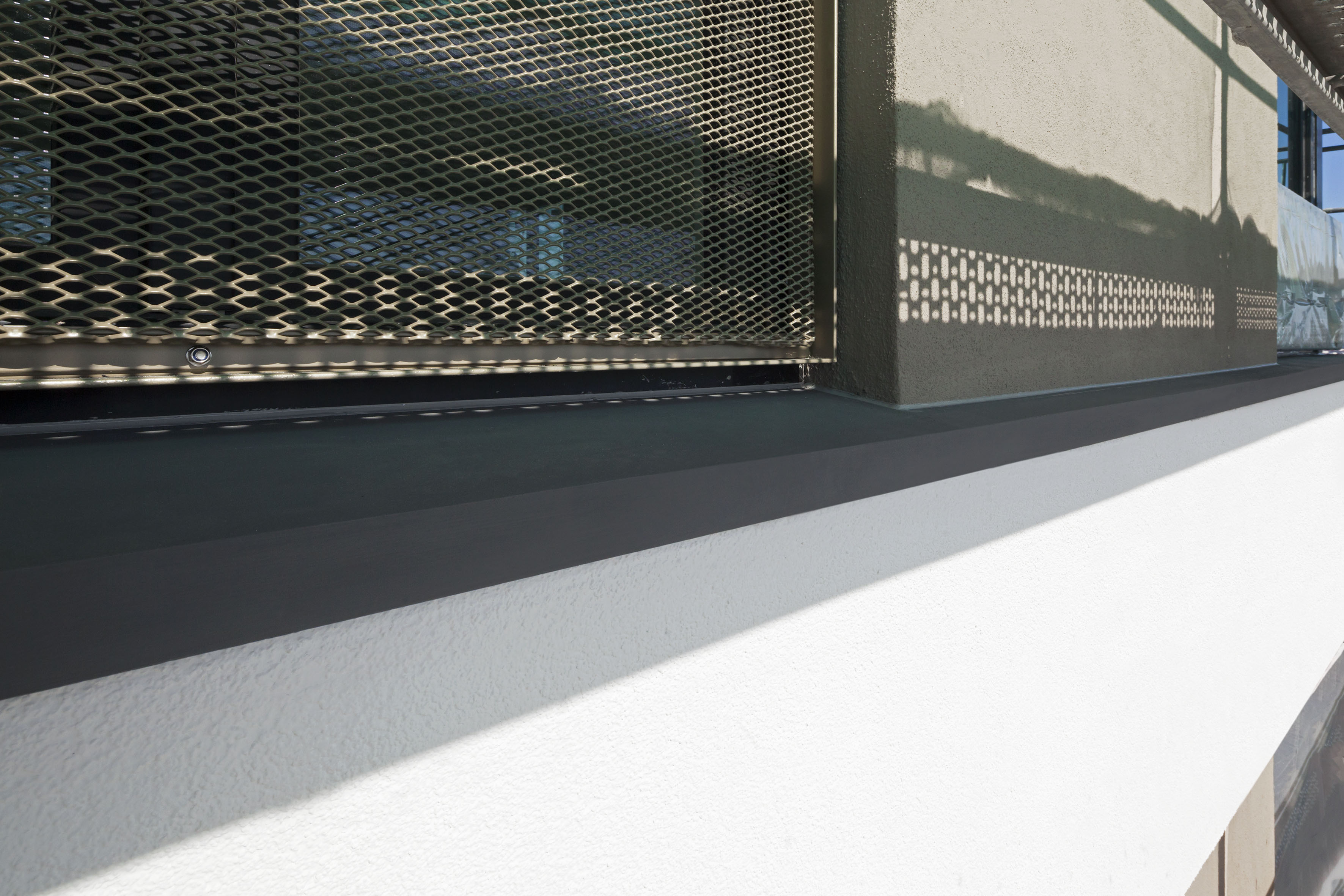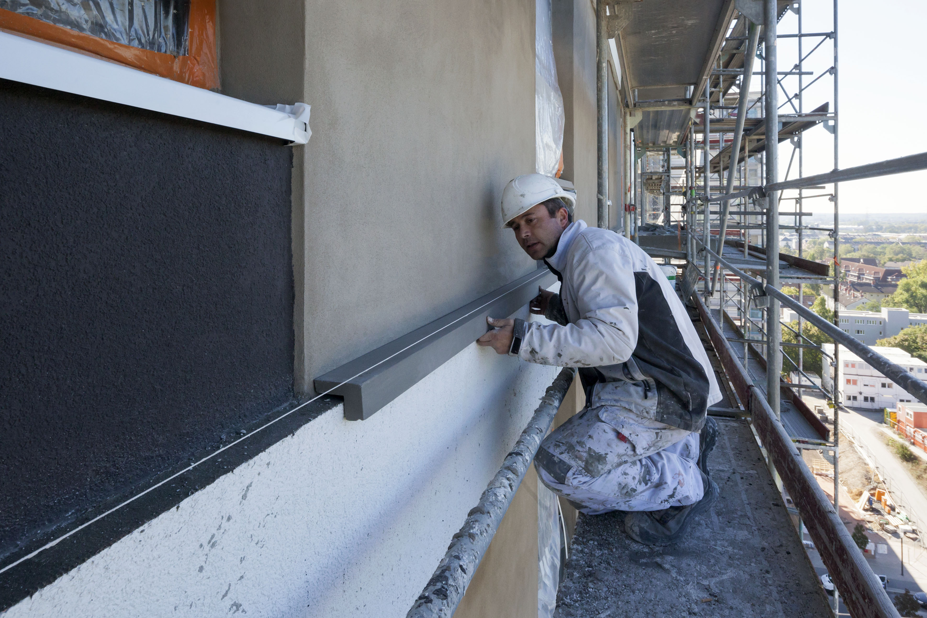 Neben den Dämmsystemen samt Deckputzen und Beschichtung lieferte Caparol auch knapp 4.000 Meter Fassadenprofile aus der Capapor-Familie. Sie bilden den oberen und unteren Abschluss der hellen, horizontalen Fassadenbänder, treten als filigrane Linien auf und verwandeln sich im Bereich der Balkone und Loggien in tiefe Gesimse, wo sonst traditionelle Verblechungen für Wetterschutz sorgen, aber das konsistente optische Bild unterbrochen hätten. Die vor Ort dunkel beschichteten, leichten Profile bieten eine dezidierte Wasserführung: oben per Gefälle und unten per Tropfkante.
